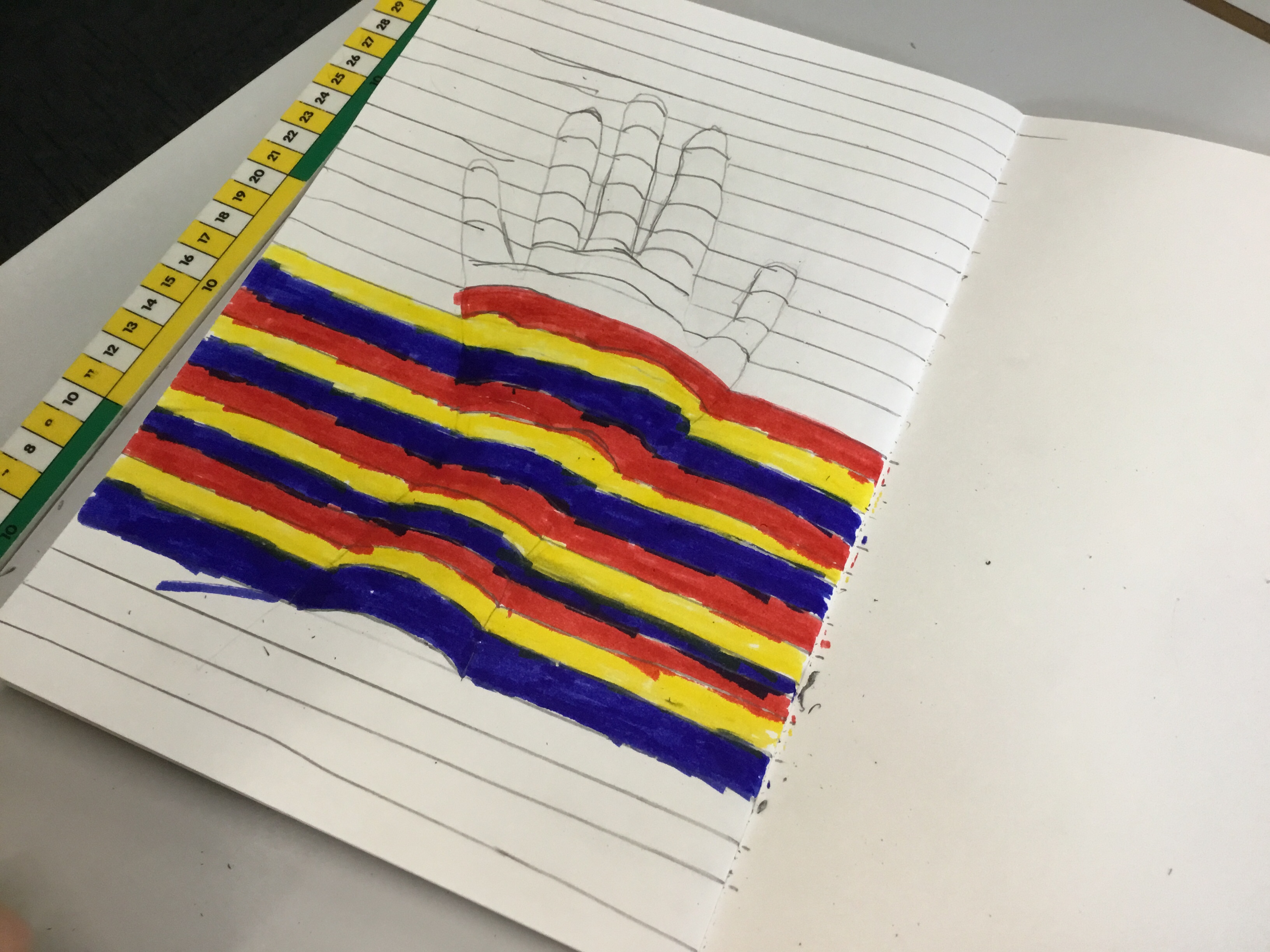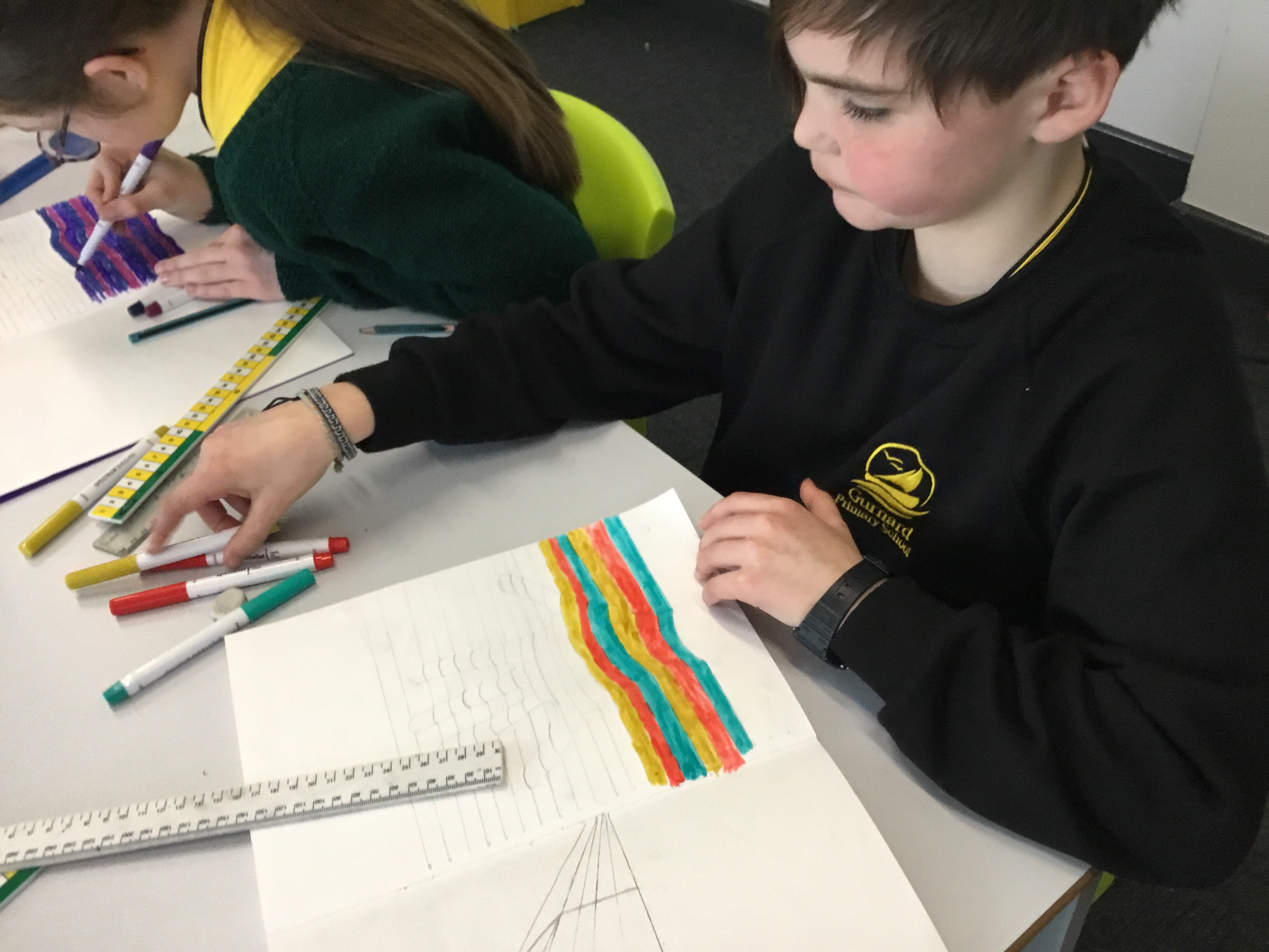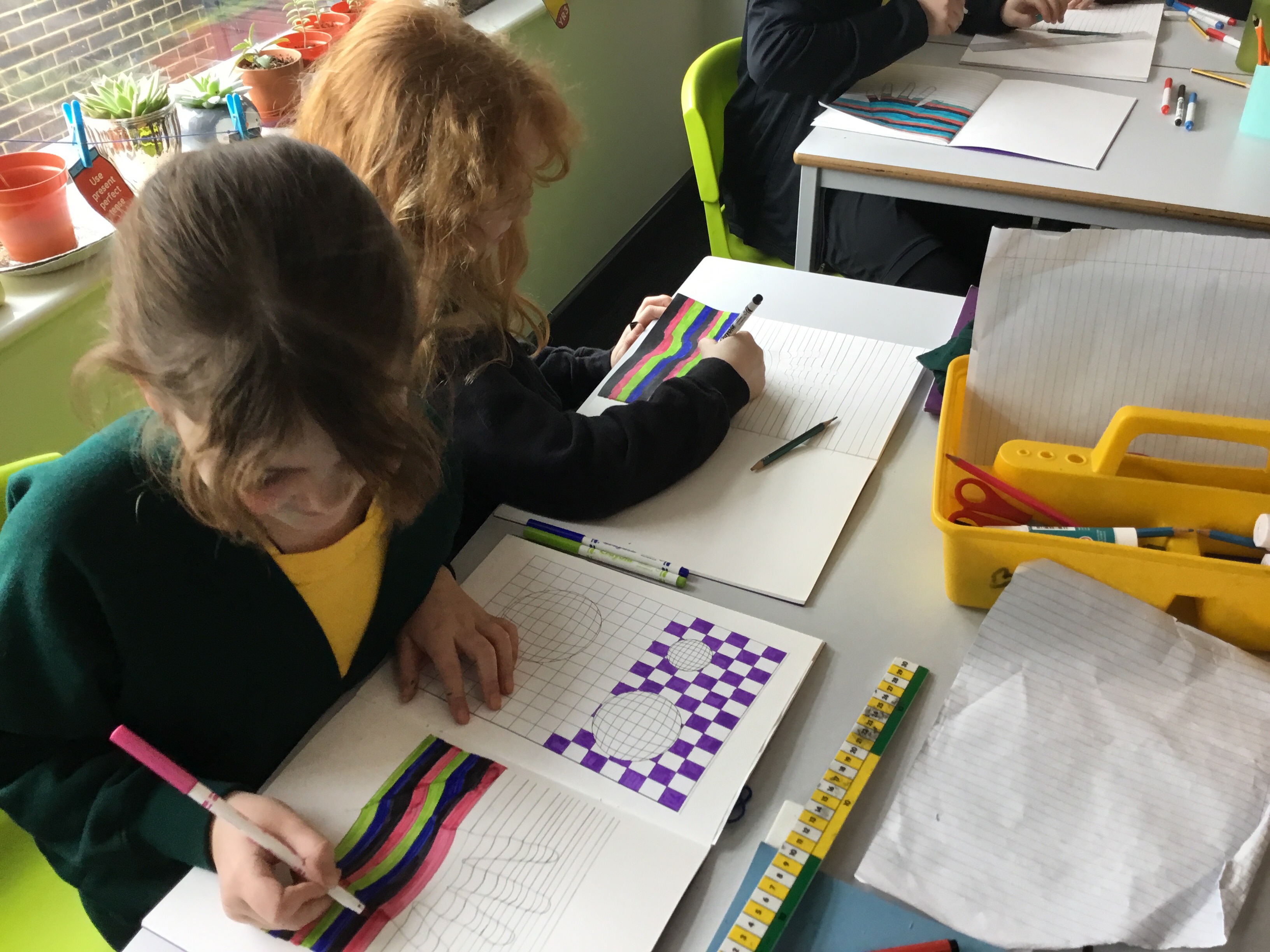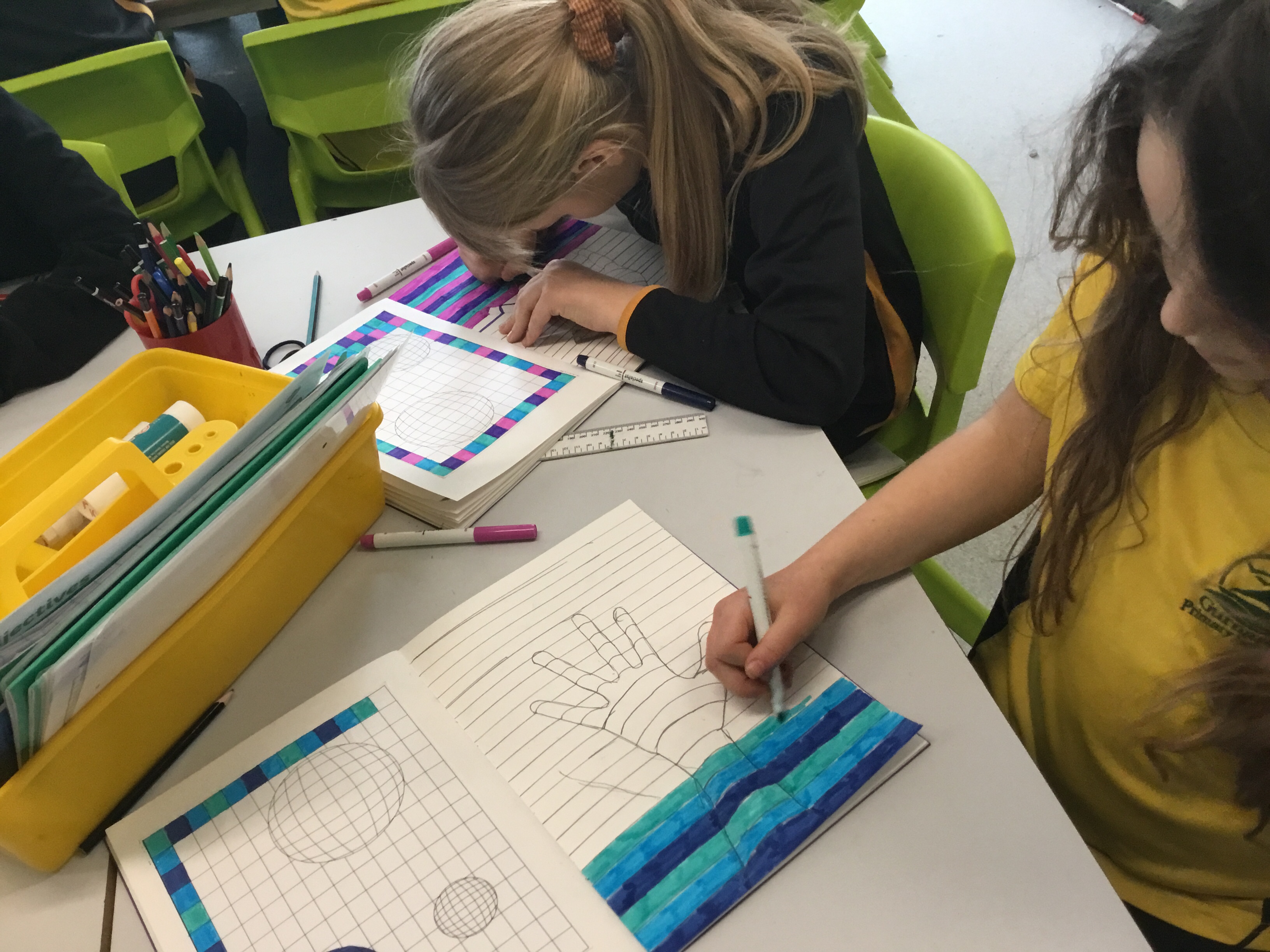 Year 5 contained with creating their own illusion artwork, but this time they traced around their hand, drew in lines and added colour to create their illusions. They are starting to take shape nicely.