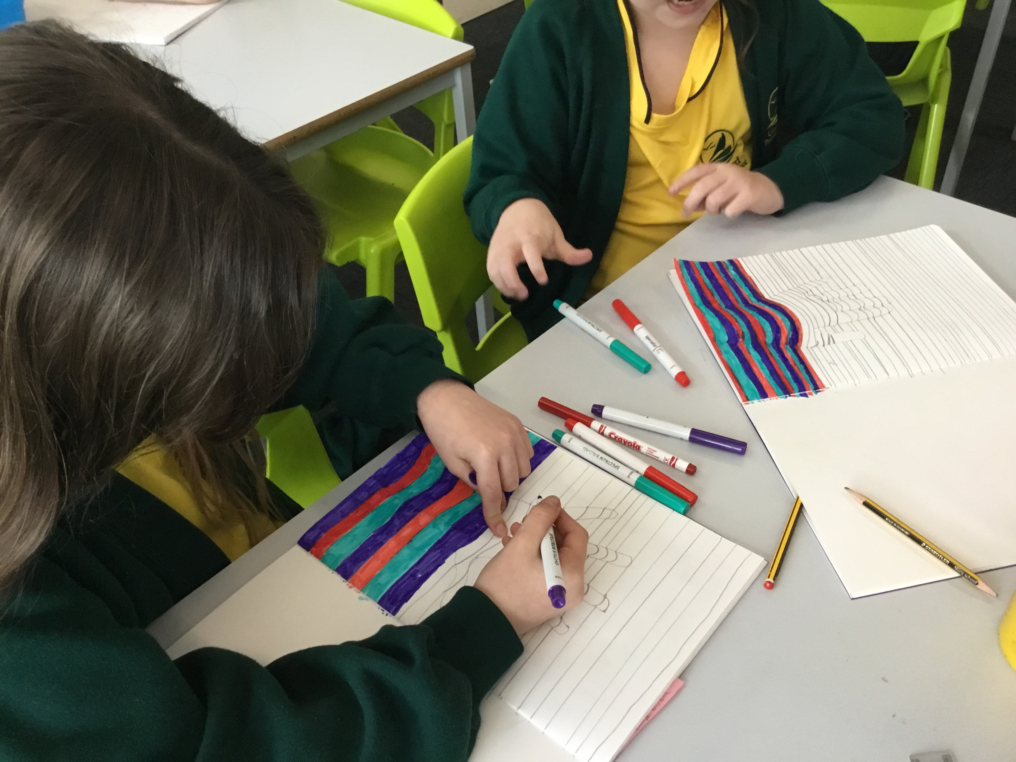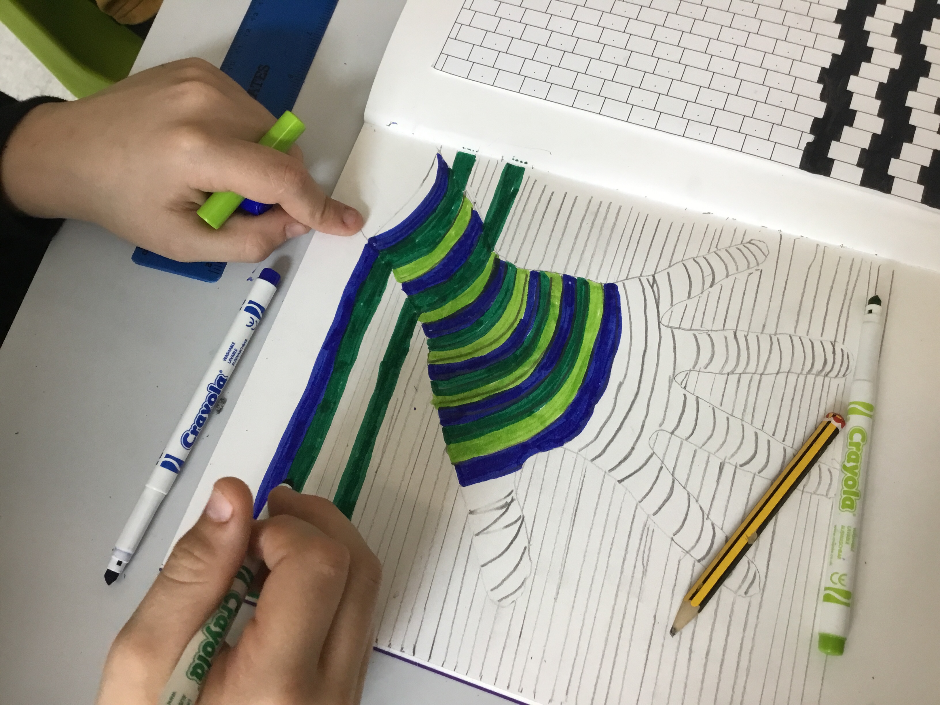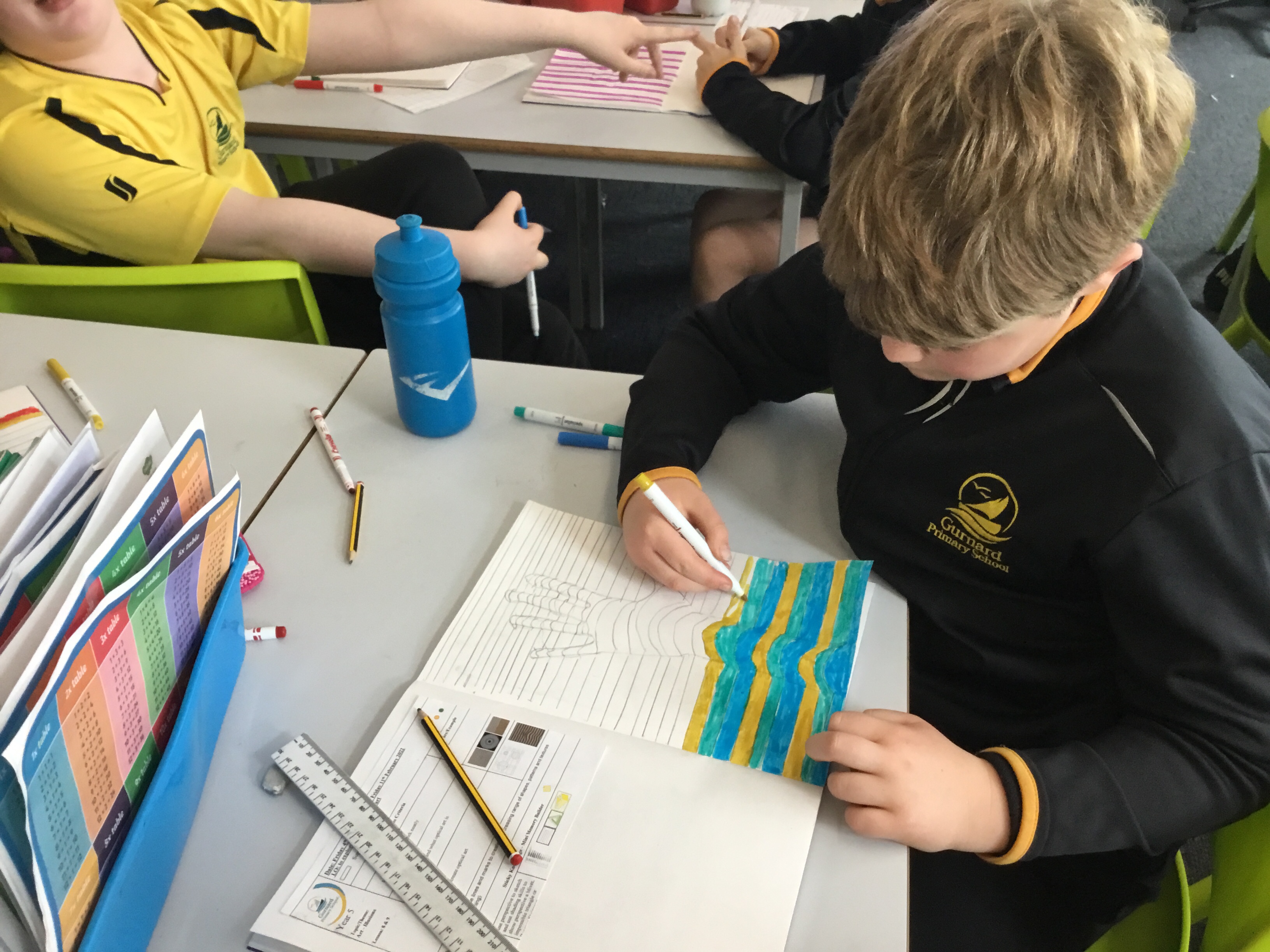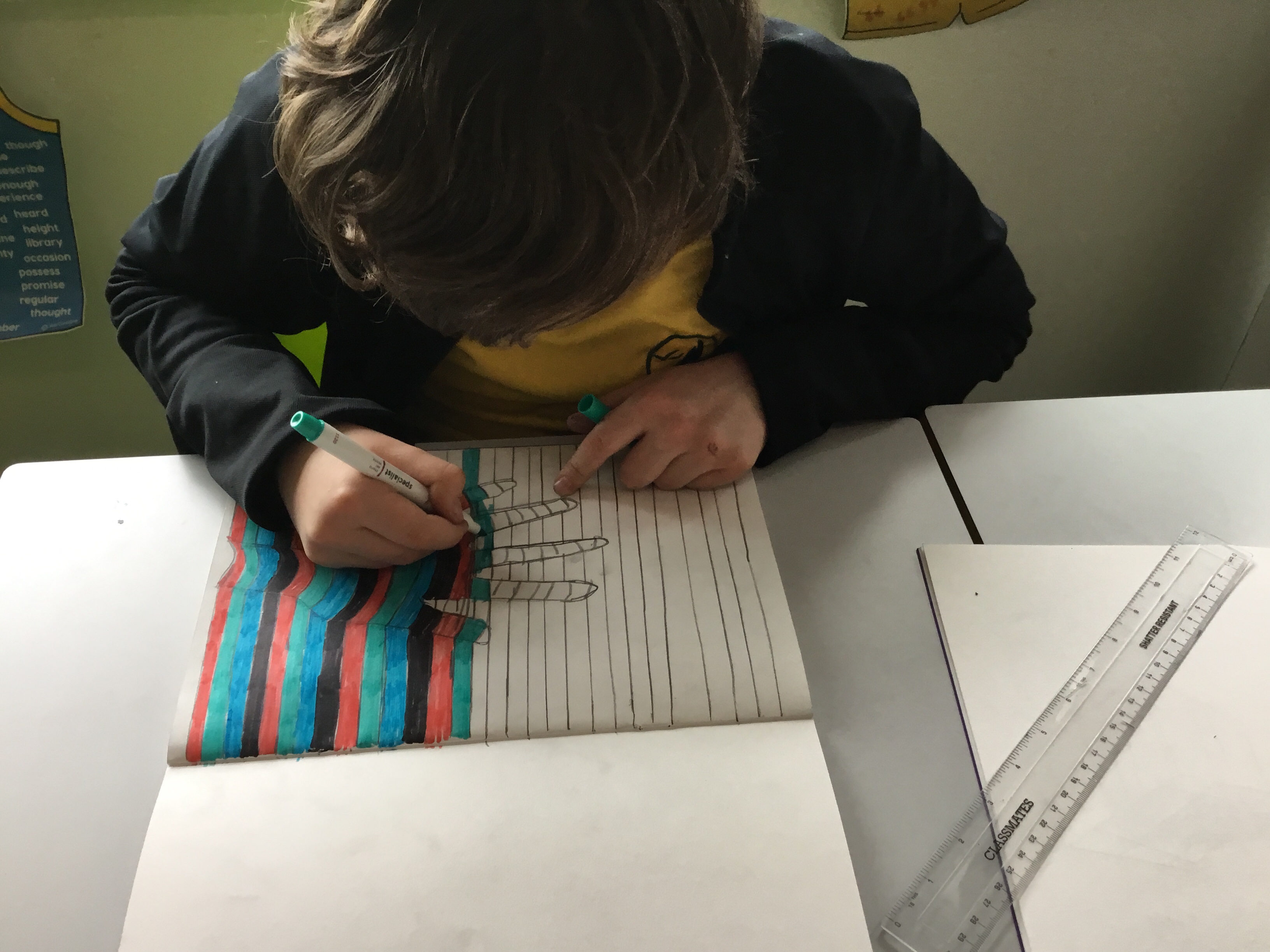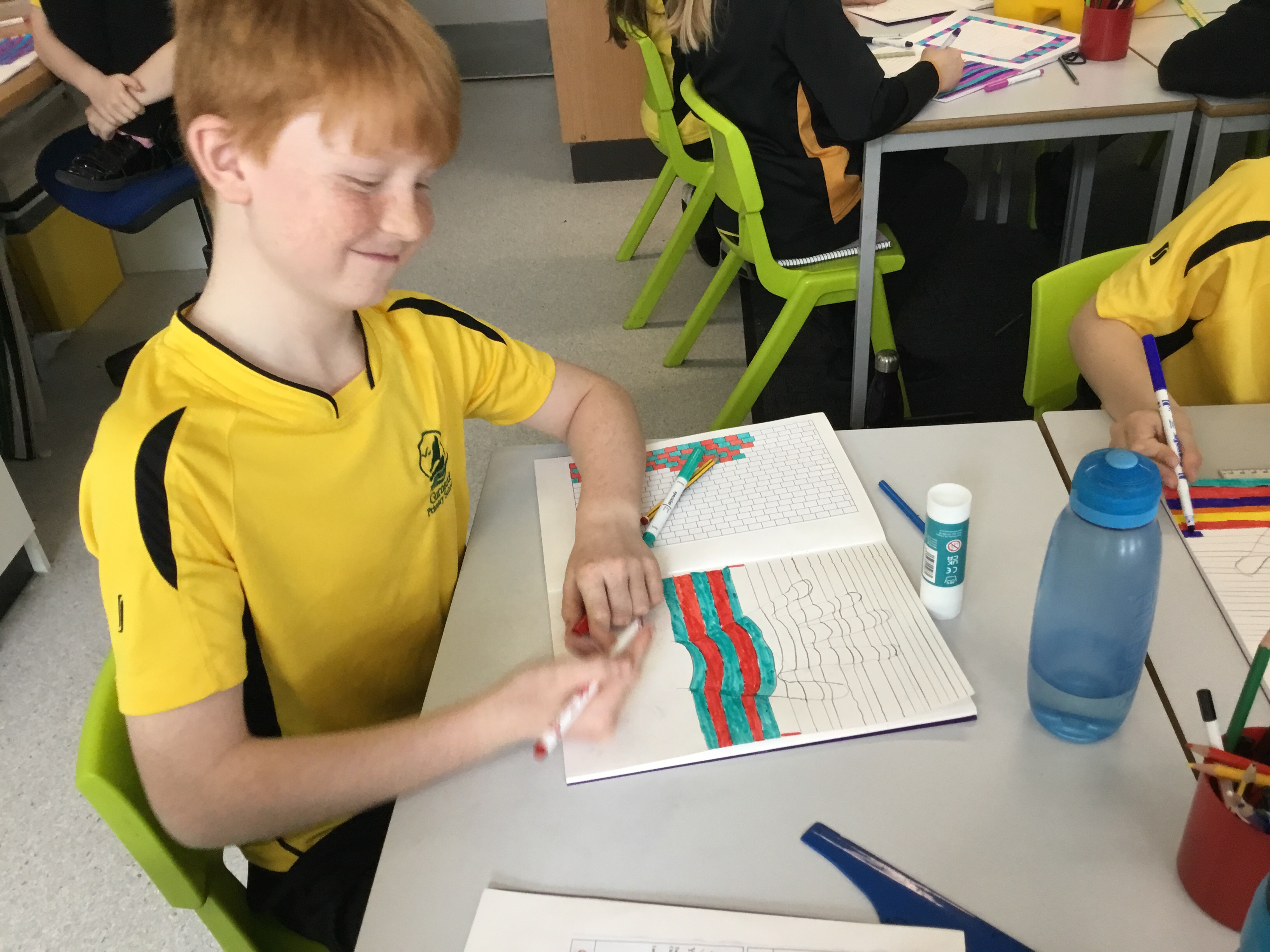 Year 5 contained with creating their own illusion artwork, but this time they traced around their hand, drew in lines and added colour to create their illusions. They are starting to take shape nicely.