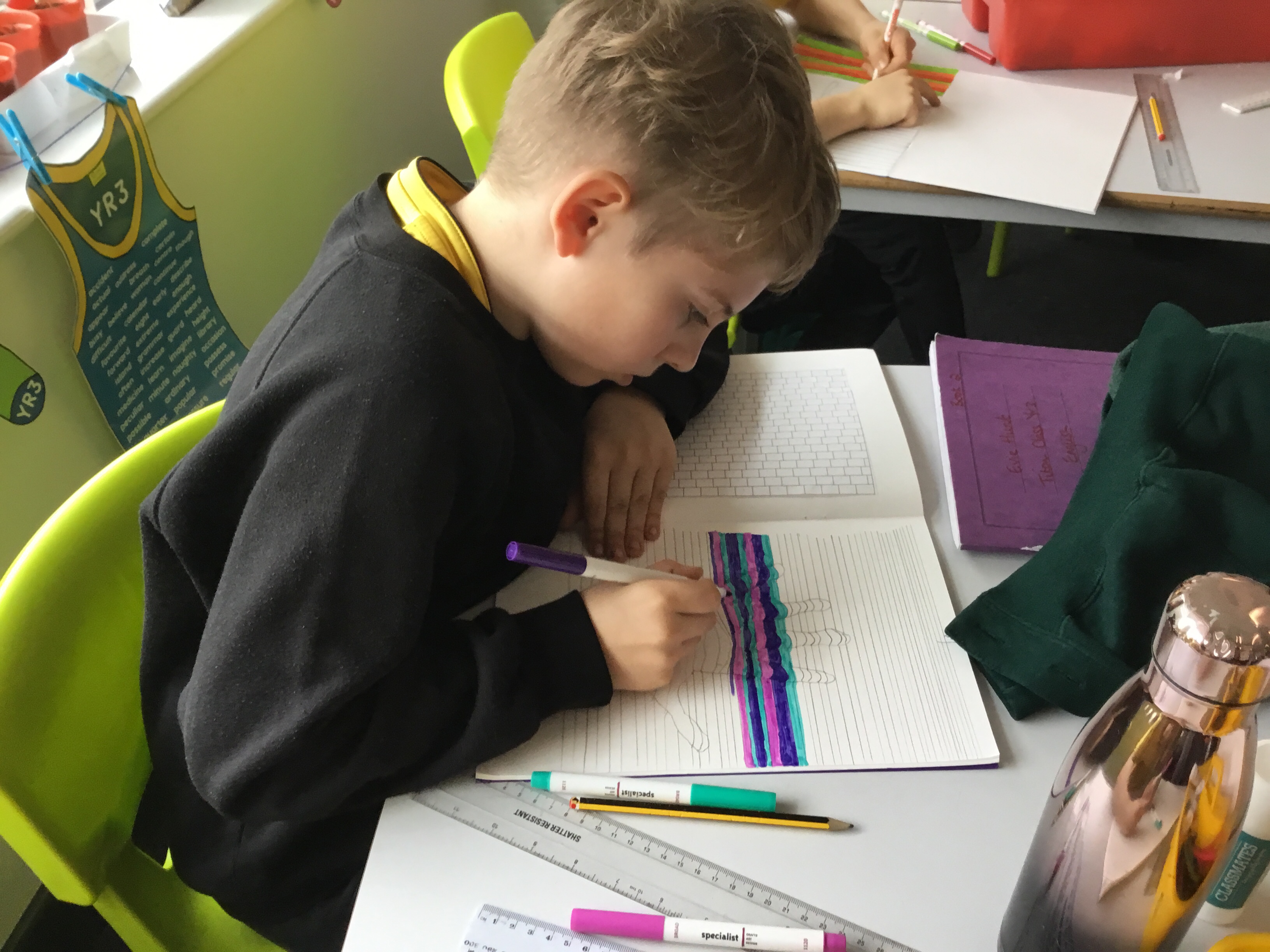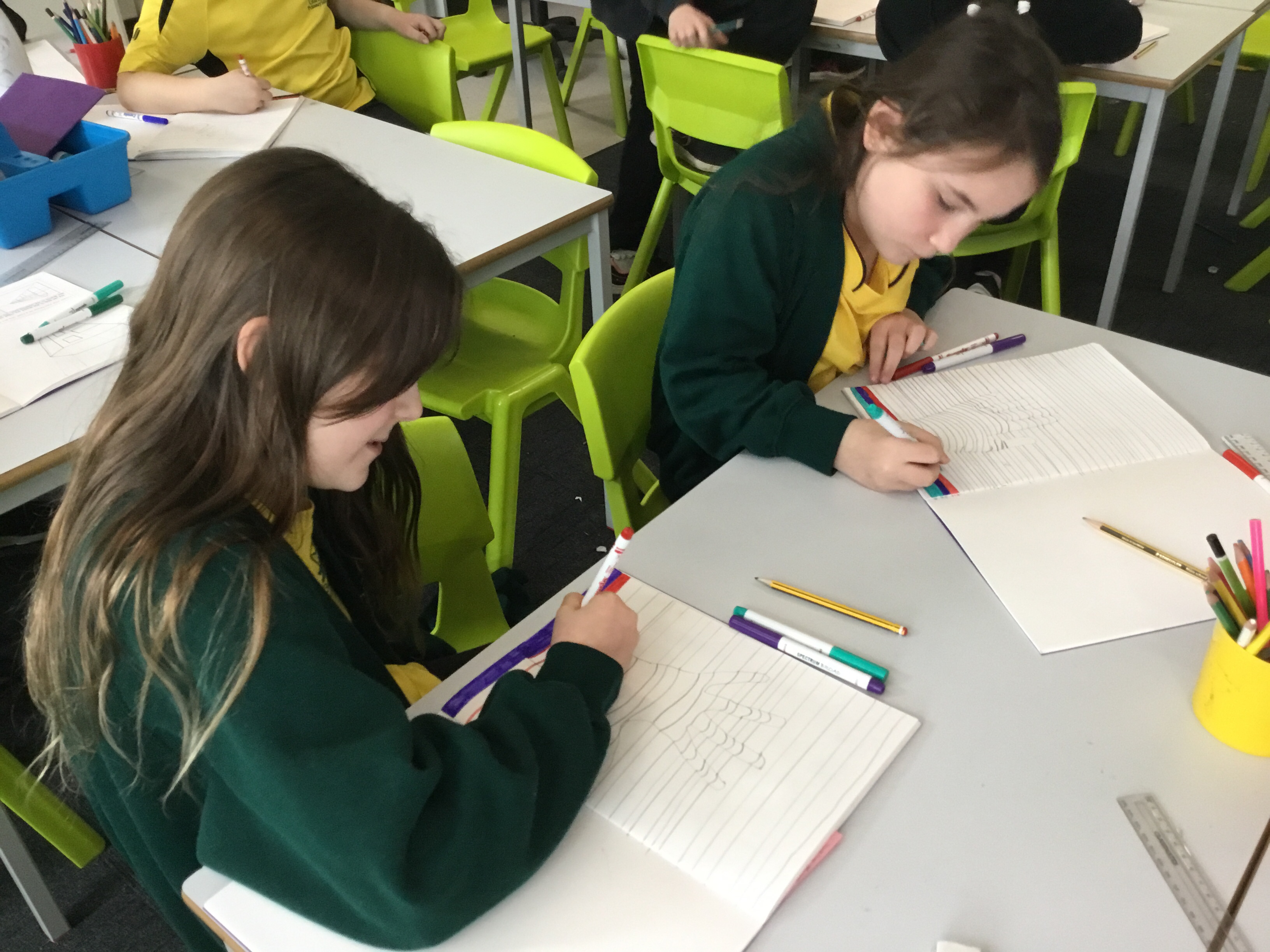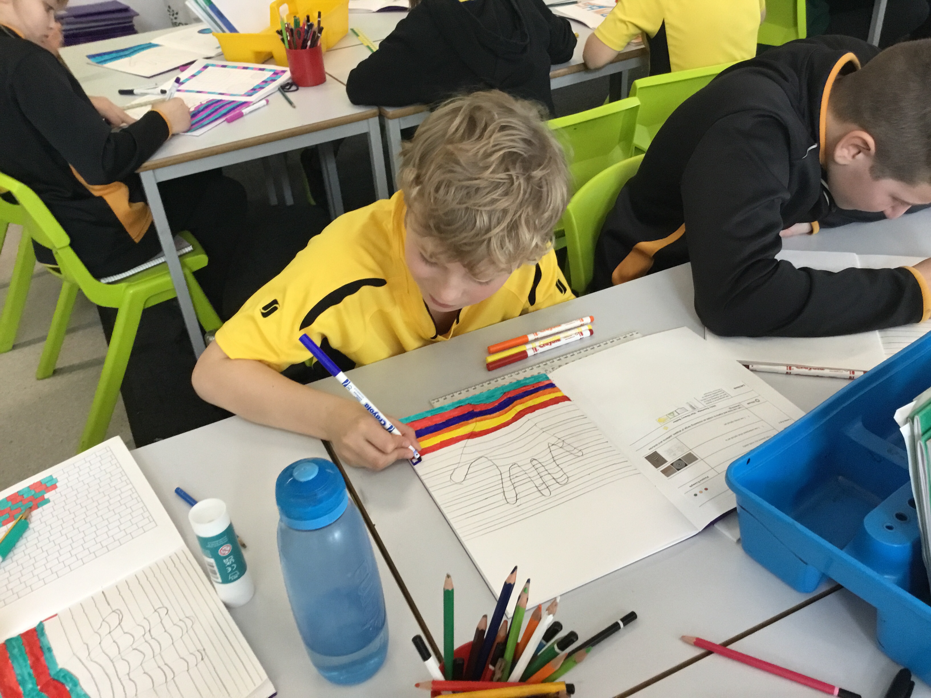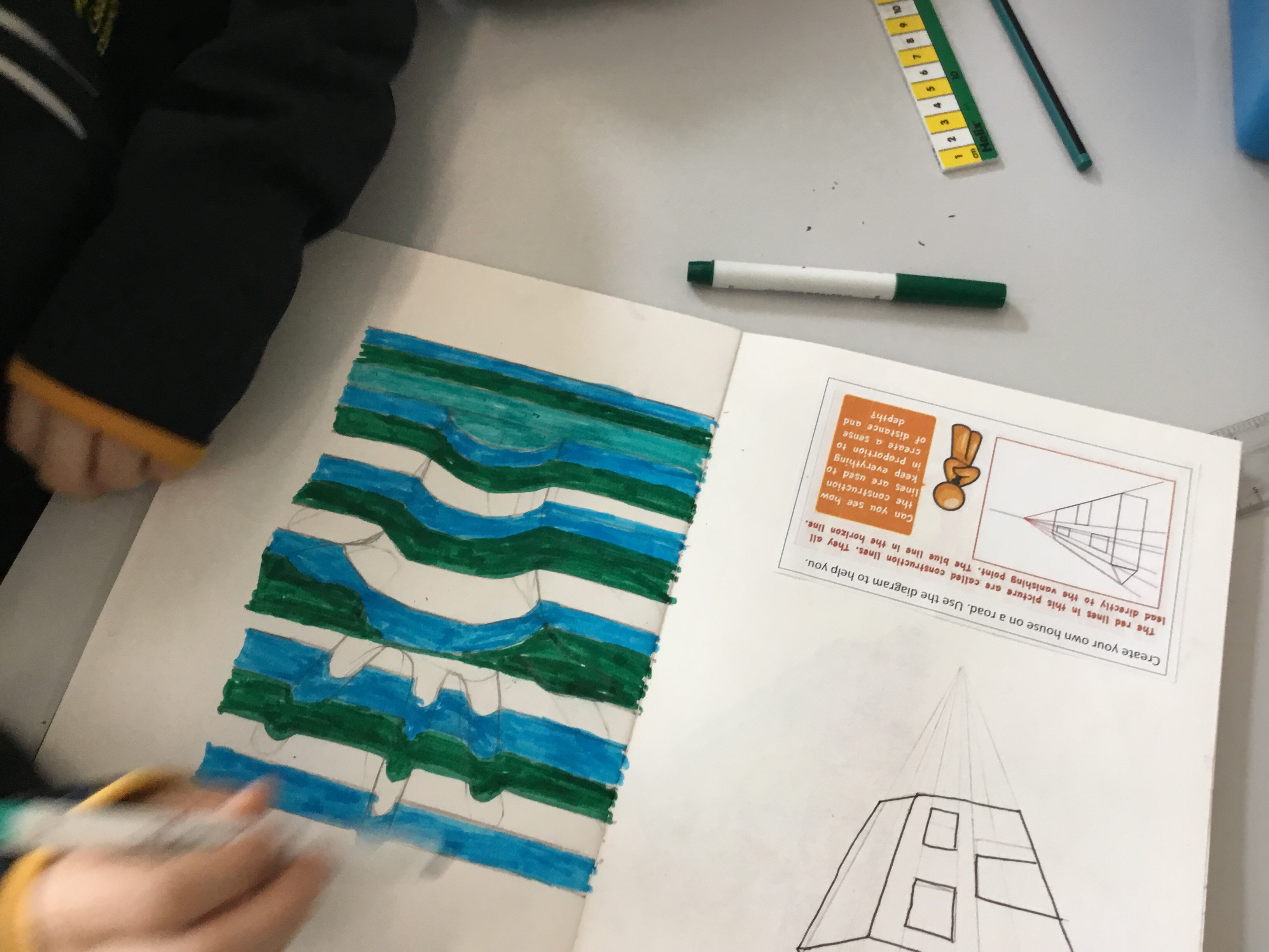 Year 5 contained with creating their own illusion artwork, but this time they traced around their hand, drew in lines and added colour to create their illusions. They are starting to take shape nicely.