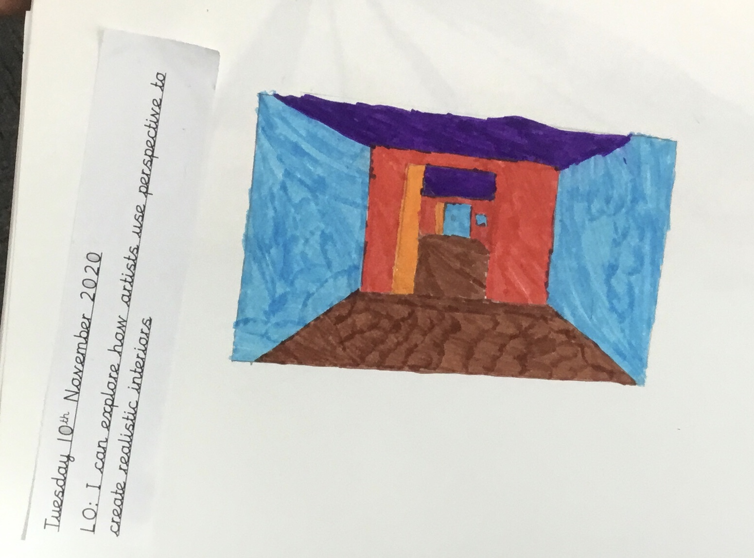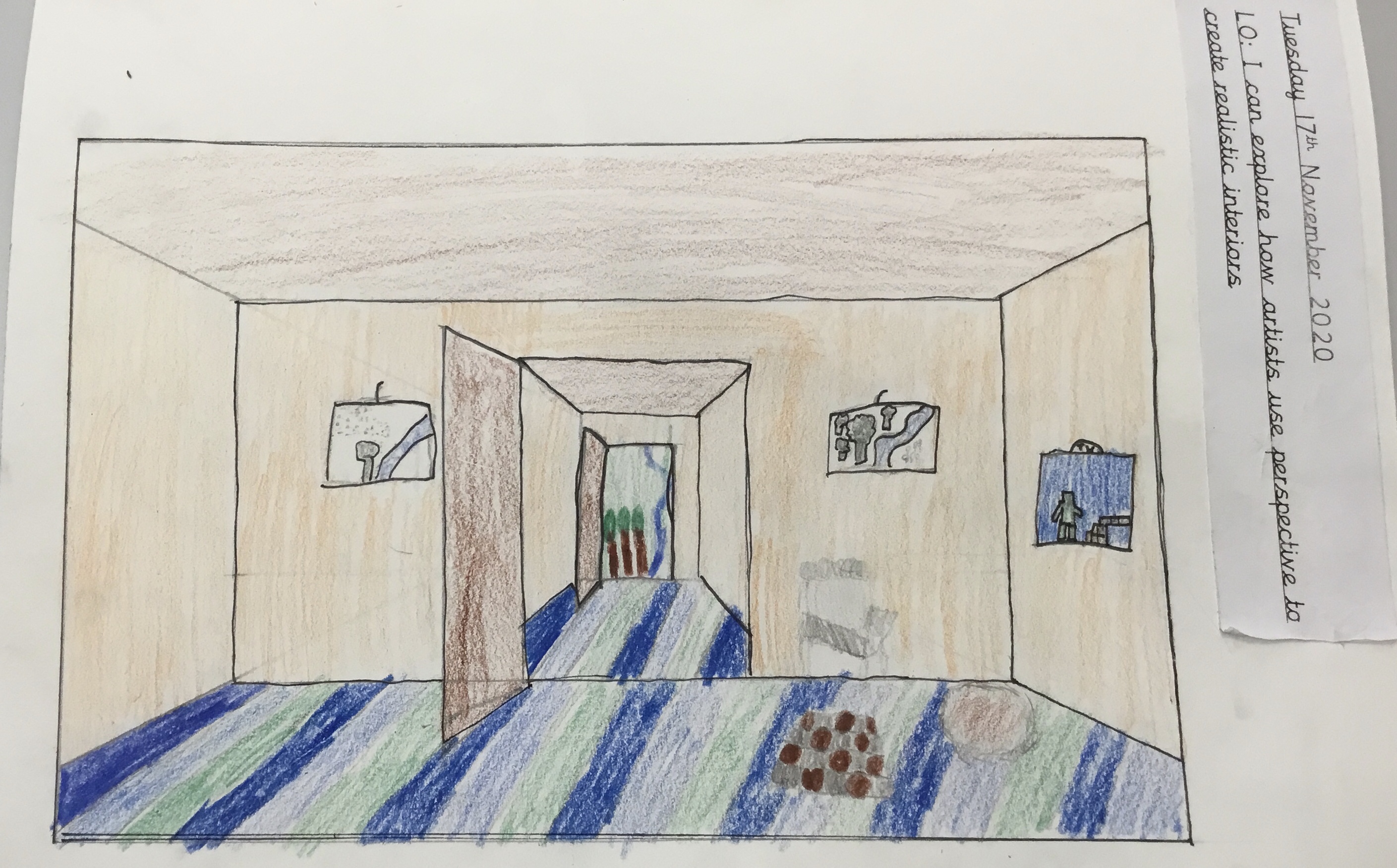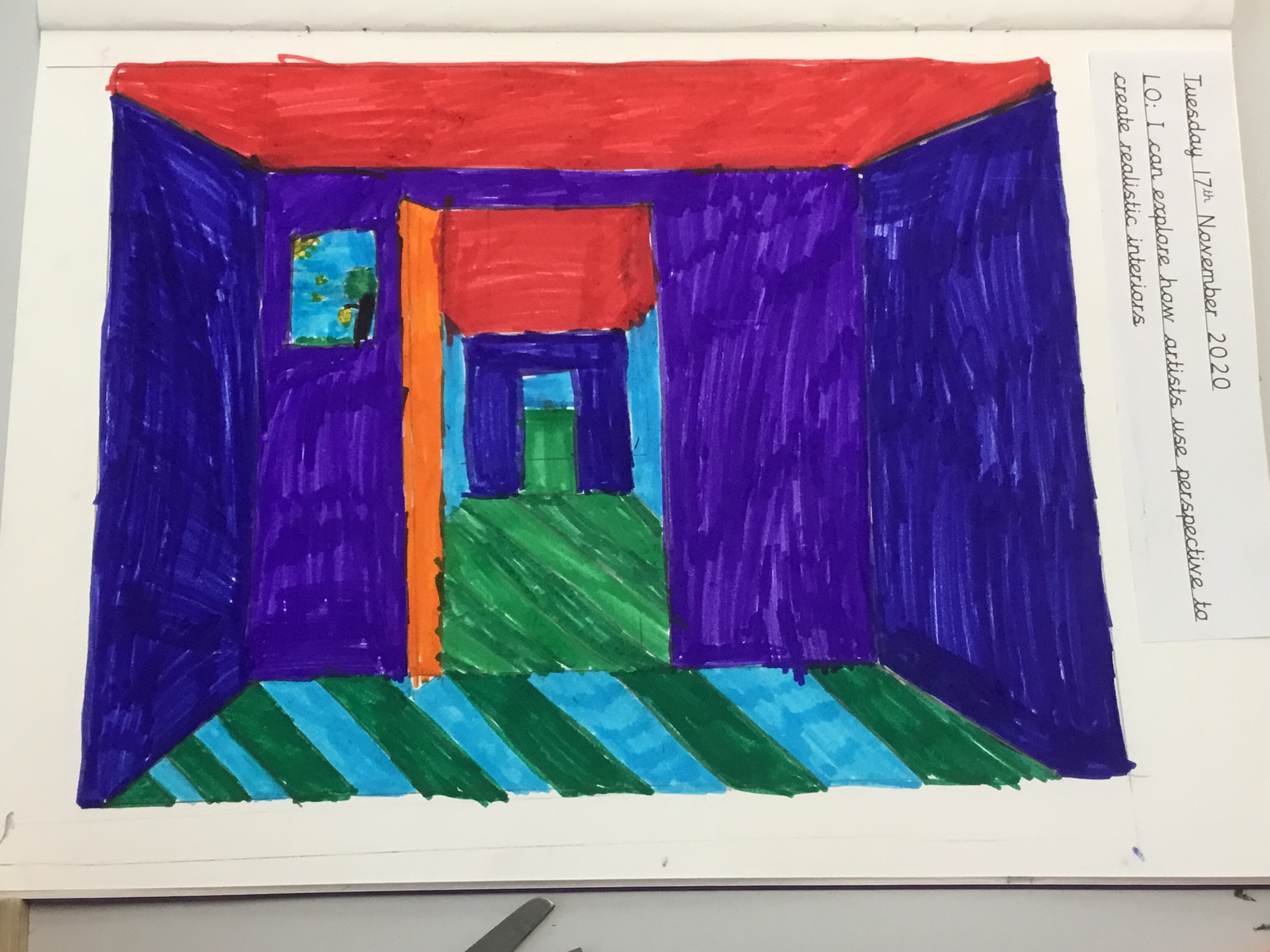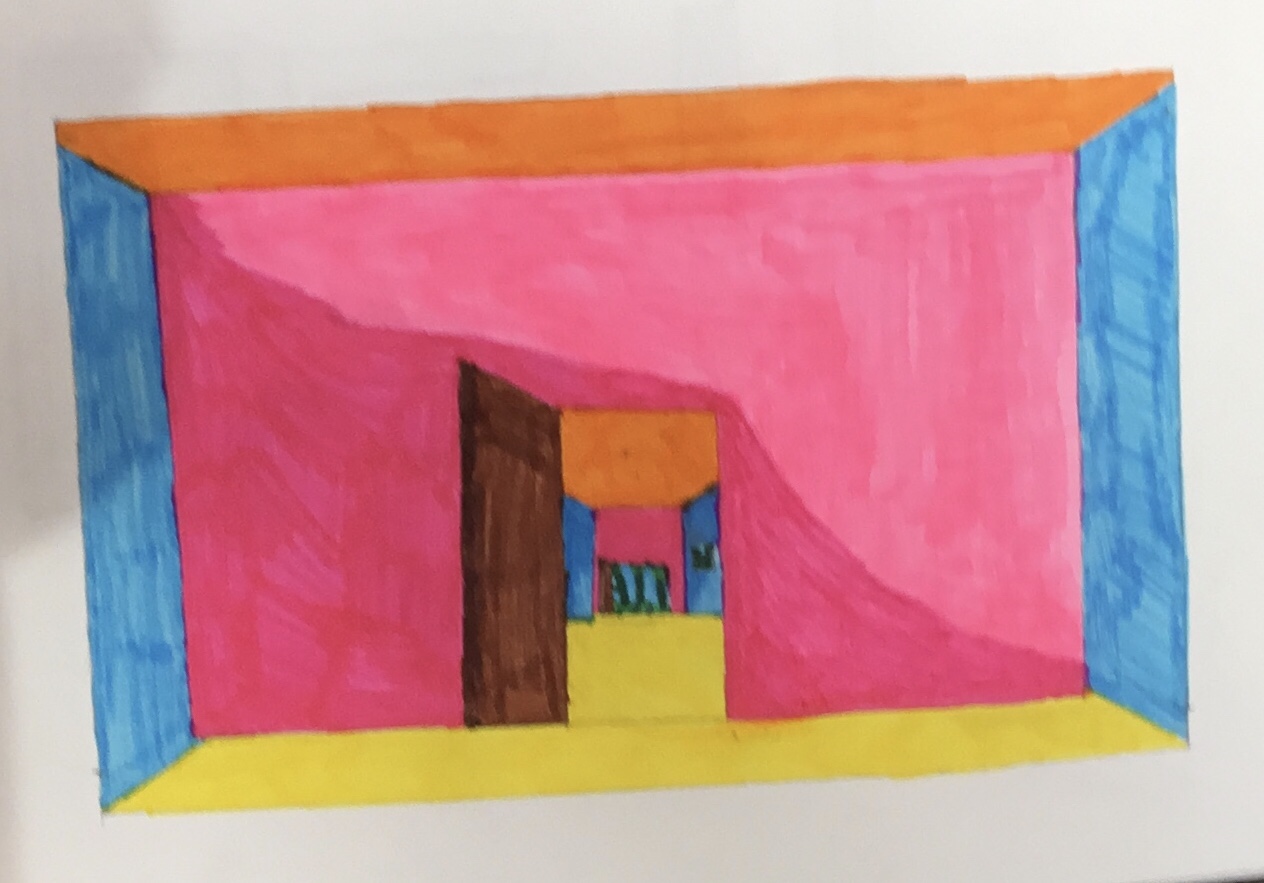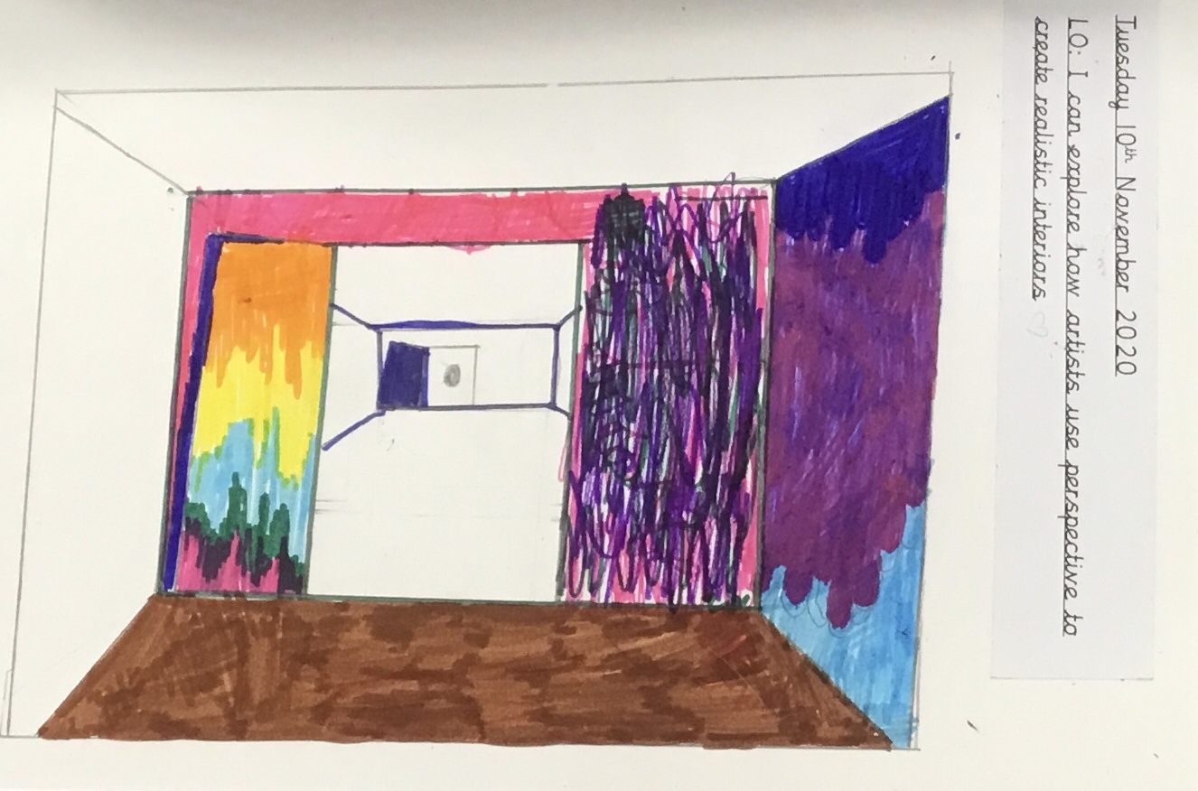 Year 5 explored how artists use perspective to create a realistic interior. They used a vanishing point and rectangles to create the shape of the room, then they added in a door. After that they create another rectangle and door to create the illusion of walking through a few rooms to the outside. They finished off their interior by adding colour.