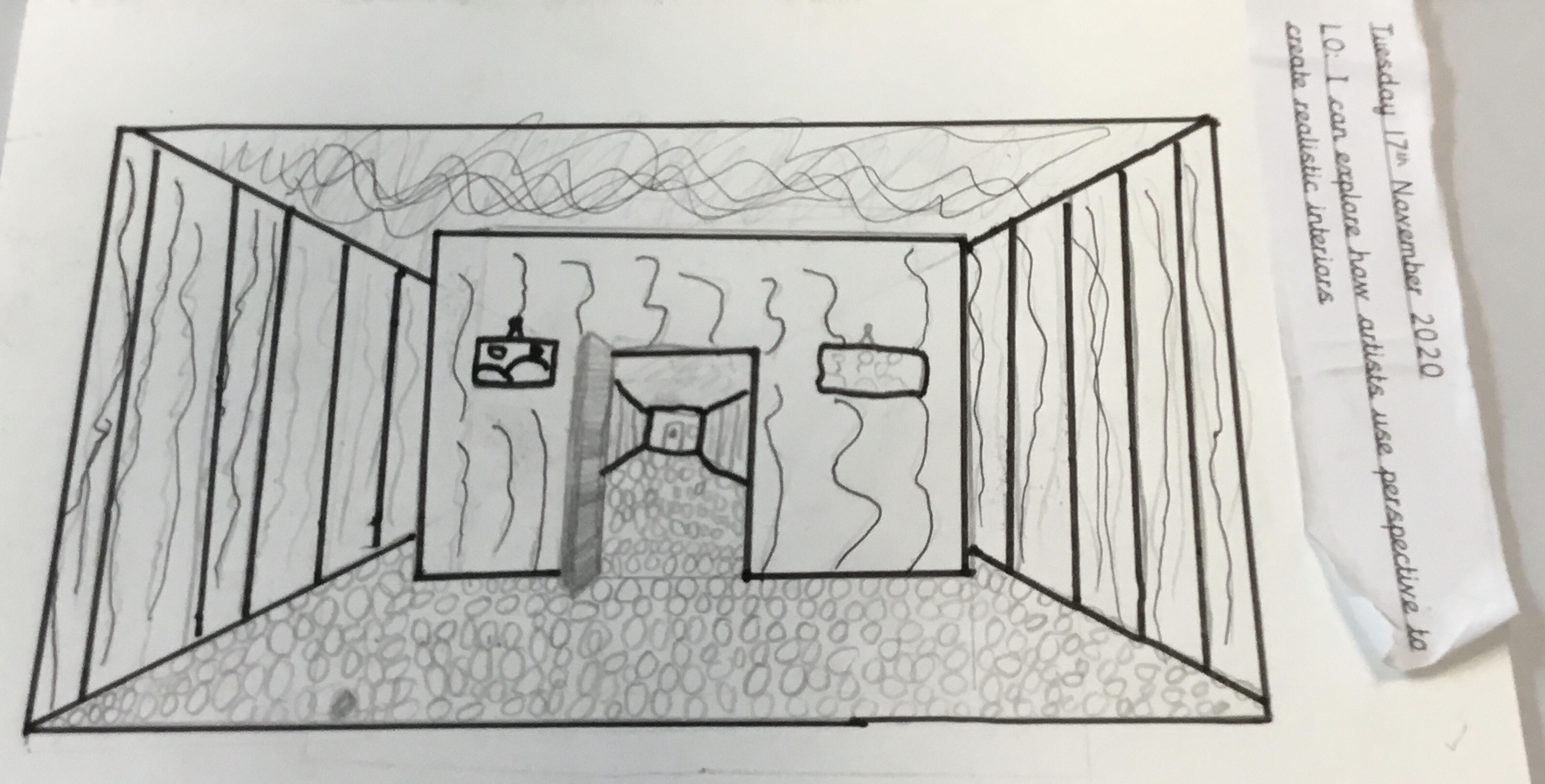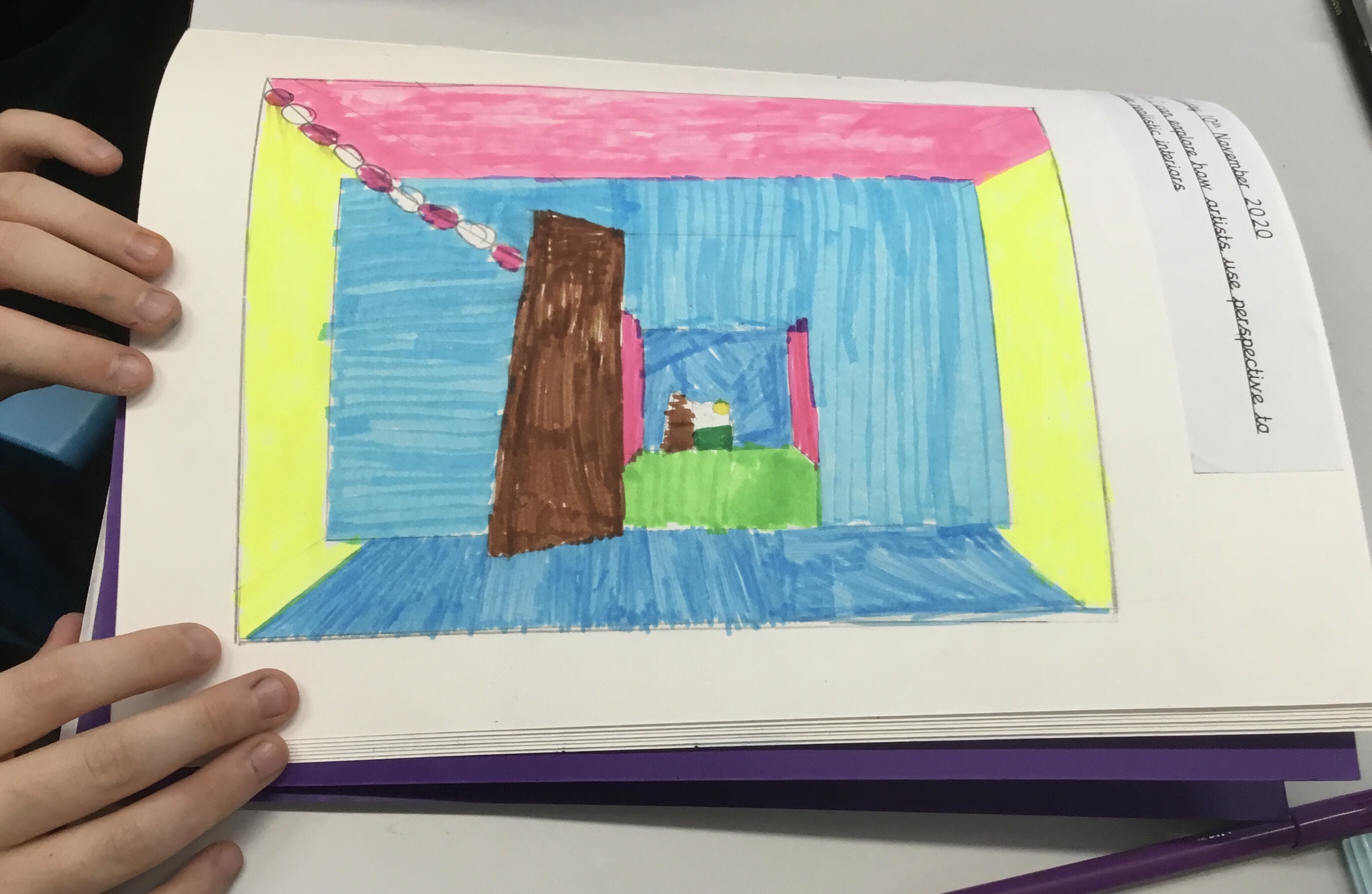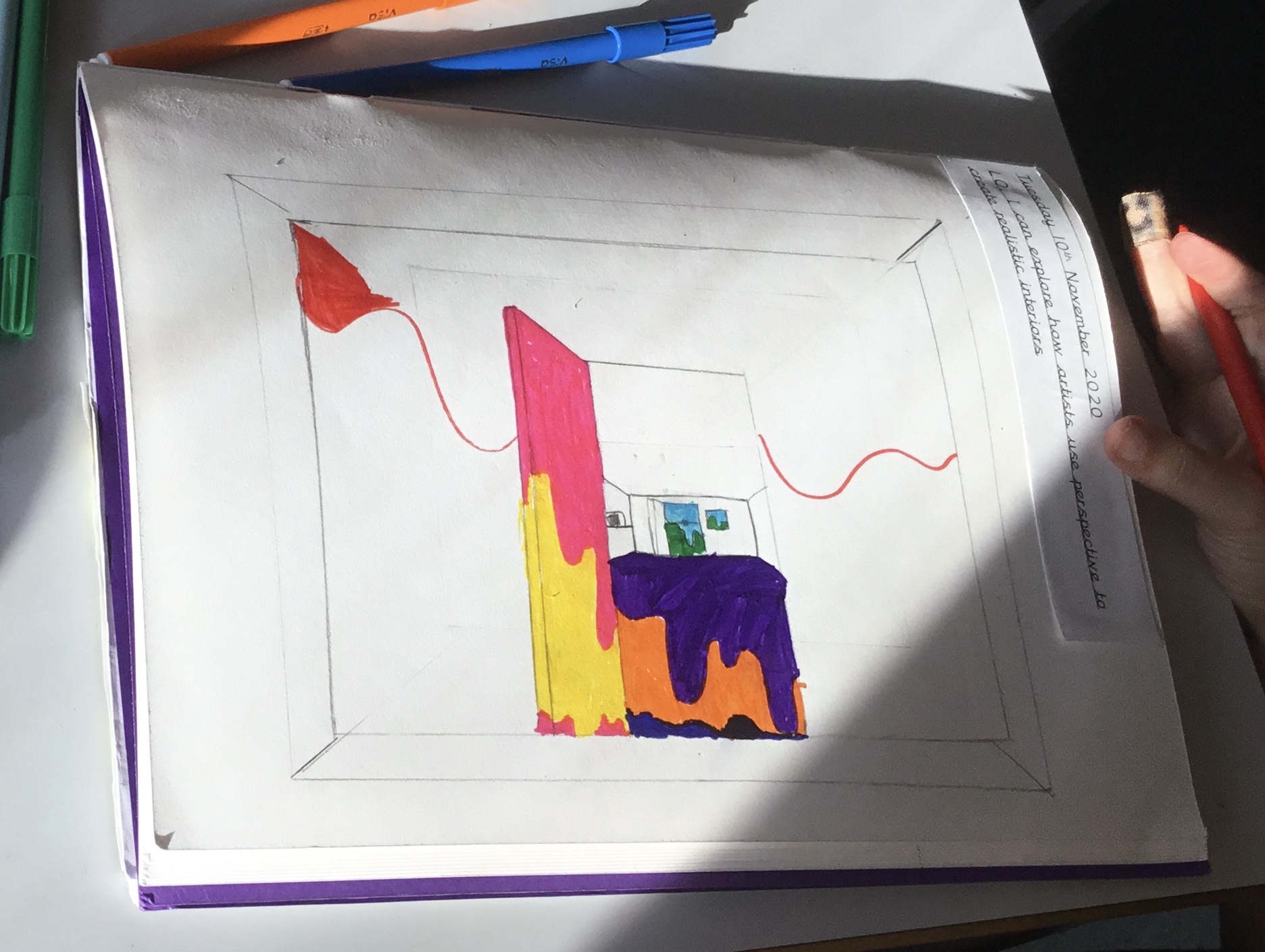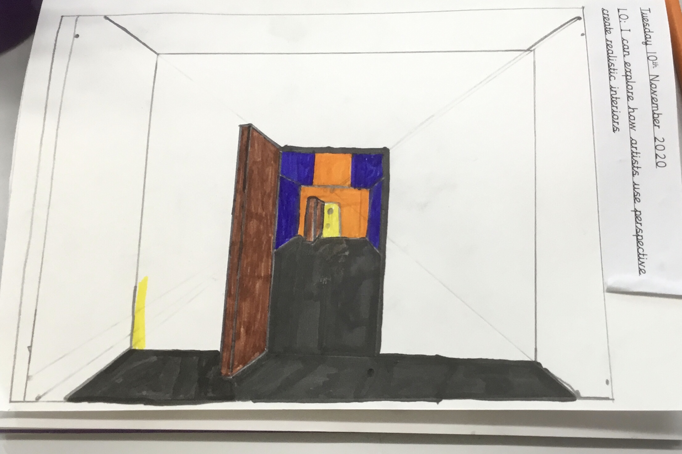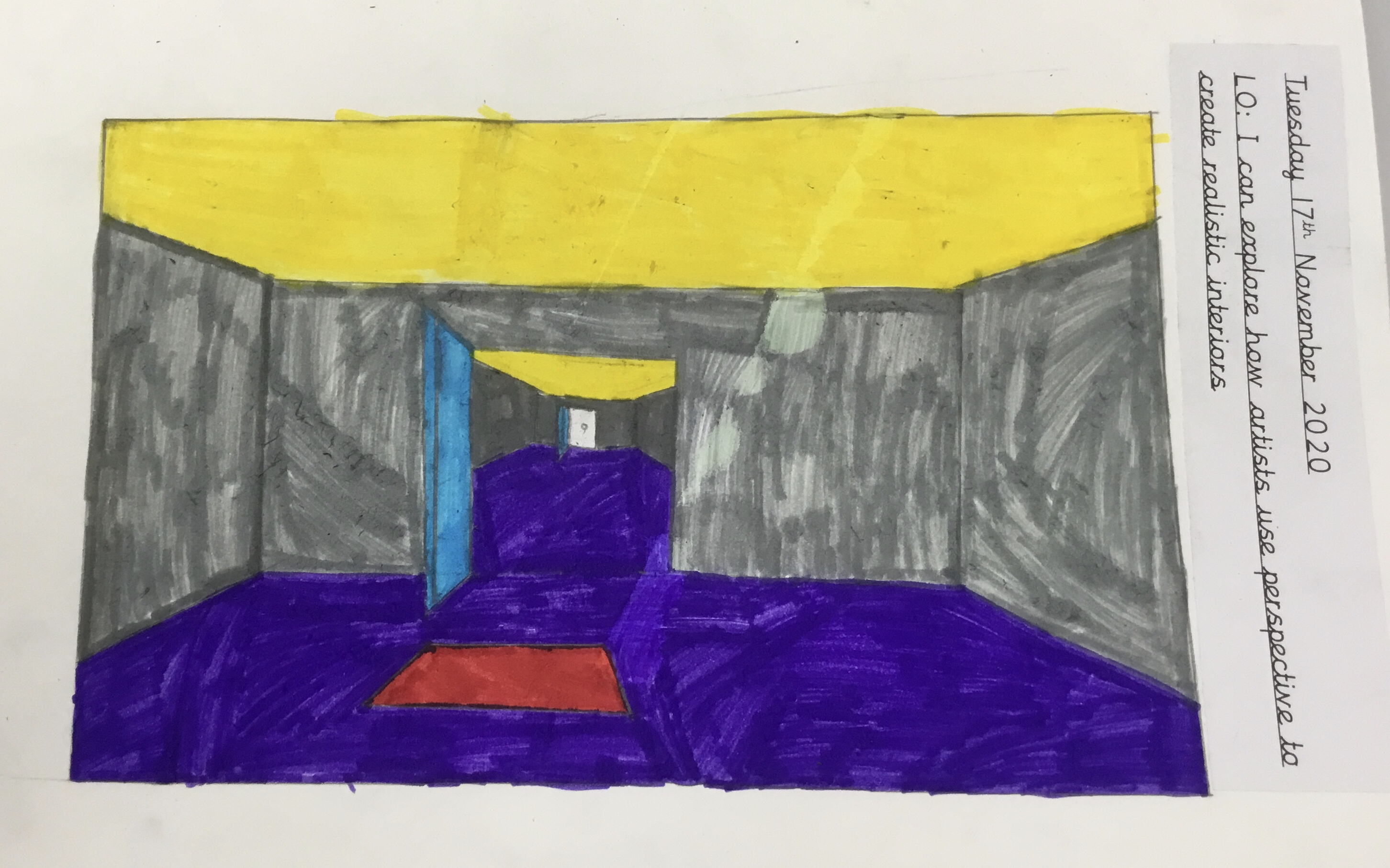 Year 5 explored how artists use perspective to create a realistic interior. They used a vanishing point and rectangles to create the shape of the room, then they added in a door. After that they create another rectangle and door to create the illusion of walking through a few rooms to the outside. They finished off their interior by adding colour.