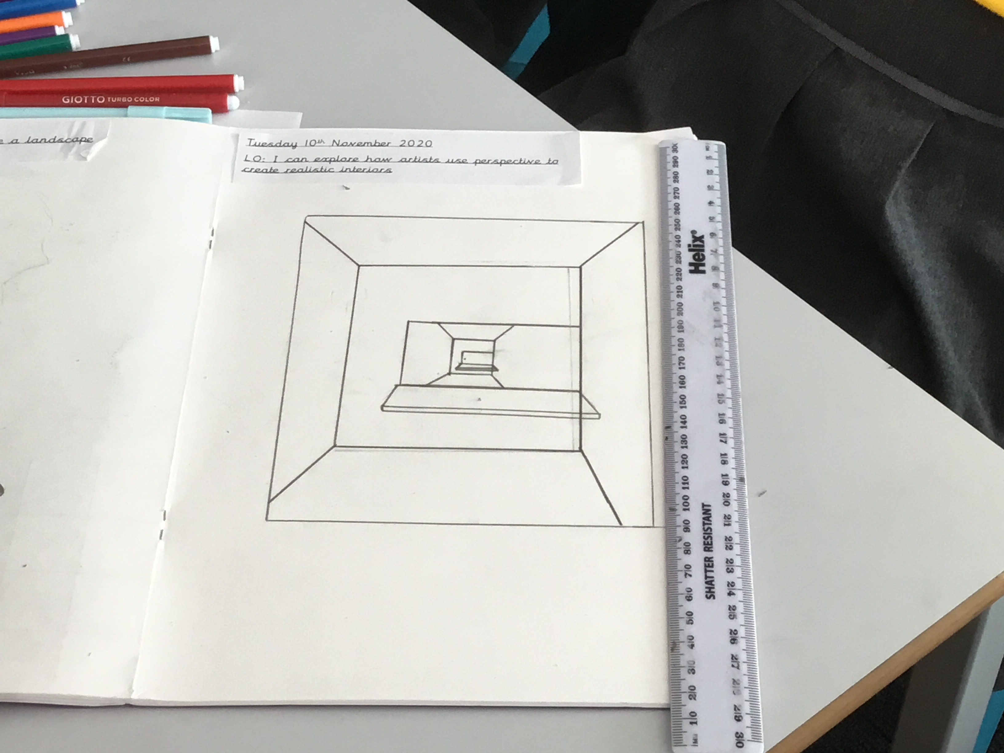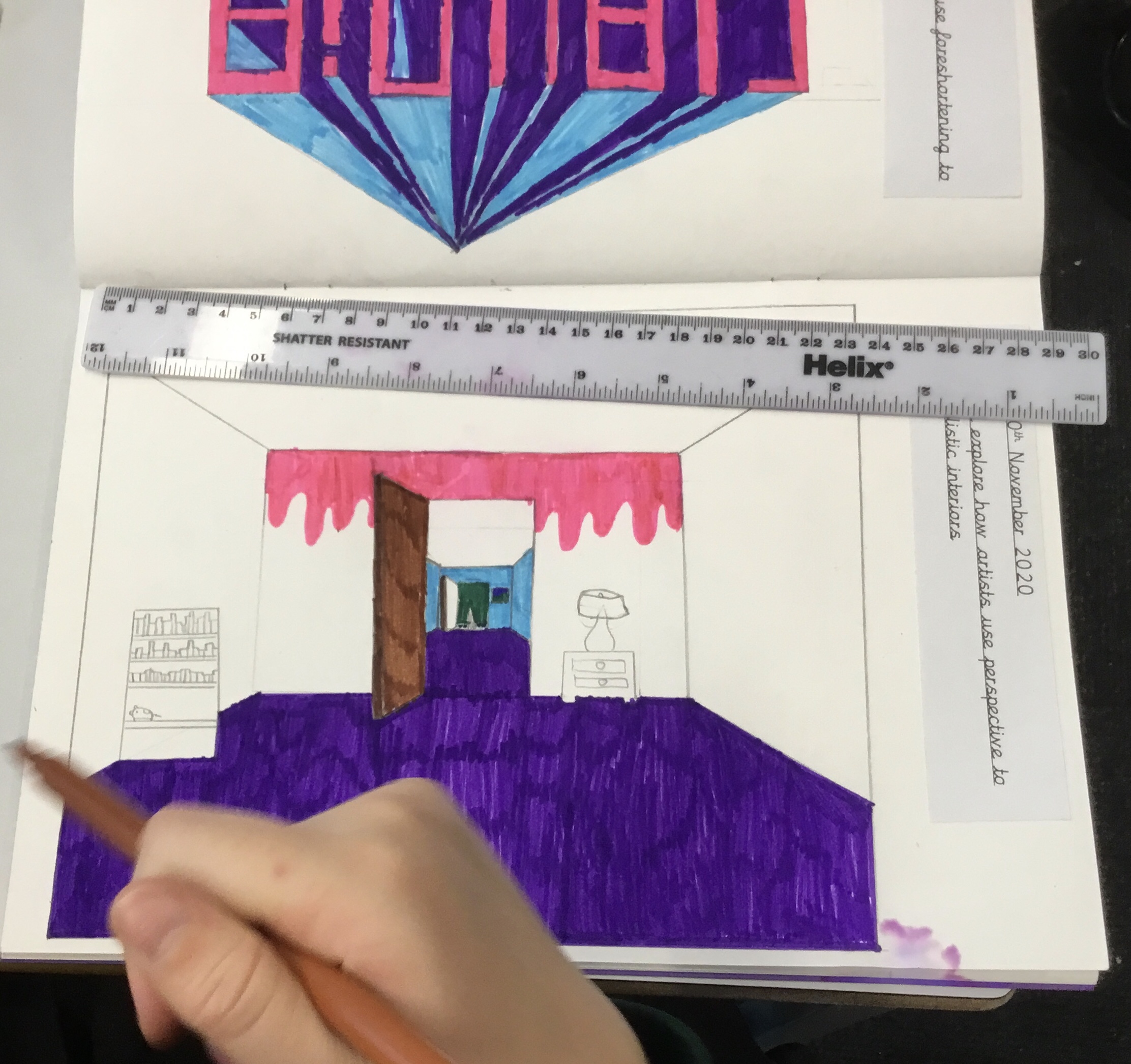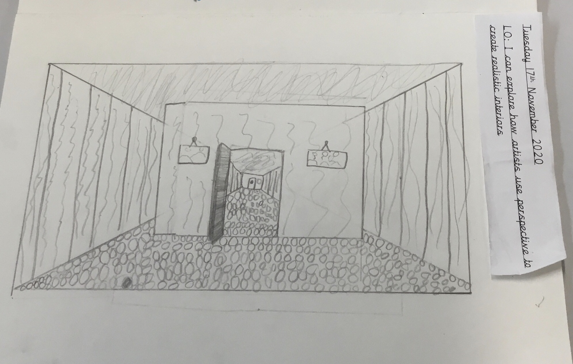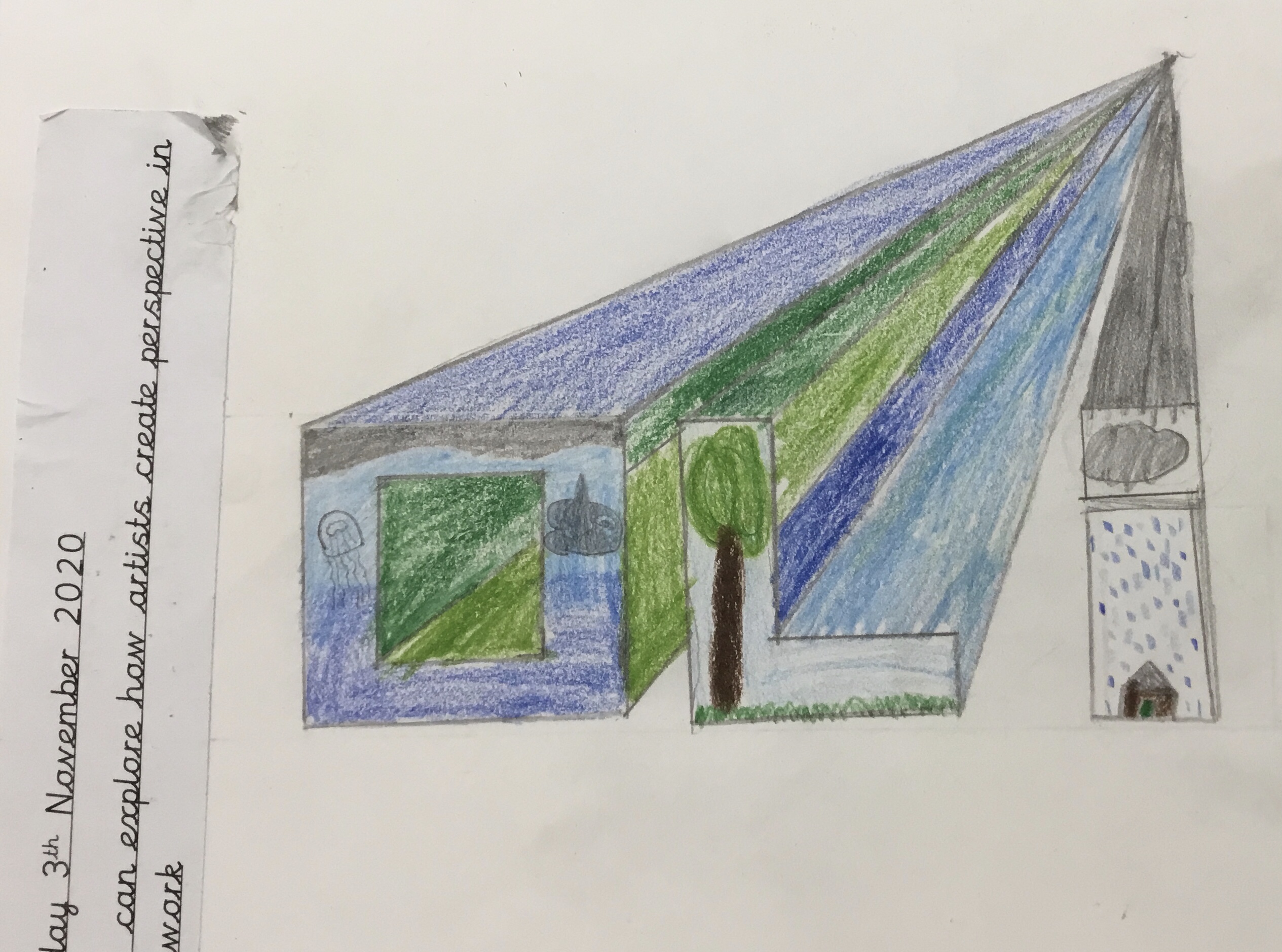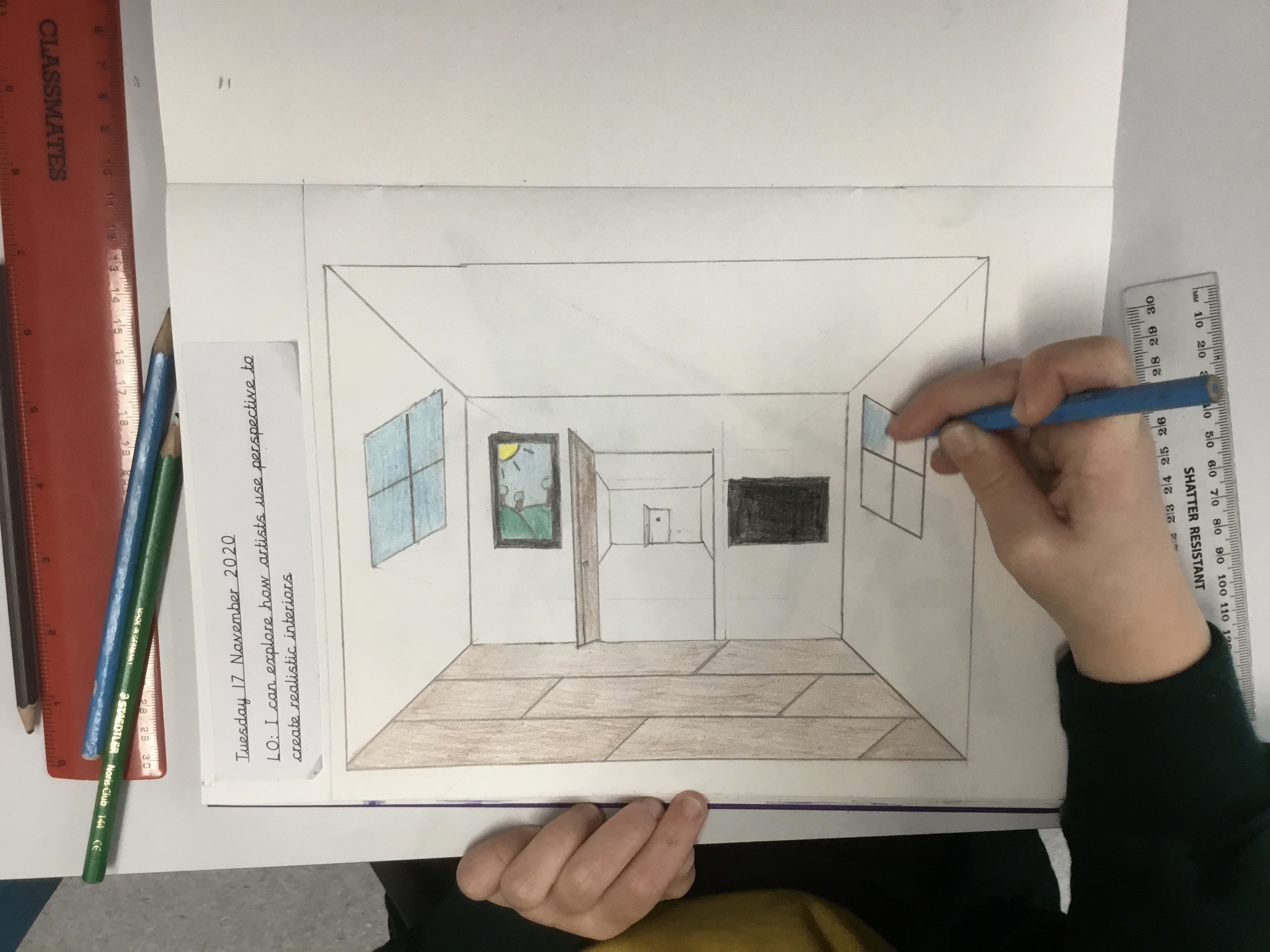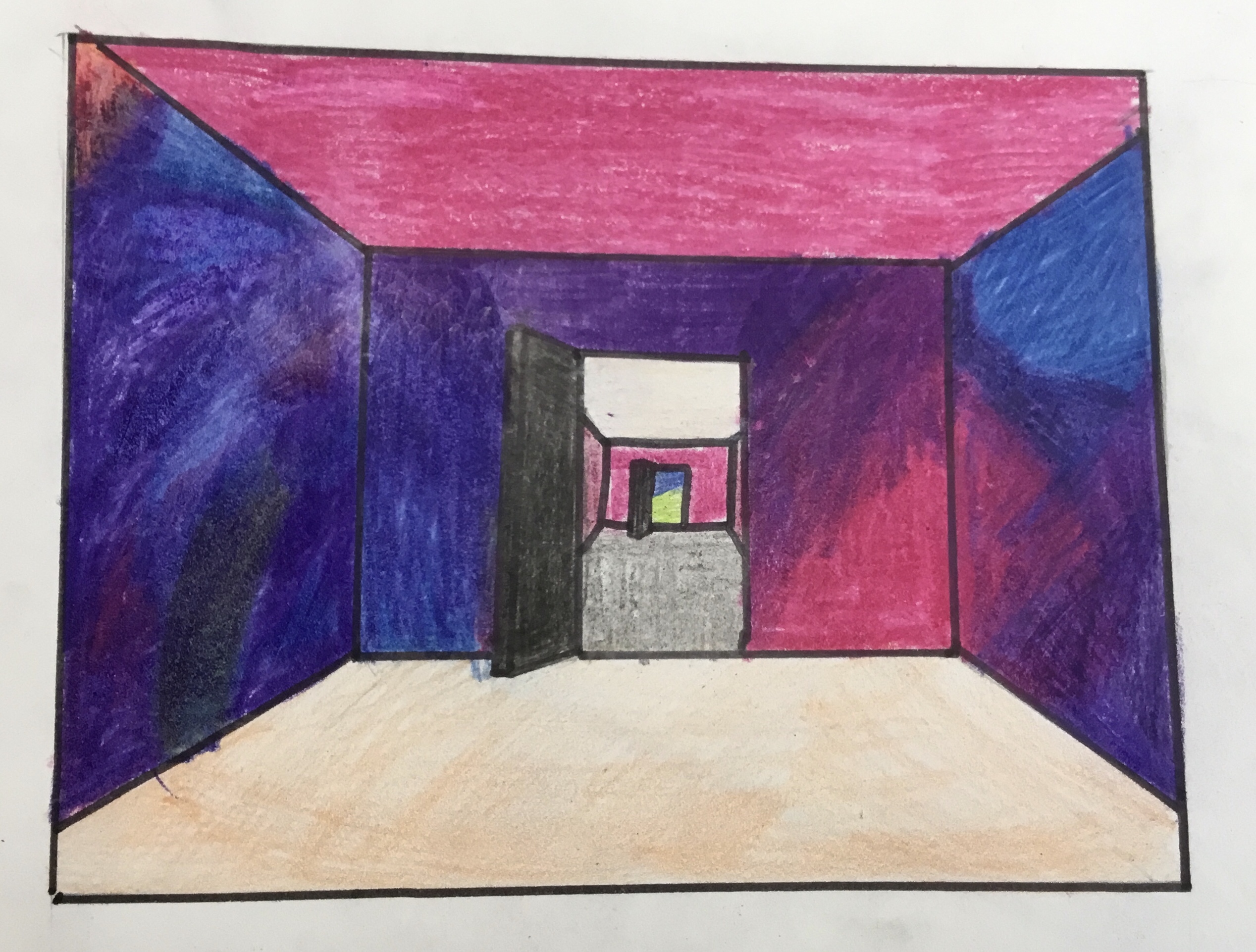 Year 5 explored how artists use perspective to create a realistic interior. They used a vanishing point and rectangles to create the shape of the room, then they added in a door. After that they create another rectangle and door to create the illusion of walking through a few rooms to the outside. They finished off their interior by adding colour.