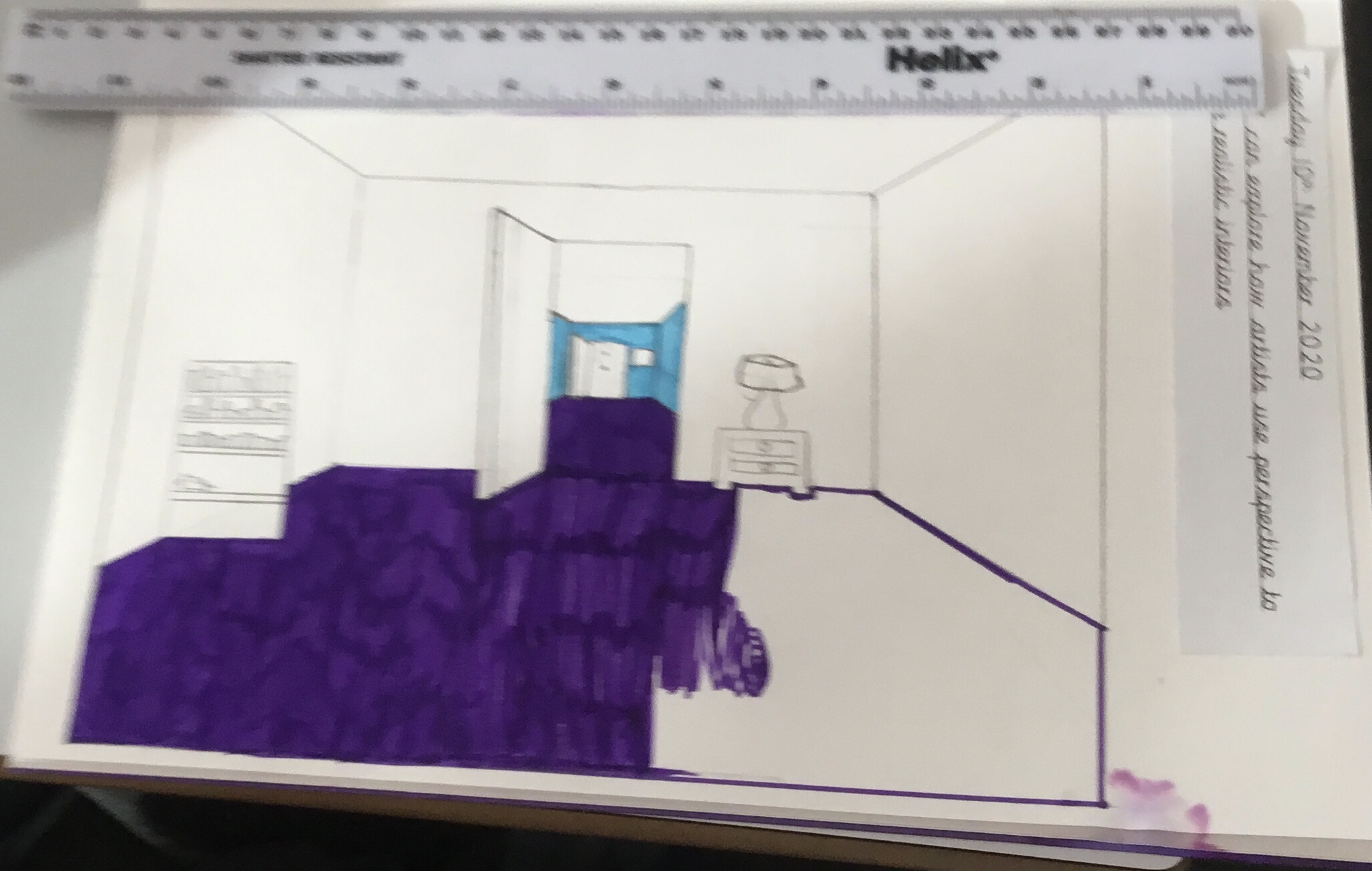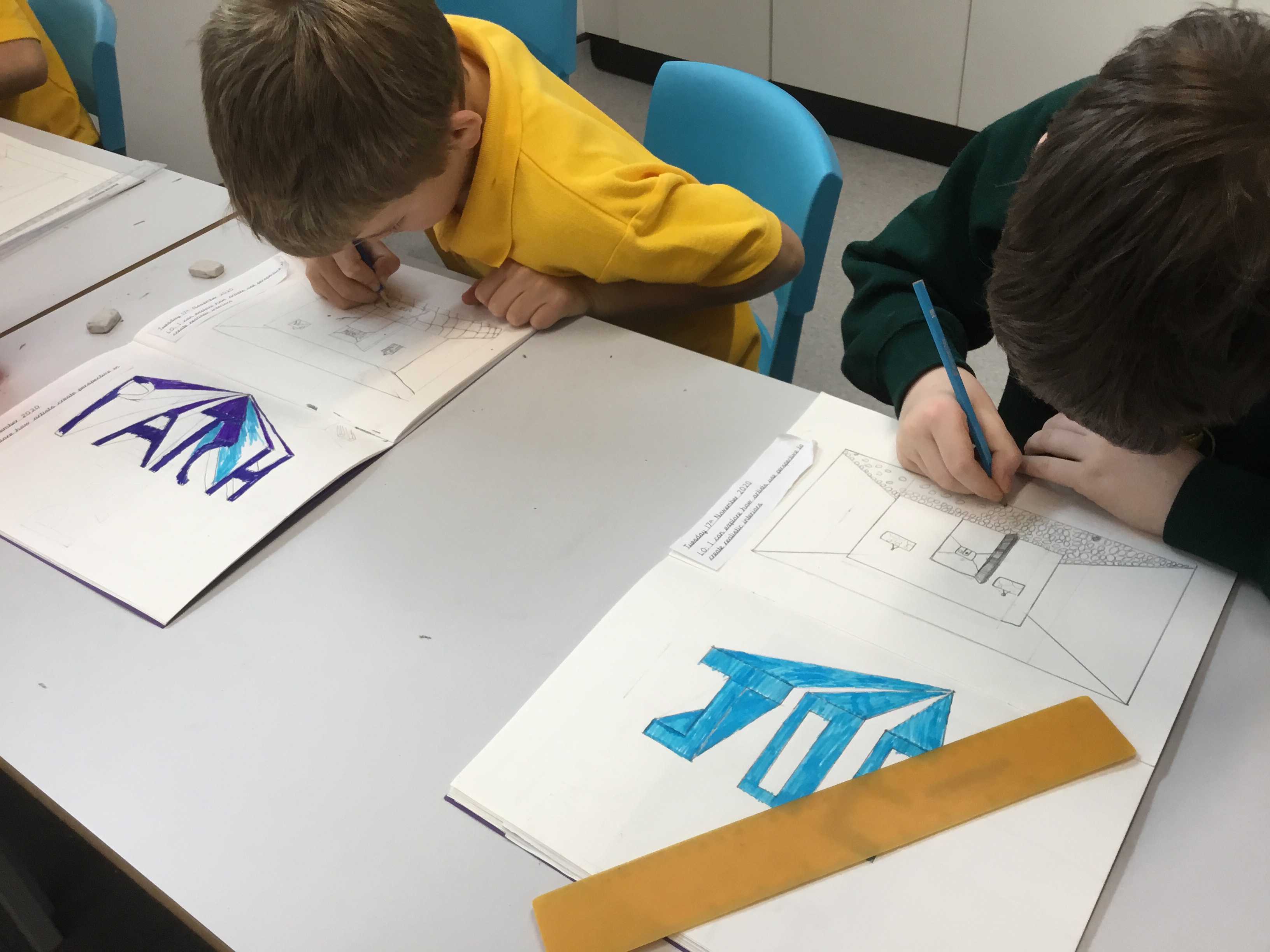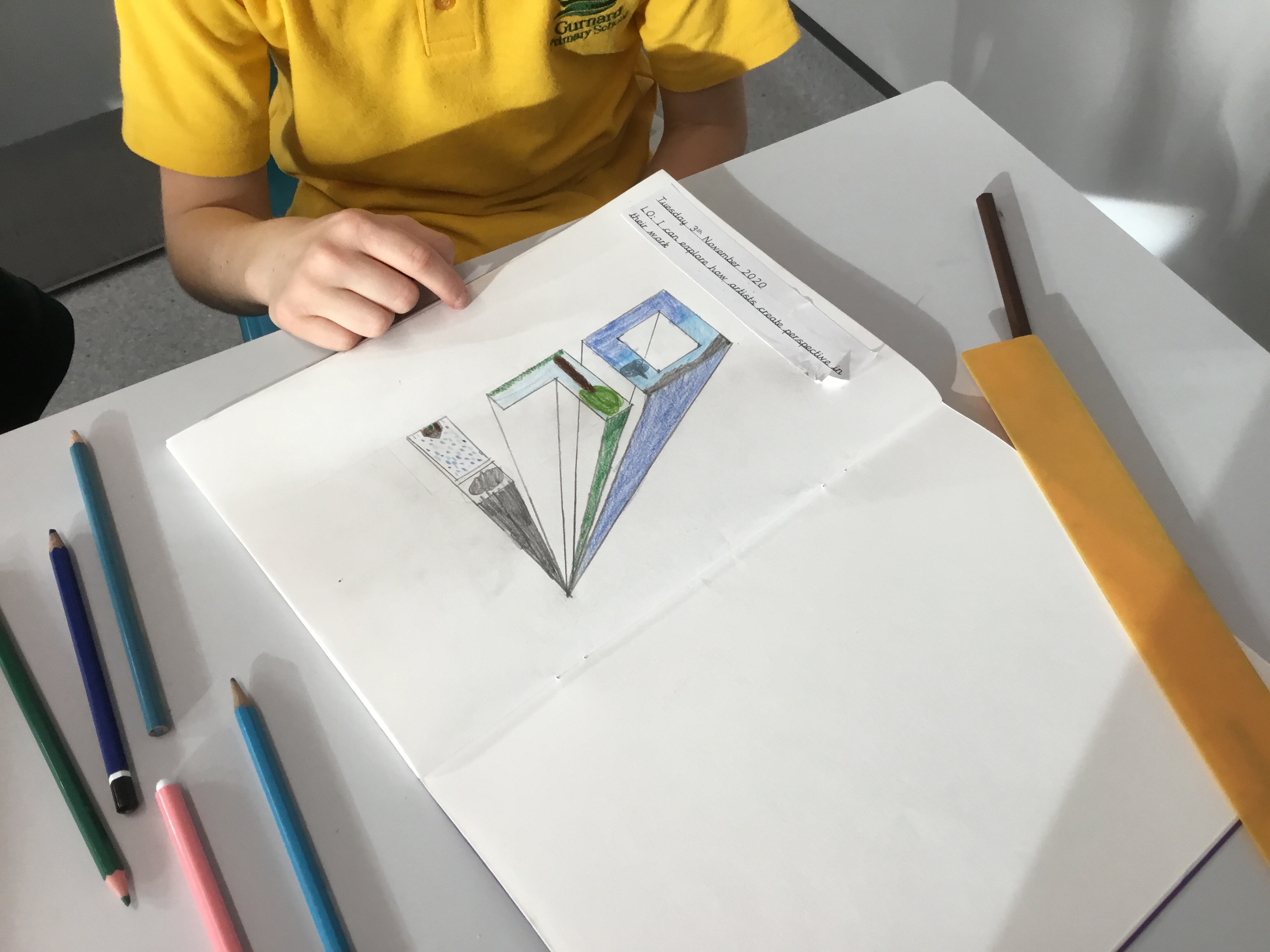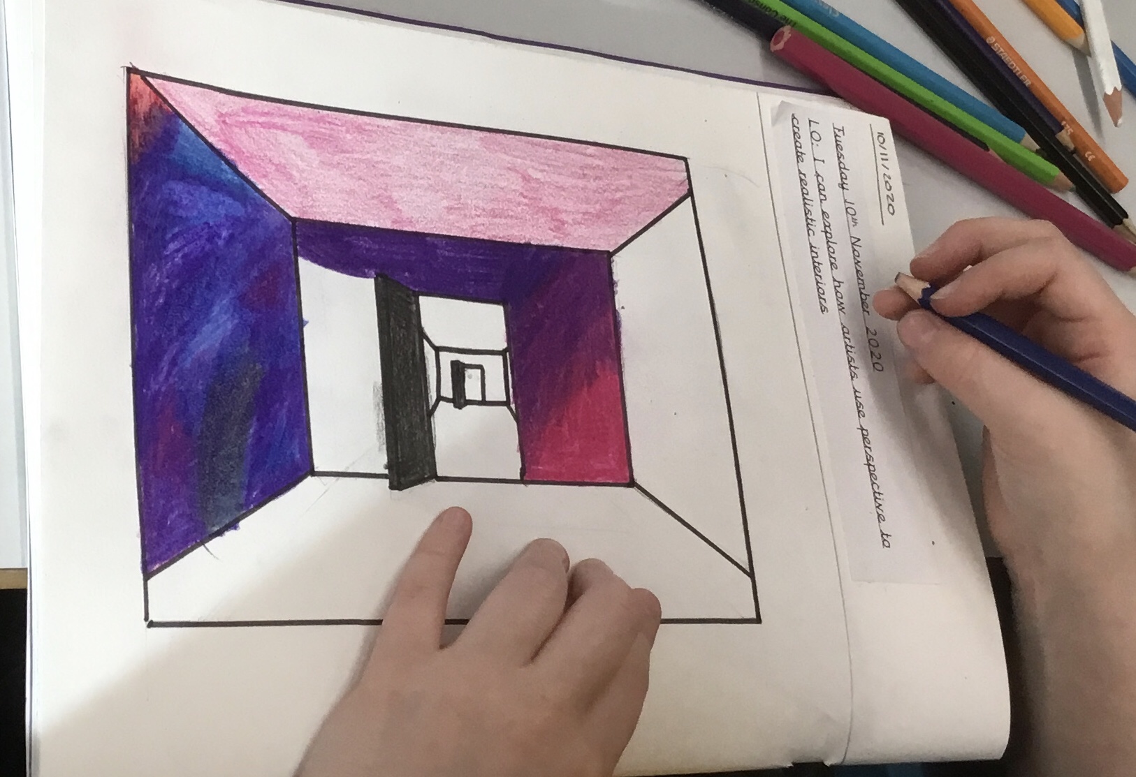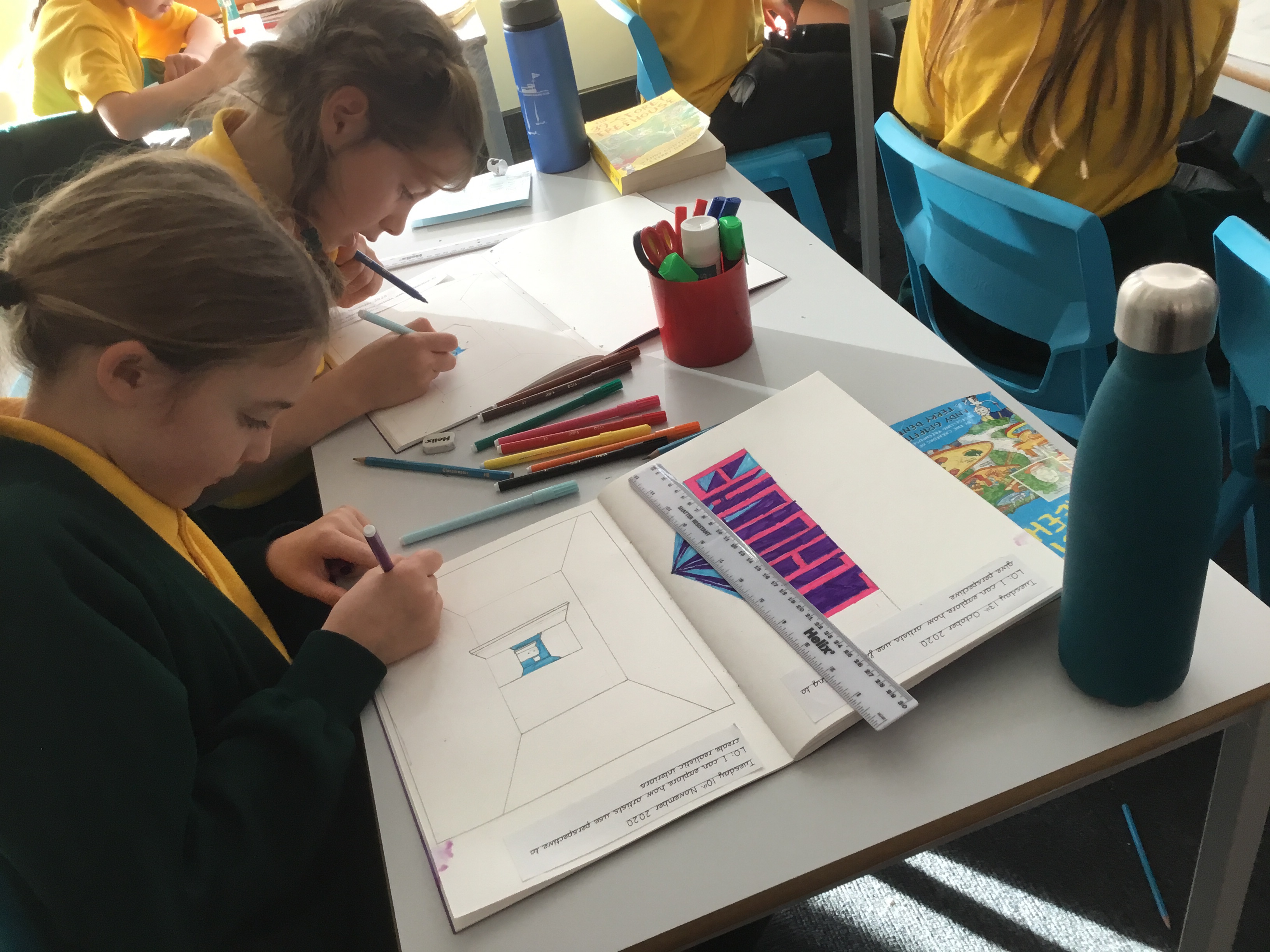 Year 5 explored how artists use perspective to create a realistic interior. They used a vanishing point and rectangles to create the shape of the room, then they added in a door. After that they create another rectangle and door to create the illusion of walking through a few rooms to the outside. They finished off their interior by adding colour.
