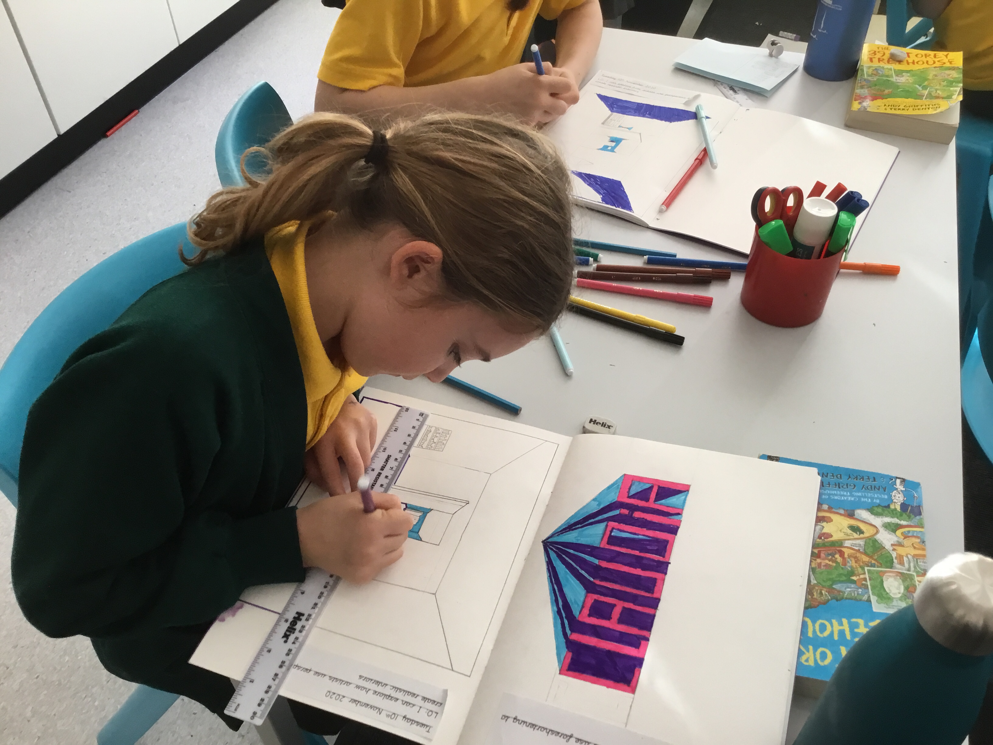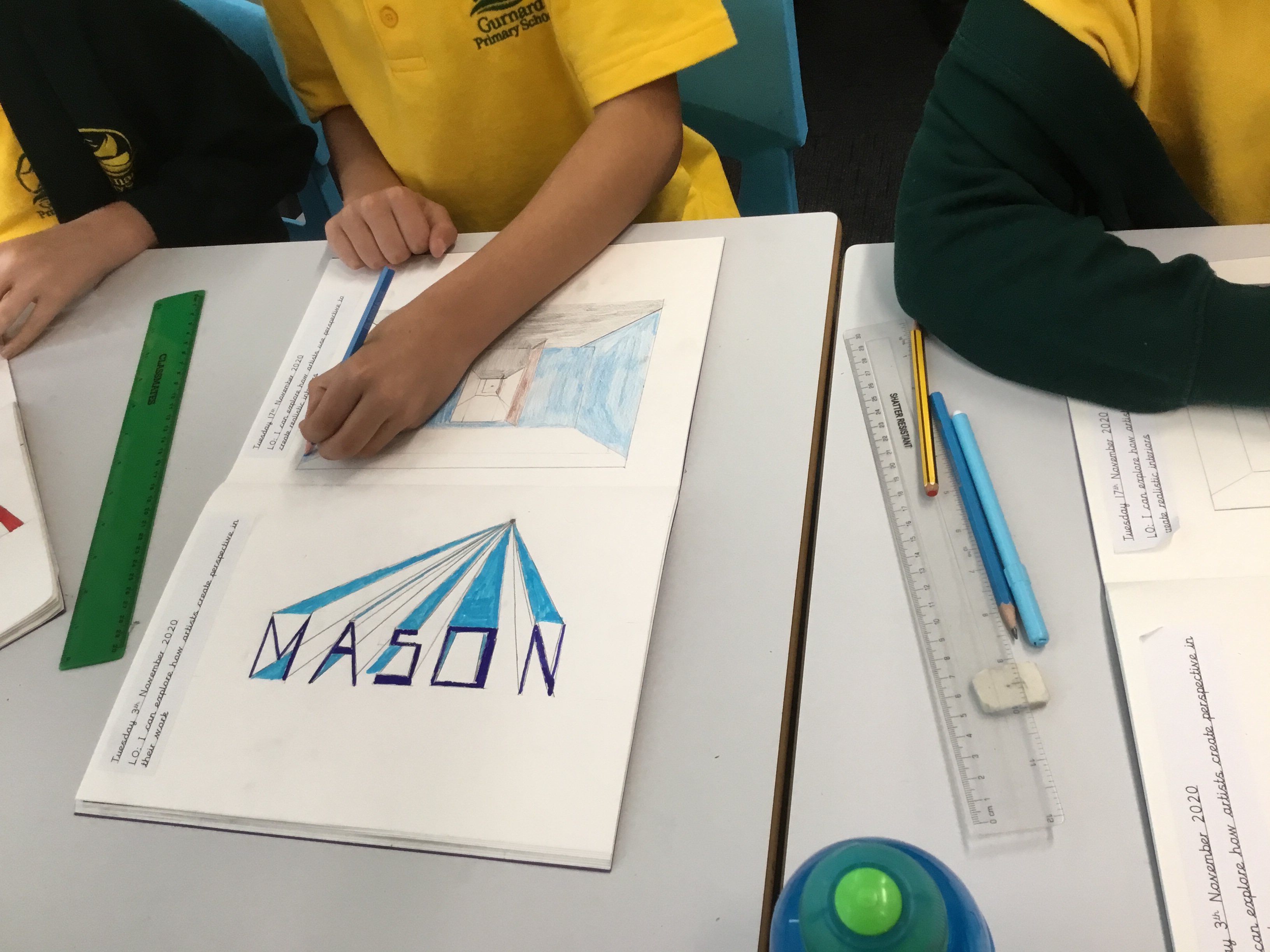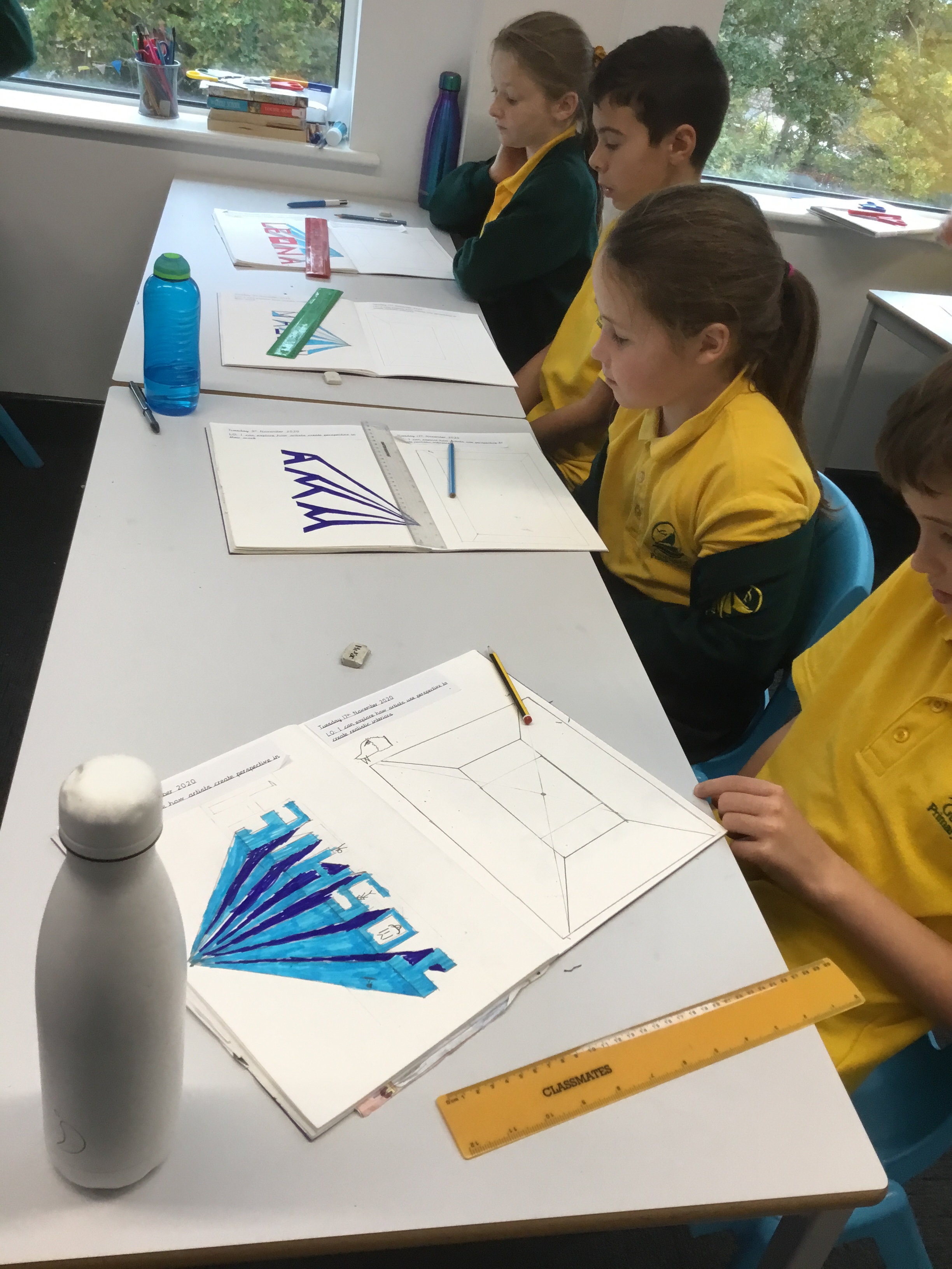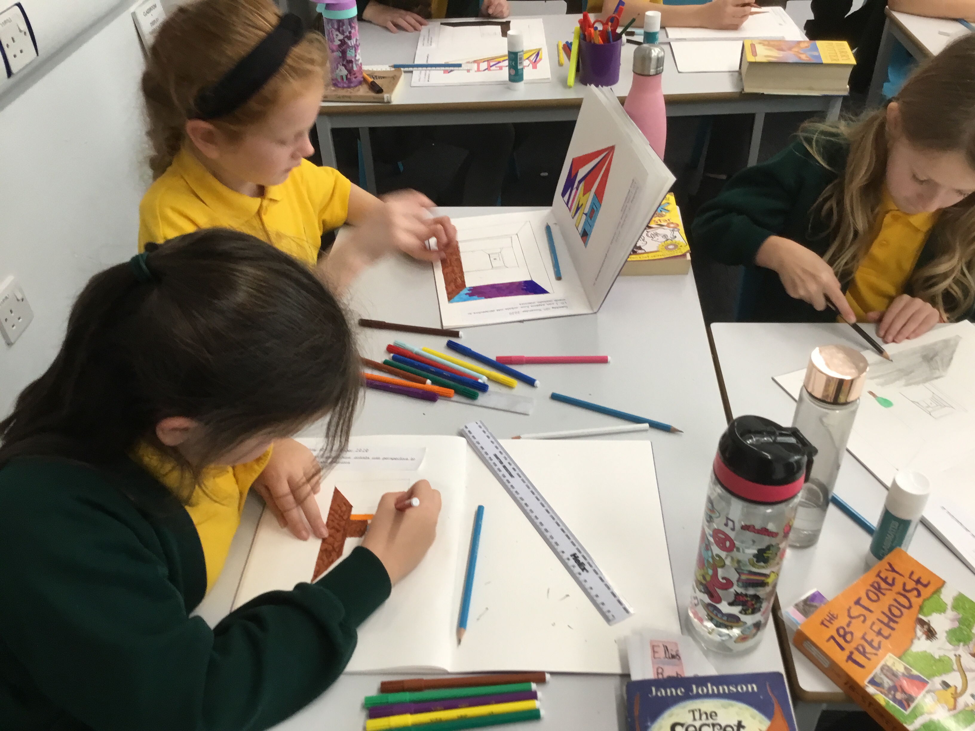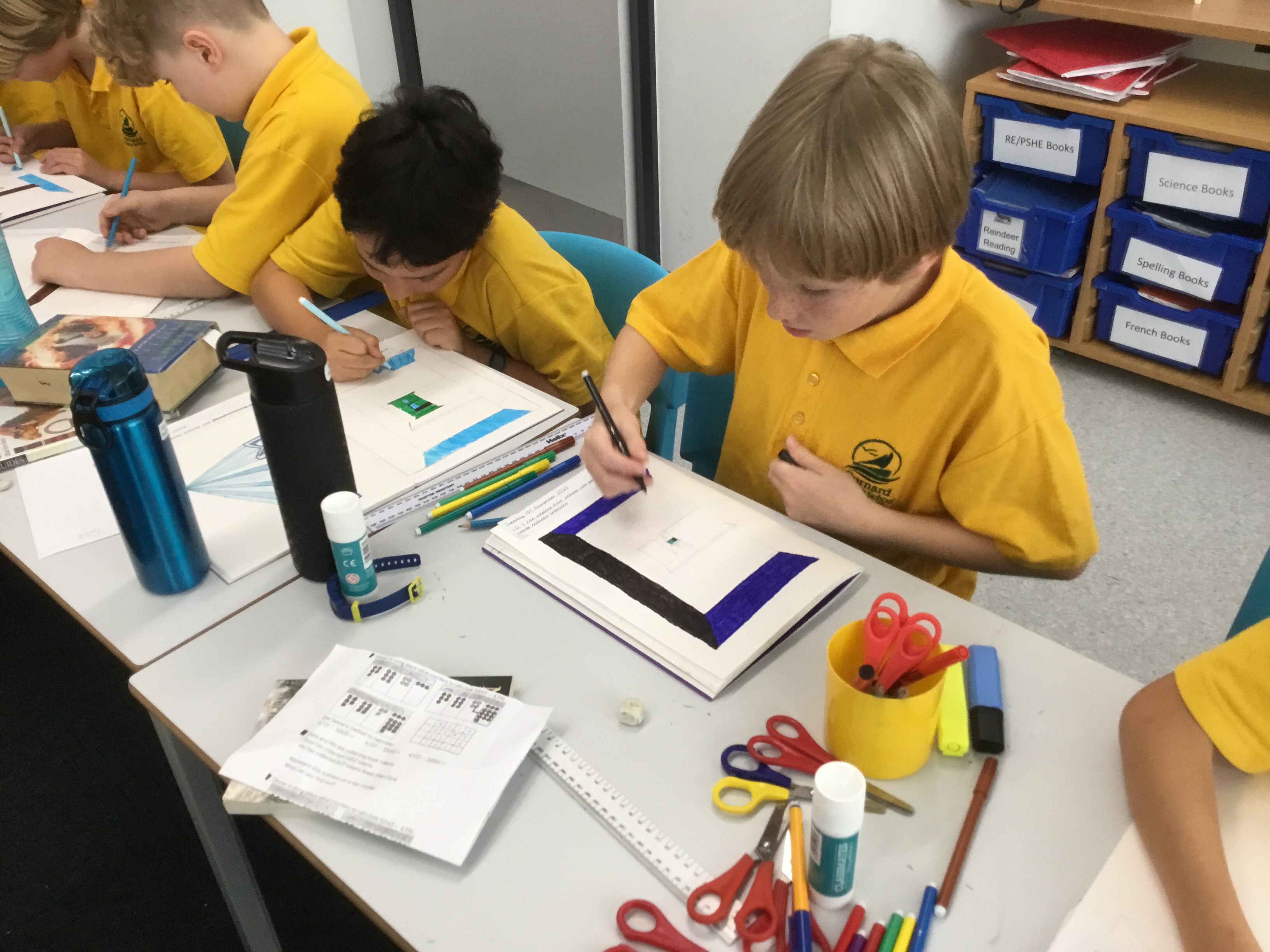 Year 5 explored how artists use perspective to create a realistic interior. They used a vanishing point and rectangles to create the shape of the room, then they added in a door. After that they create another rectangle and door to create the illusion of walking through a few rooms to the outside. They finished off their interior by adding colour.