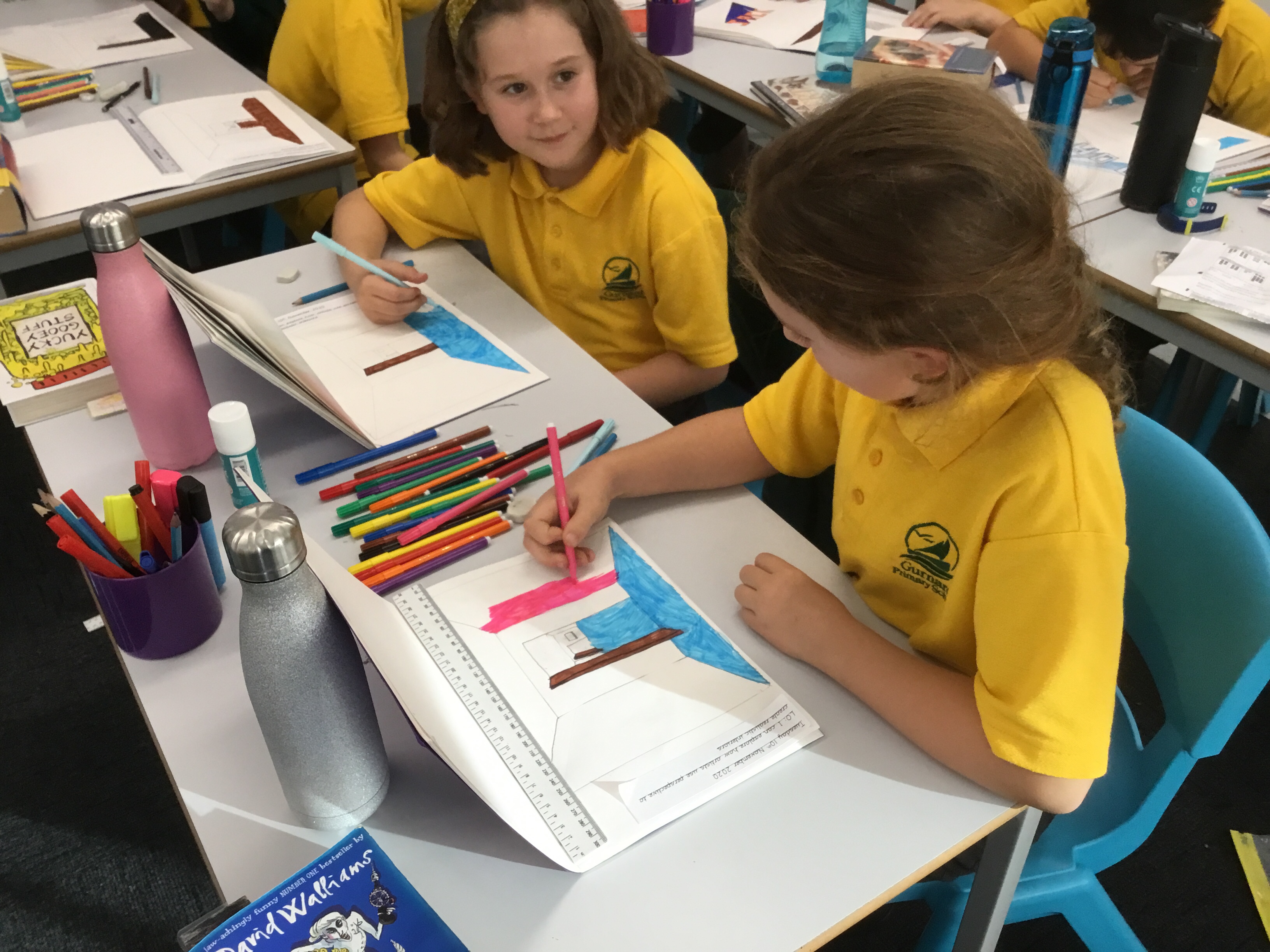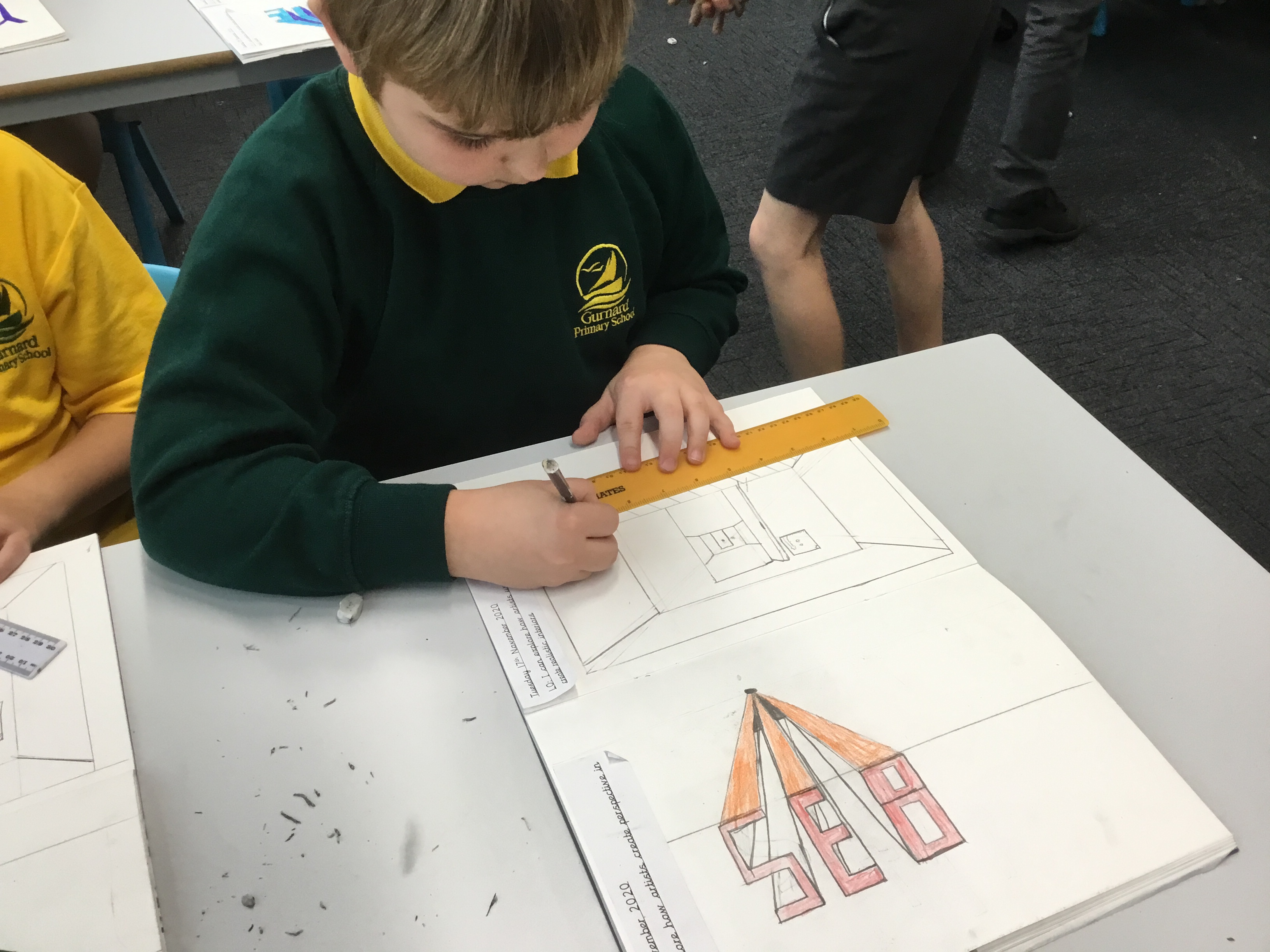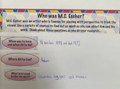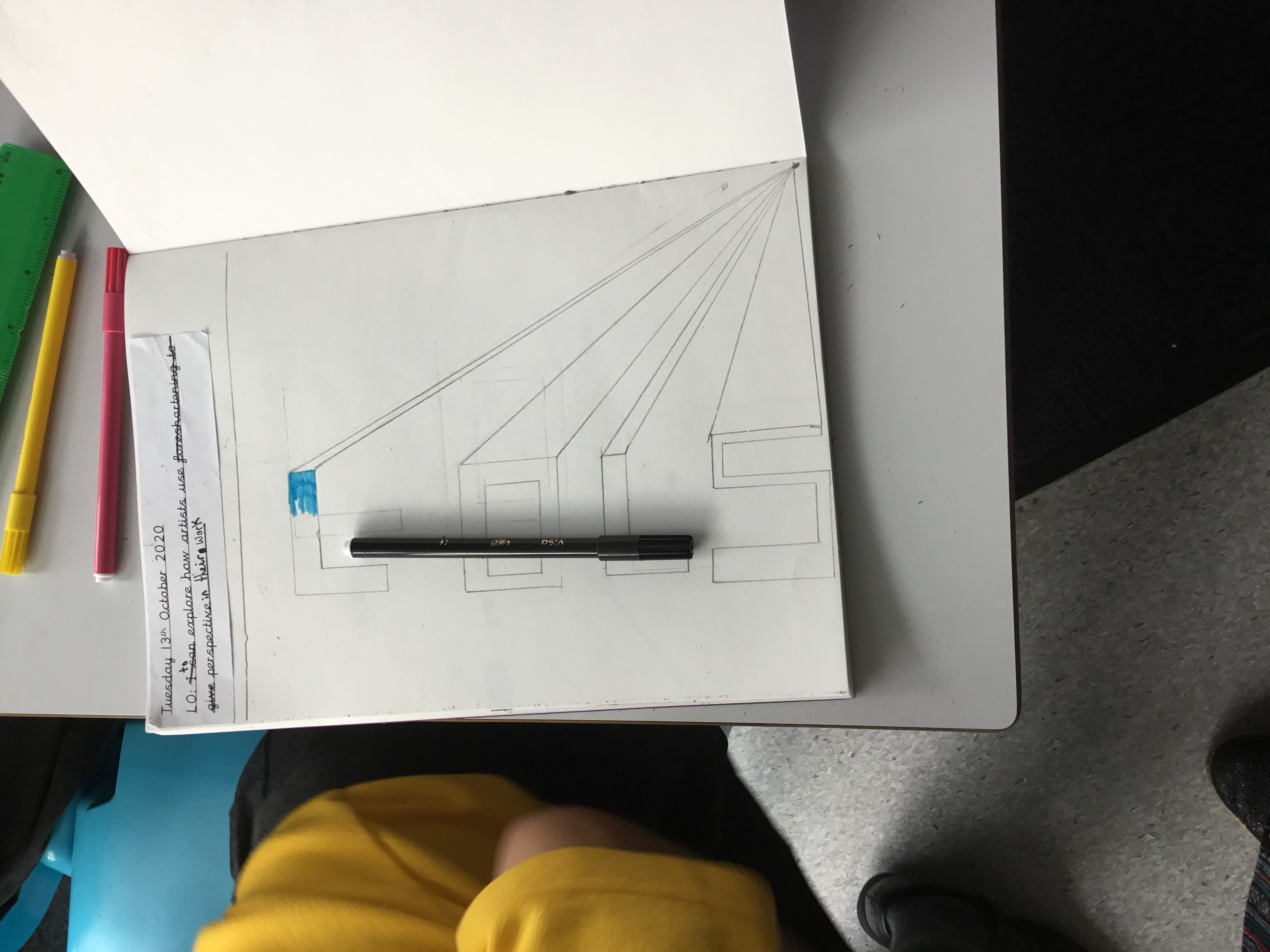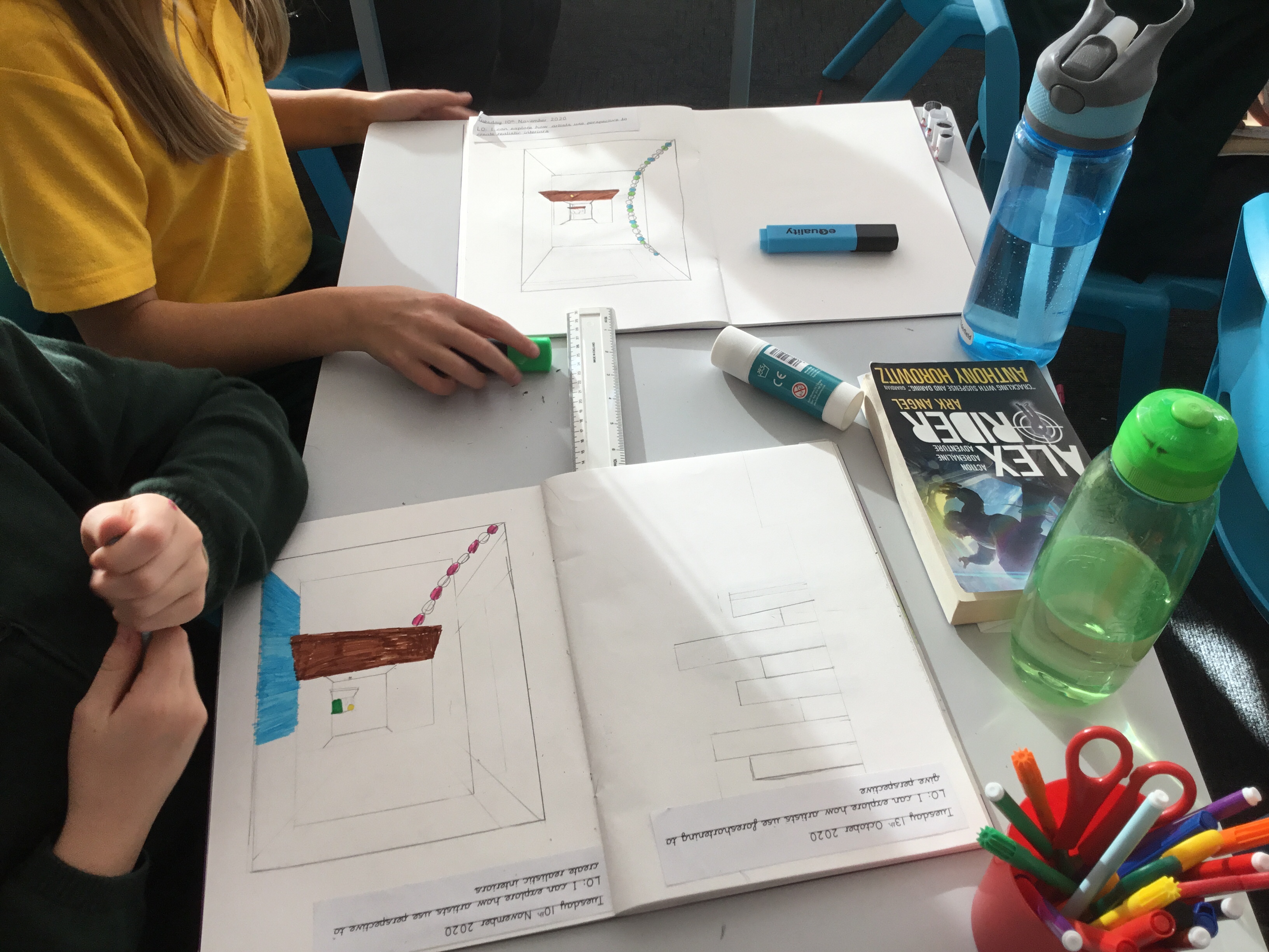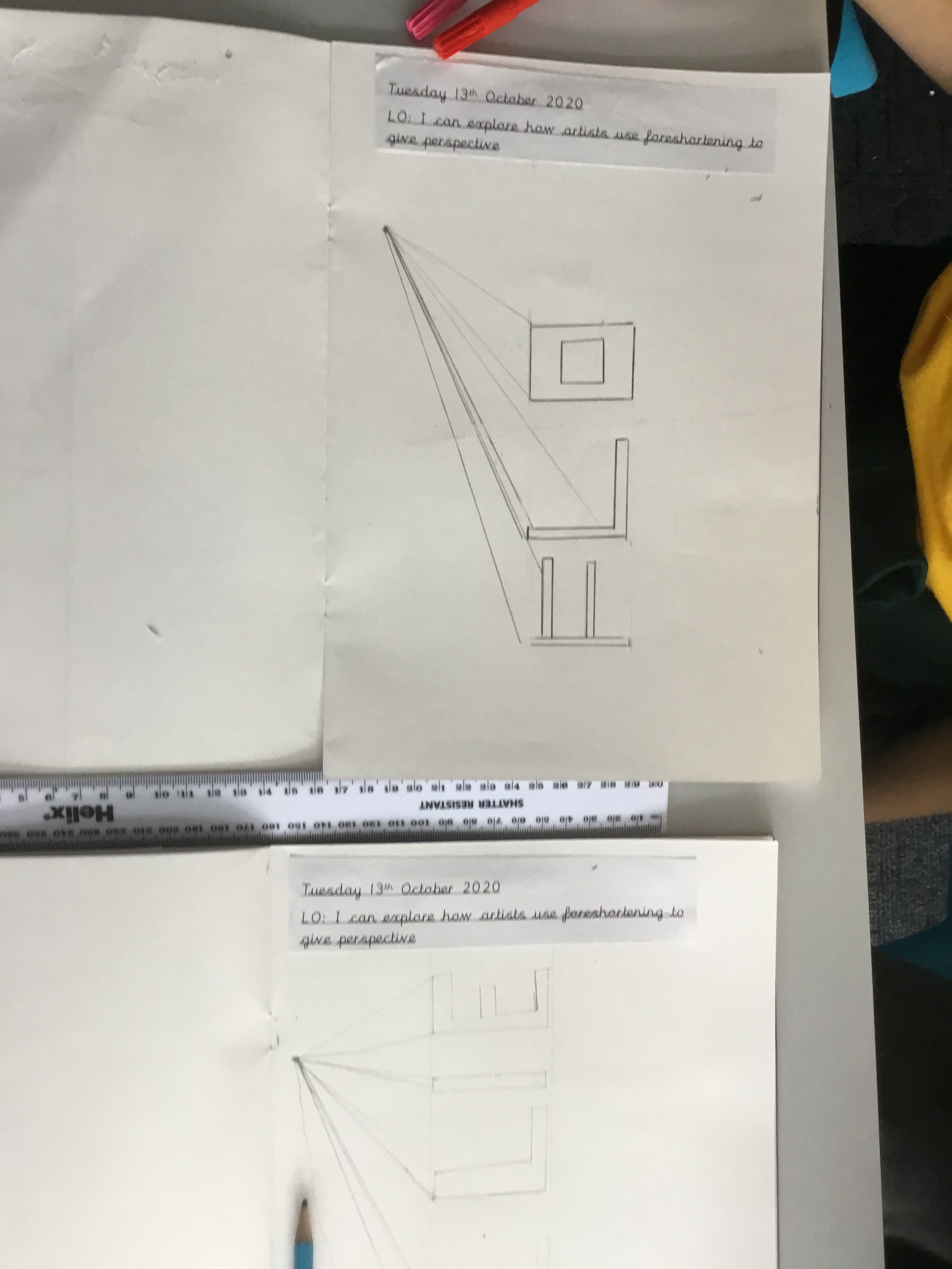 Year 5 explored how artists use perspective to create a realistic interior. They used a vanishing point and rectangles to create the shape of the room, then they added in a door. After that they create another rectangle and door to create the illusion of walking through a few rooms to the outside. They finished off their interior by adding colour.