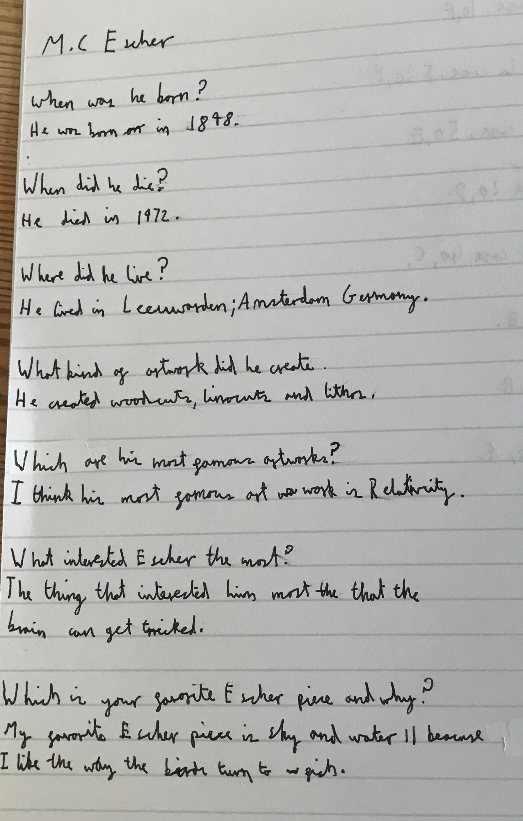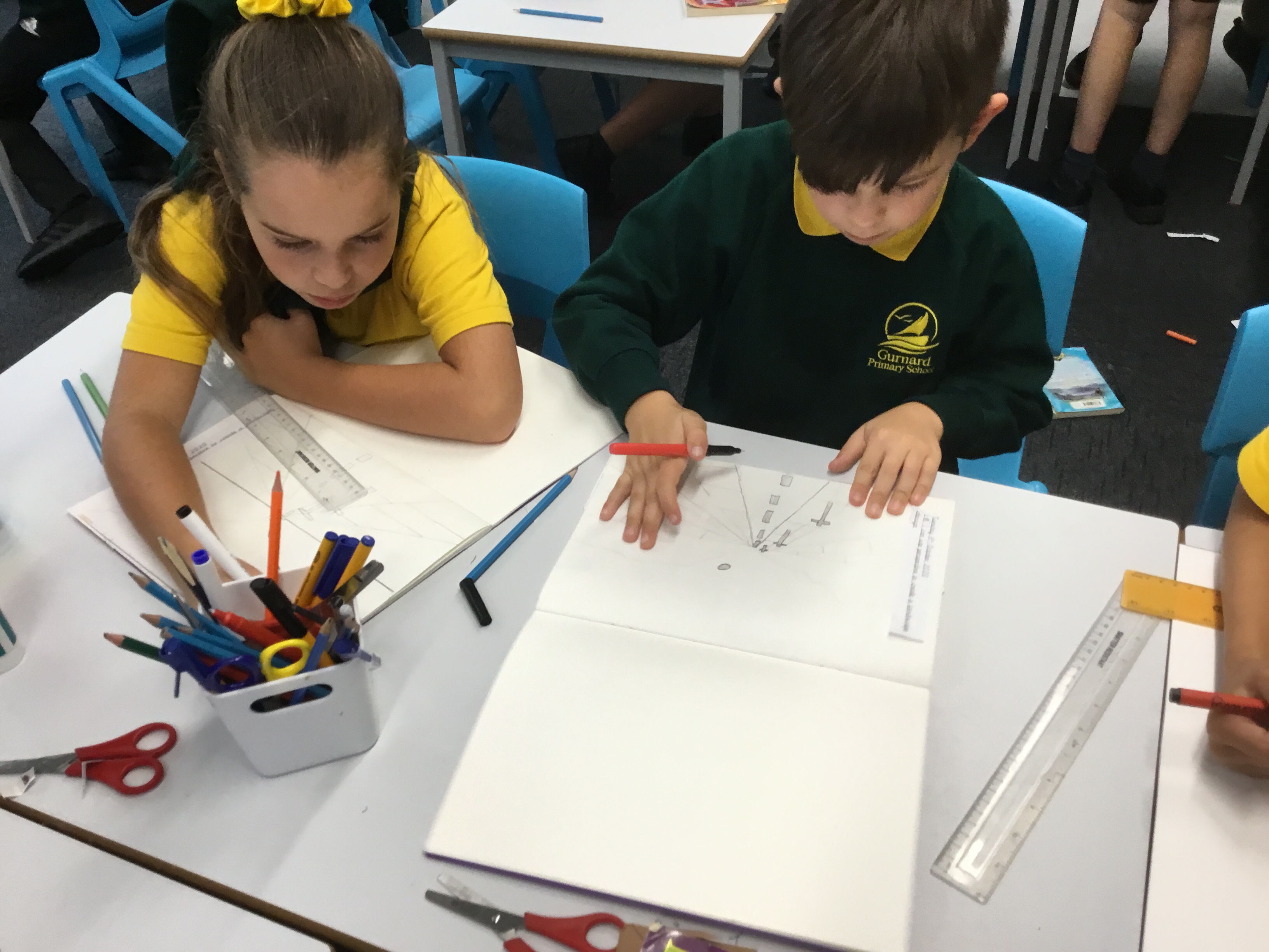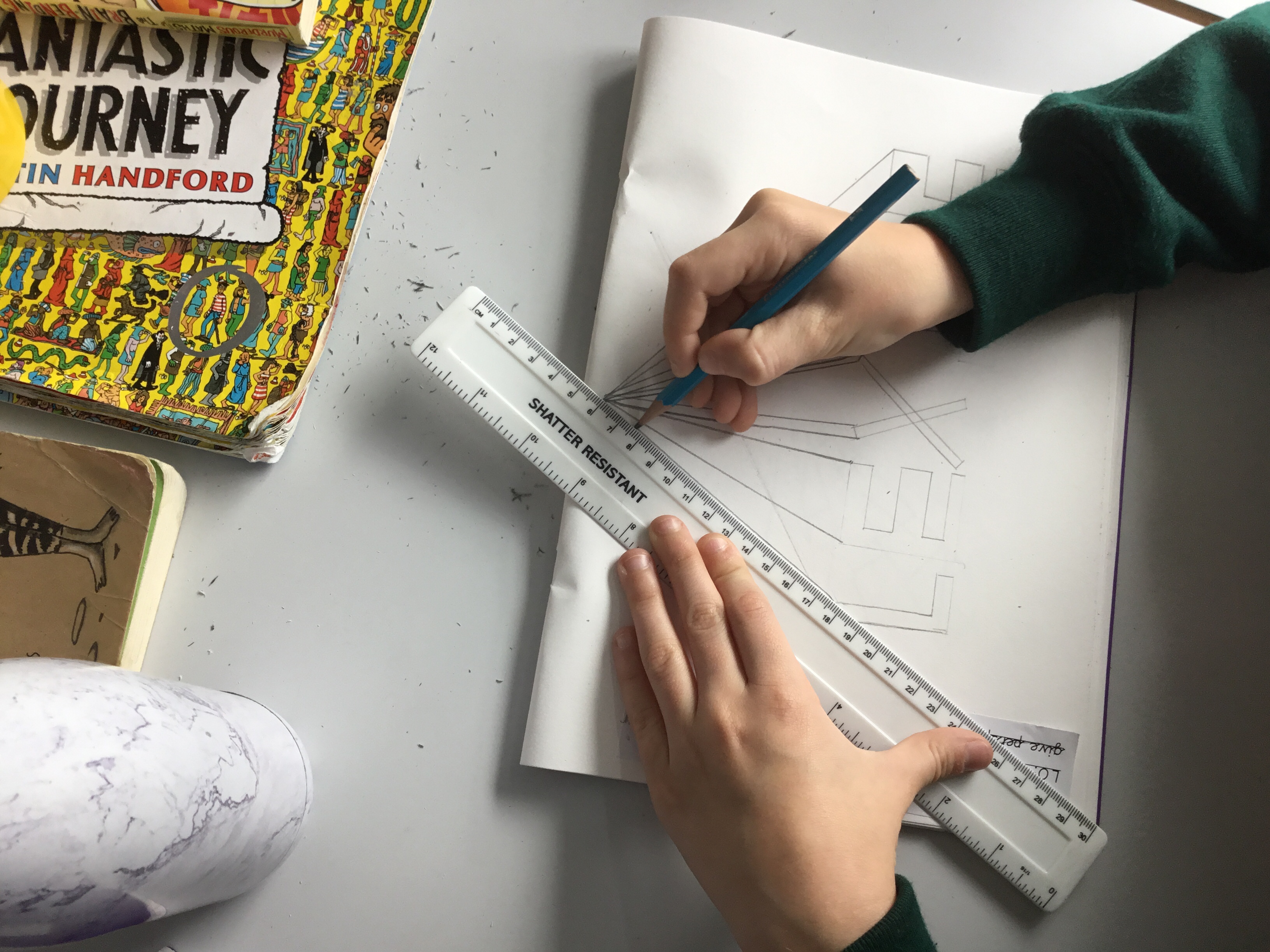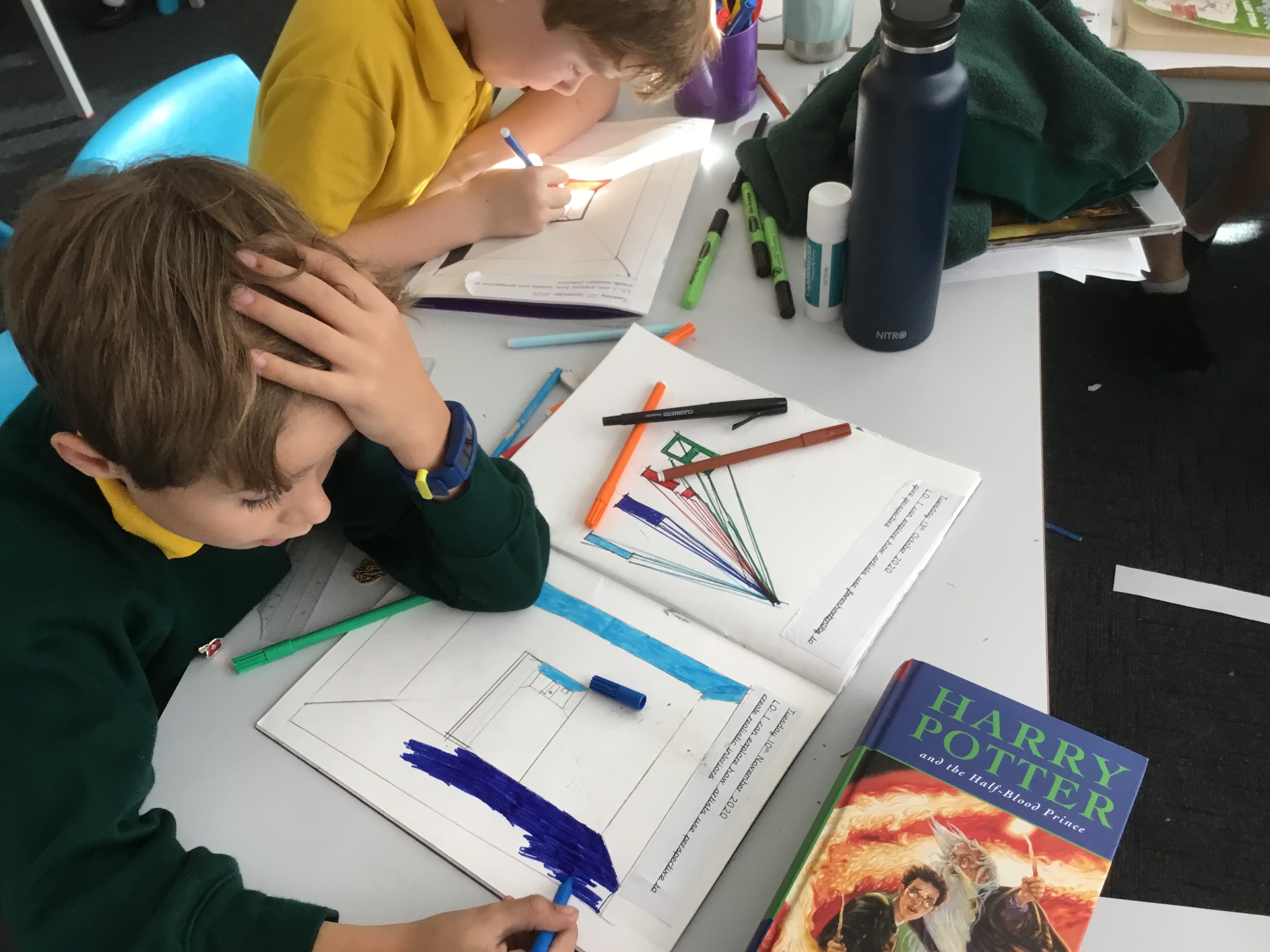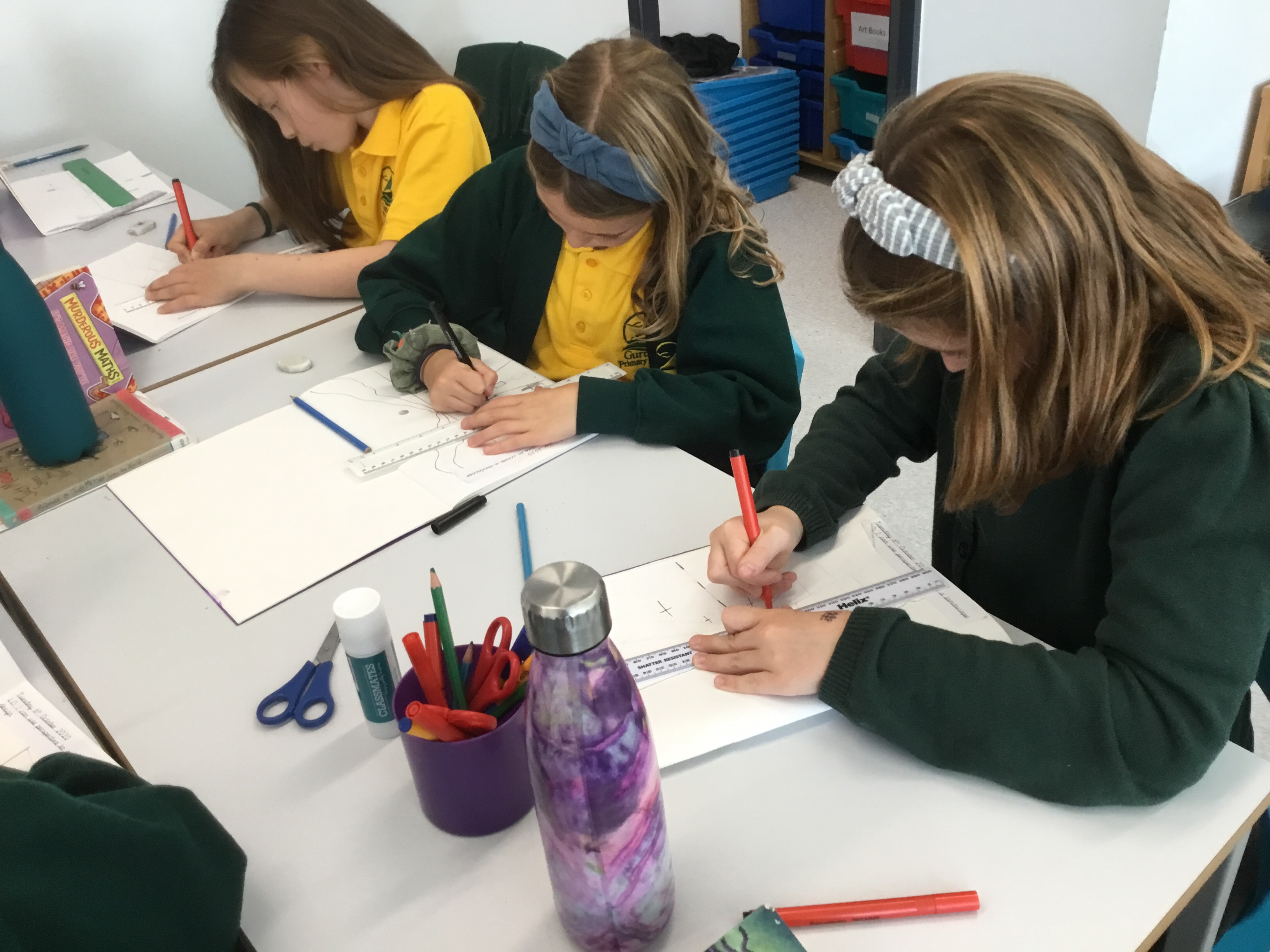 Year 5 explored how artists use perspective to create a realistic interior. They used a vanishing point and rectangles to create the shape of the room, then they added in a door. After that they create another rectangle and door to create the illusion of walking through a few rooms to the outside. They finished off their interior by adding colour.