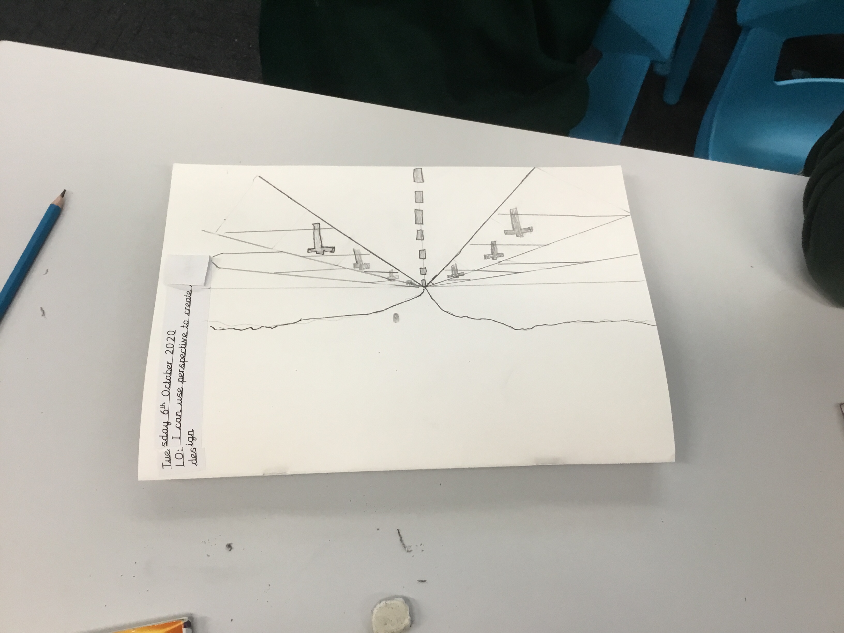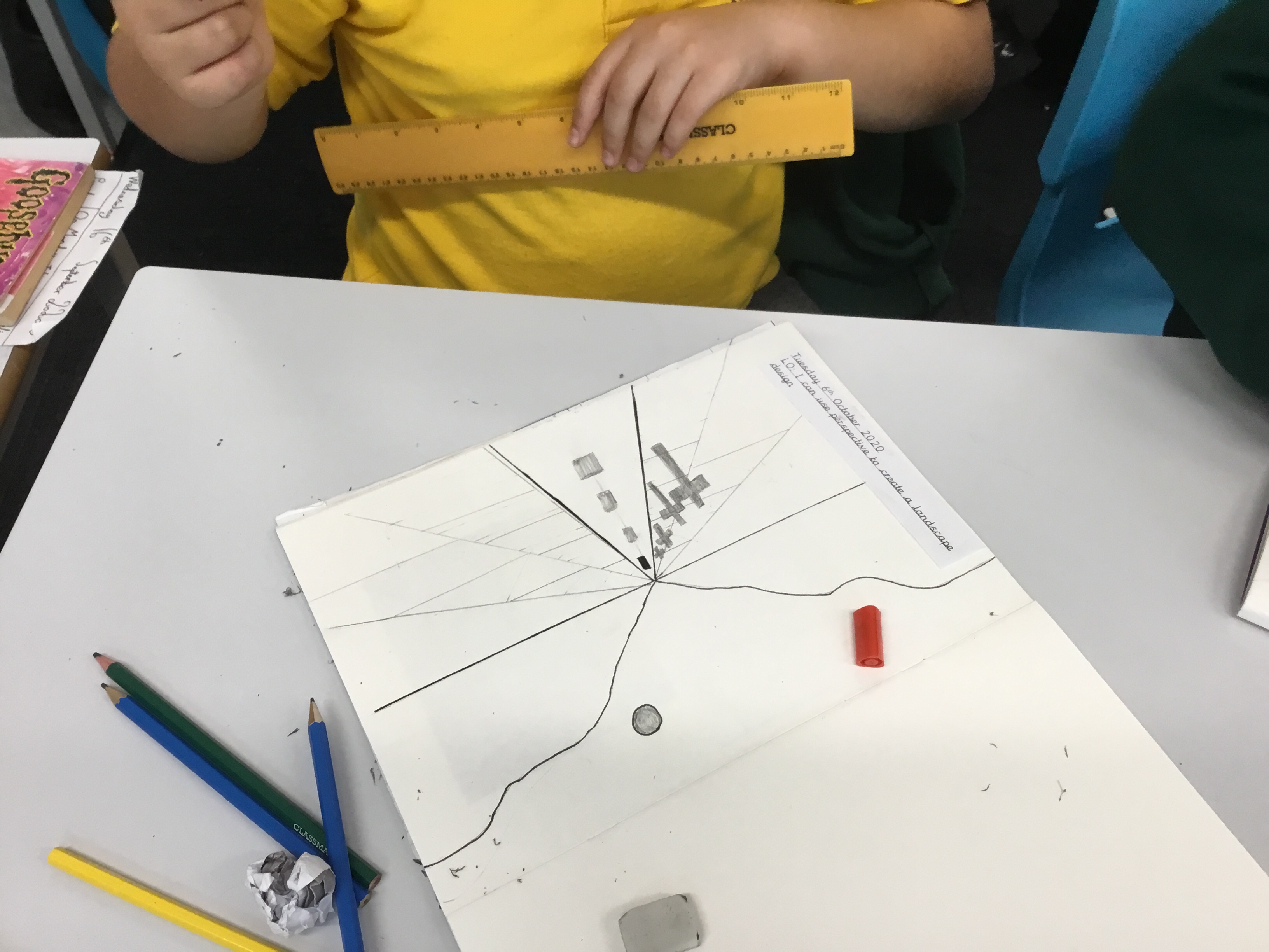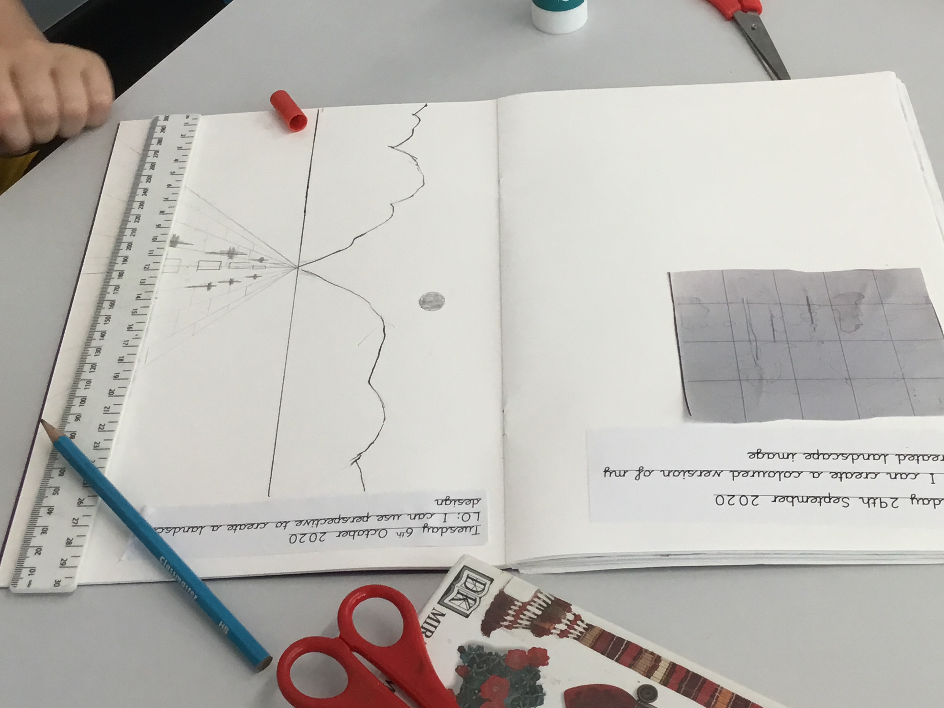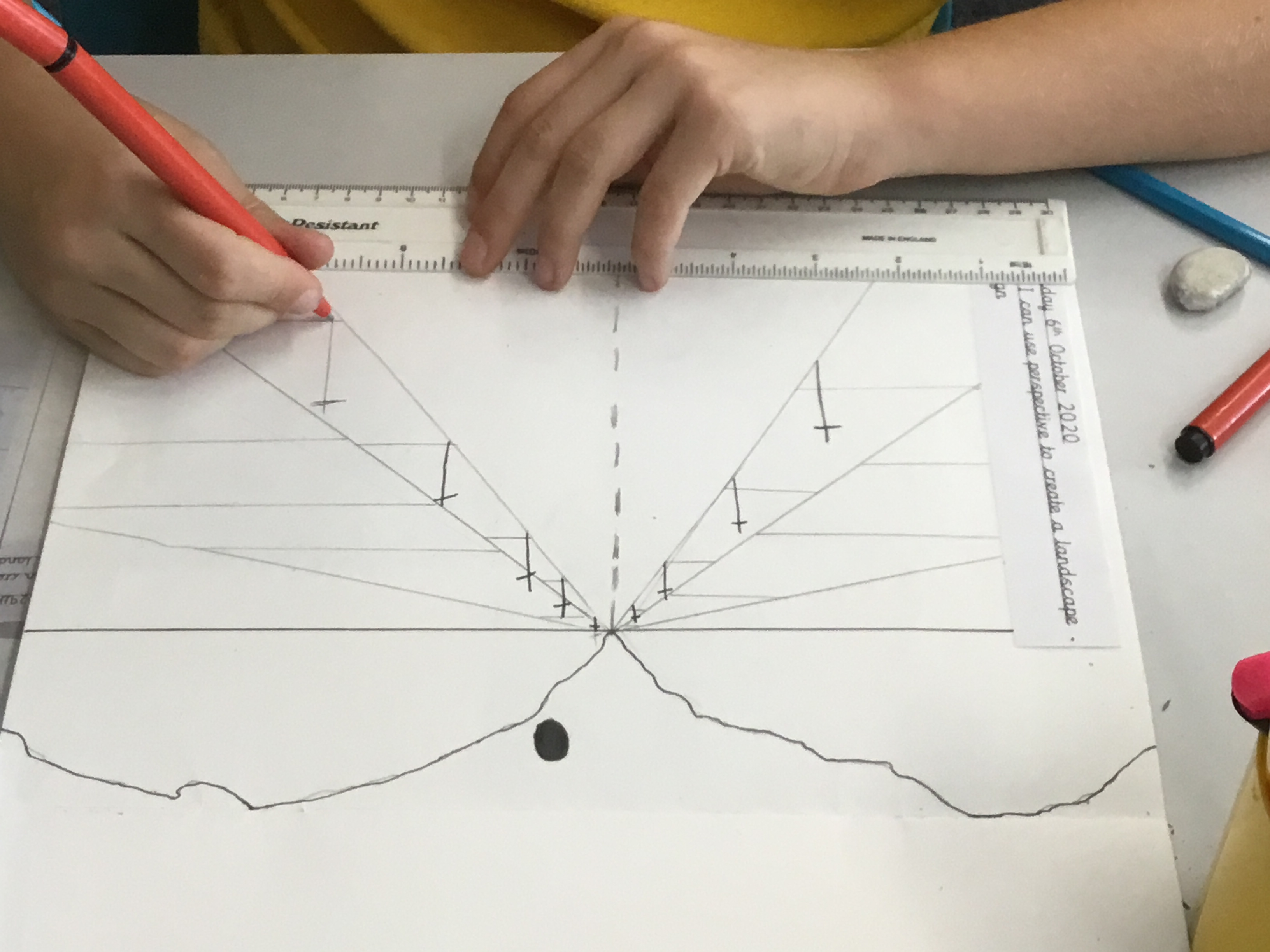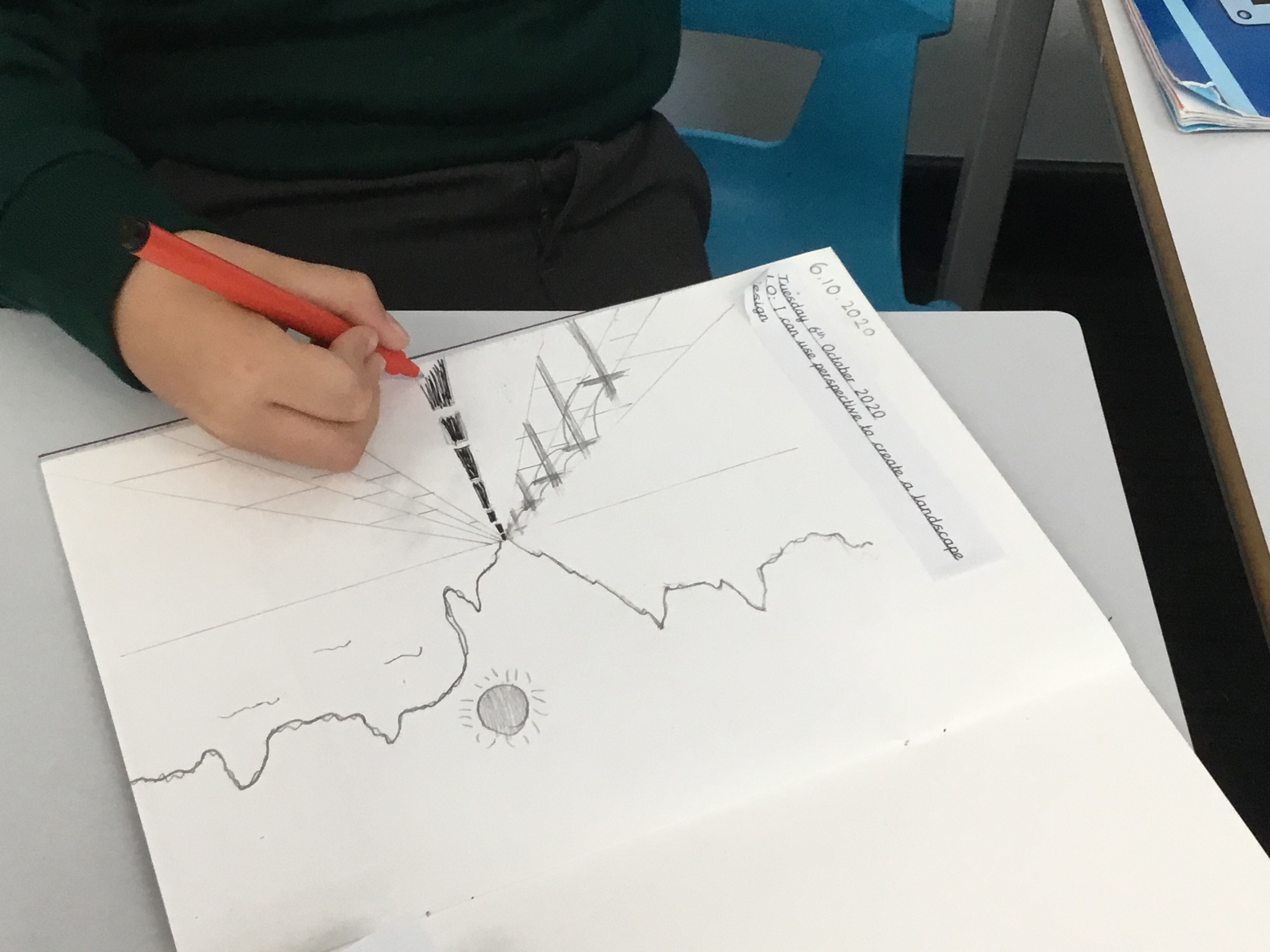 Year 5 sketched a landscape scene using perspective. They were shown step by step how to create the landscape so that they can apply perspective techniques to their own work. They used horizontal lines, vanishing points as well as sketching items in the foreground larger to show distance.