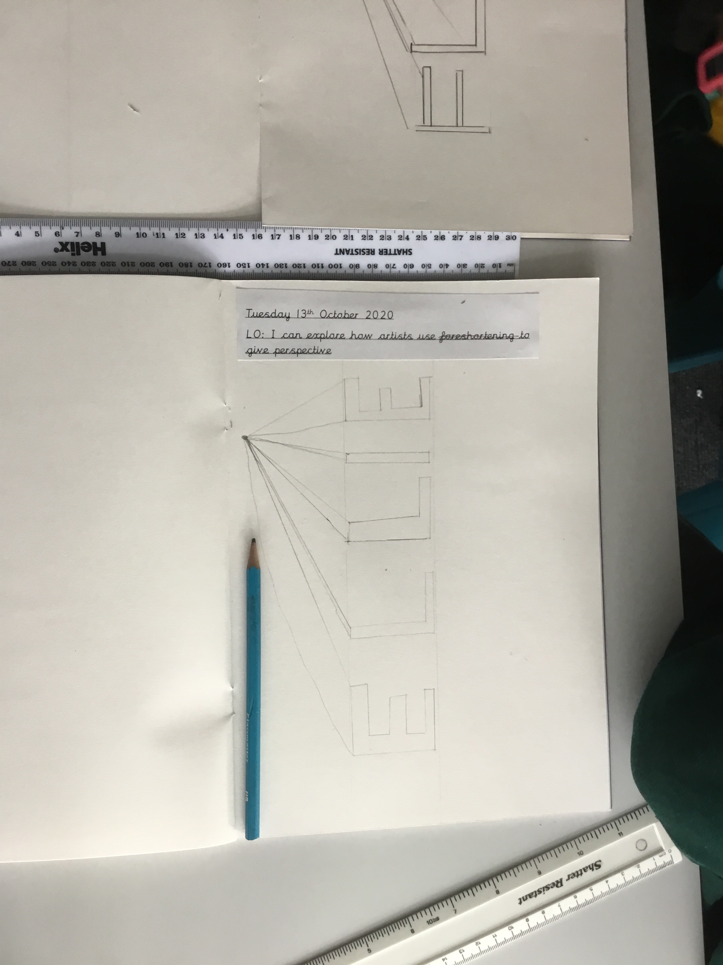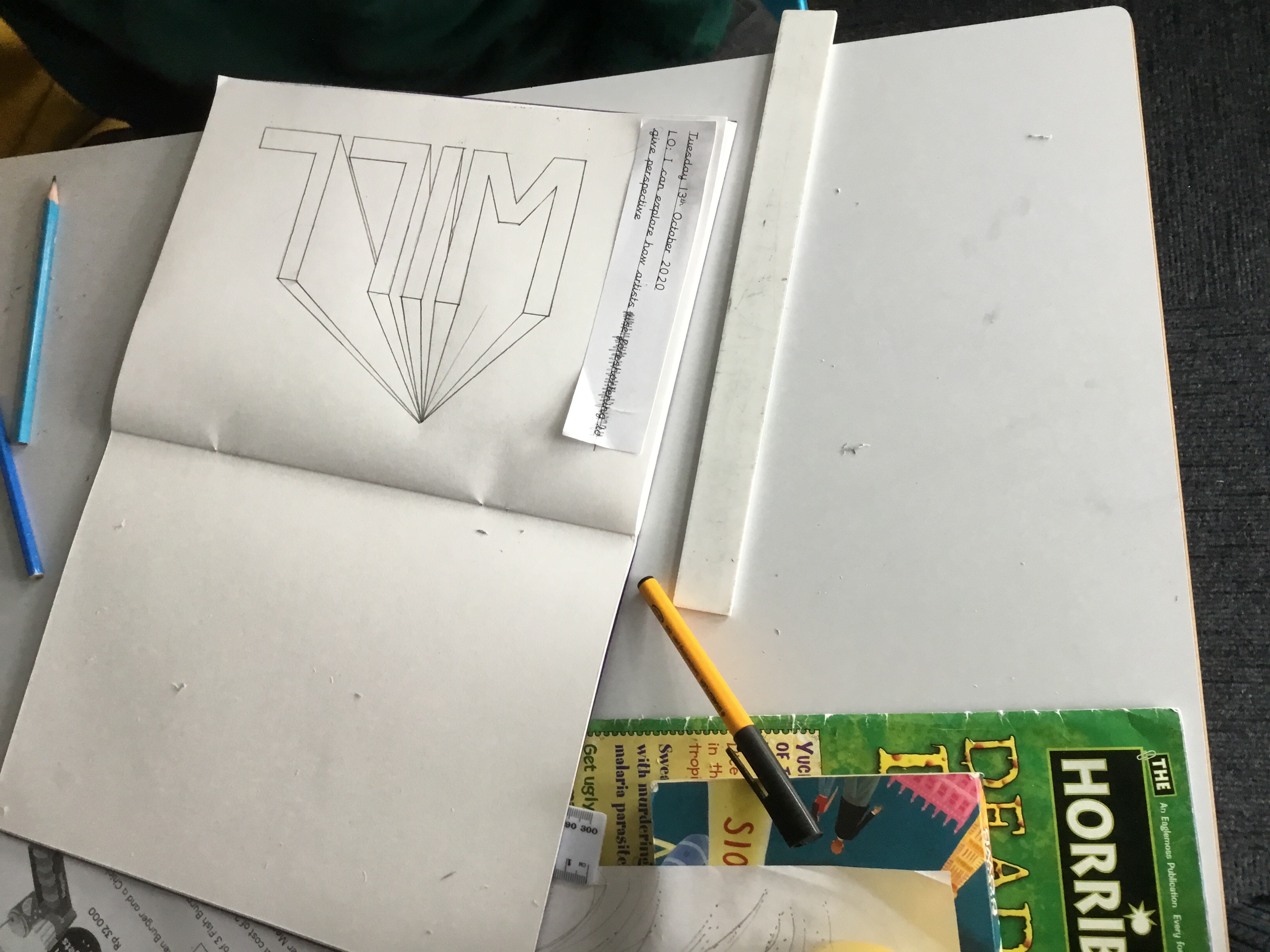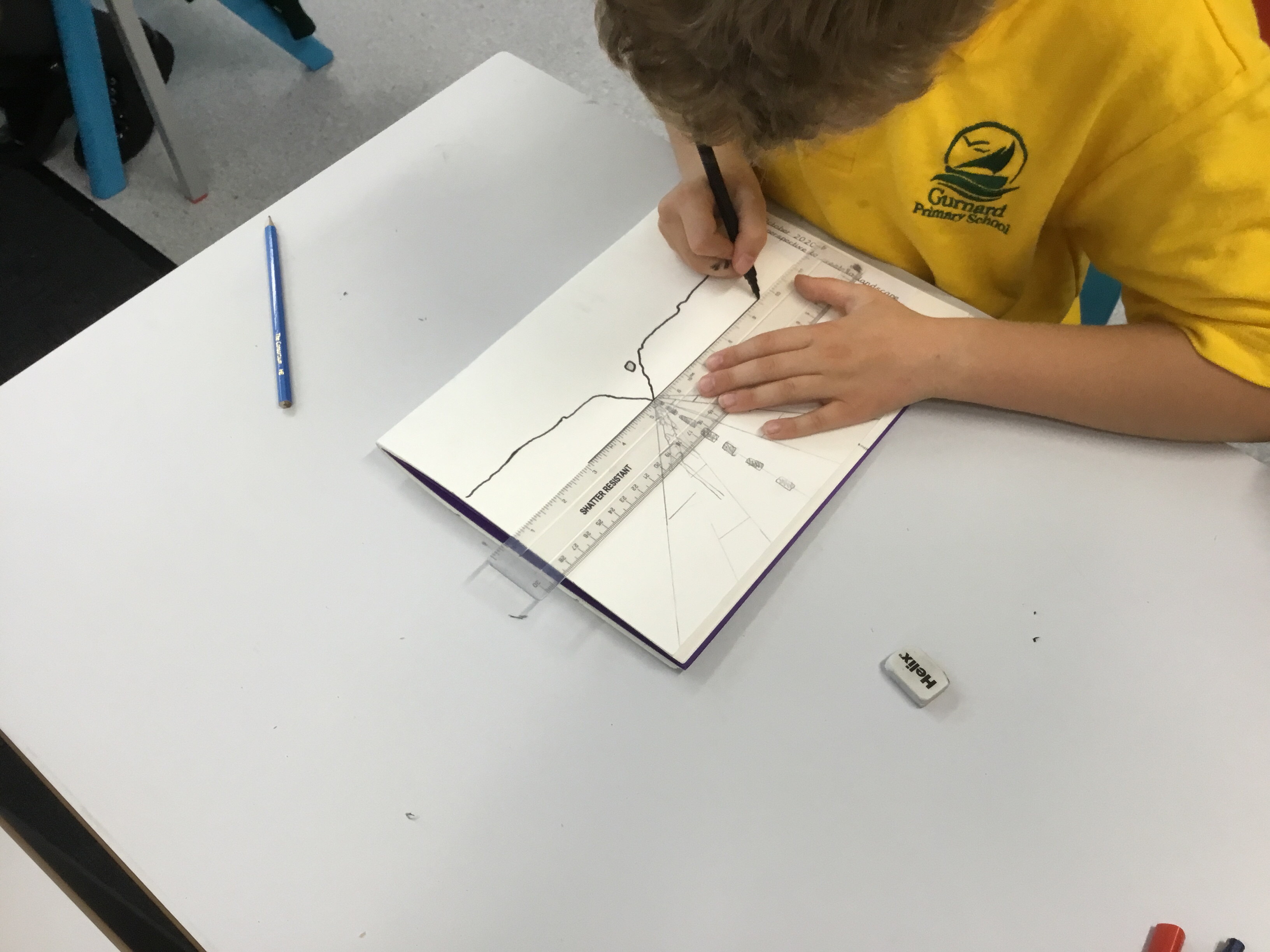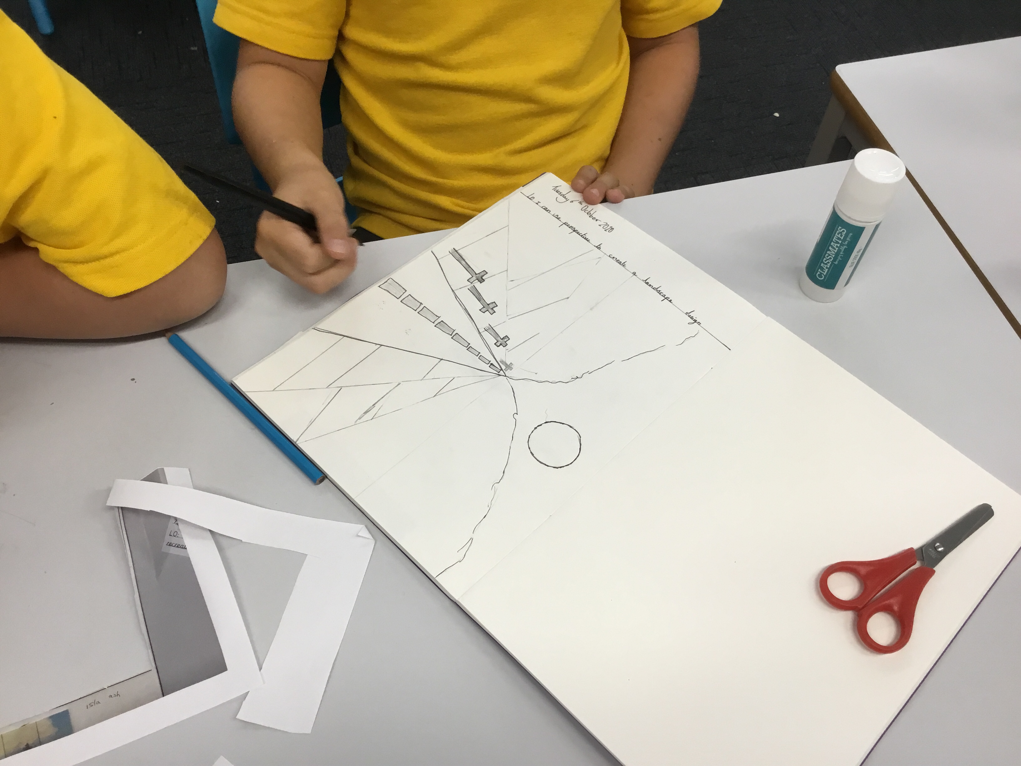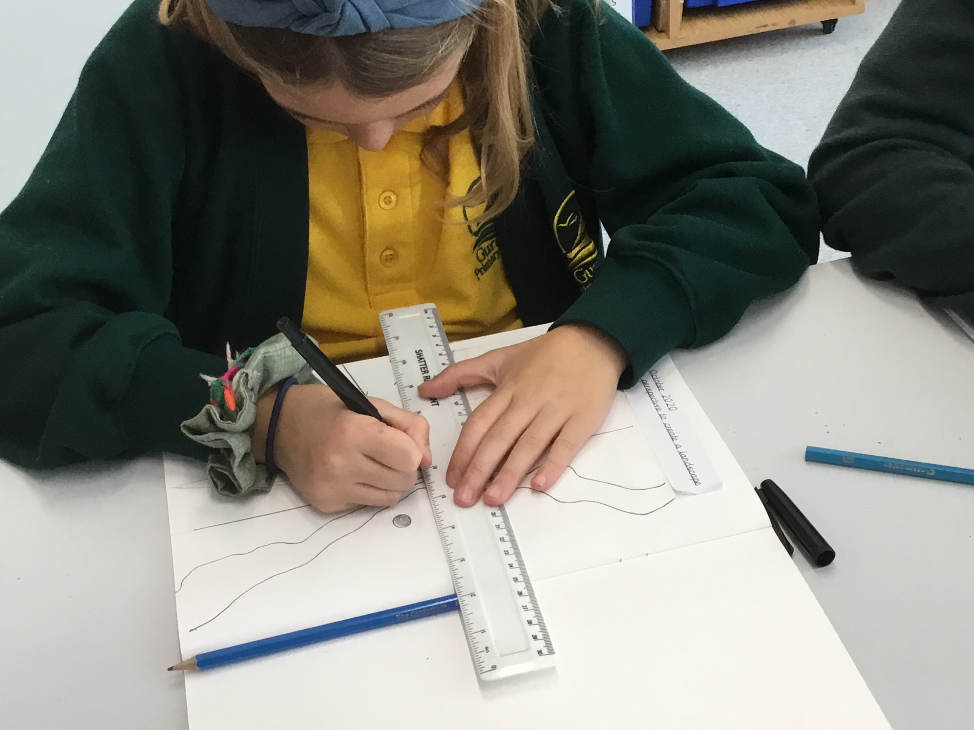 Year 5 sketched a landscape scene using perspective. They were shown step by step how to create the landscape so that they can apply perspective techniques to their own work. They used horizontal lines, vanishing points as well as sketching items in the foreground larger to show distance.