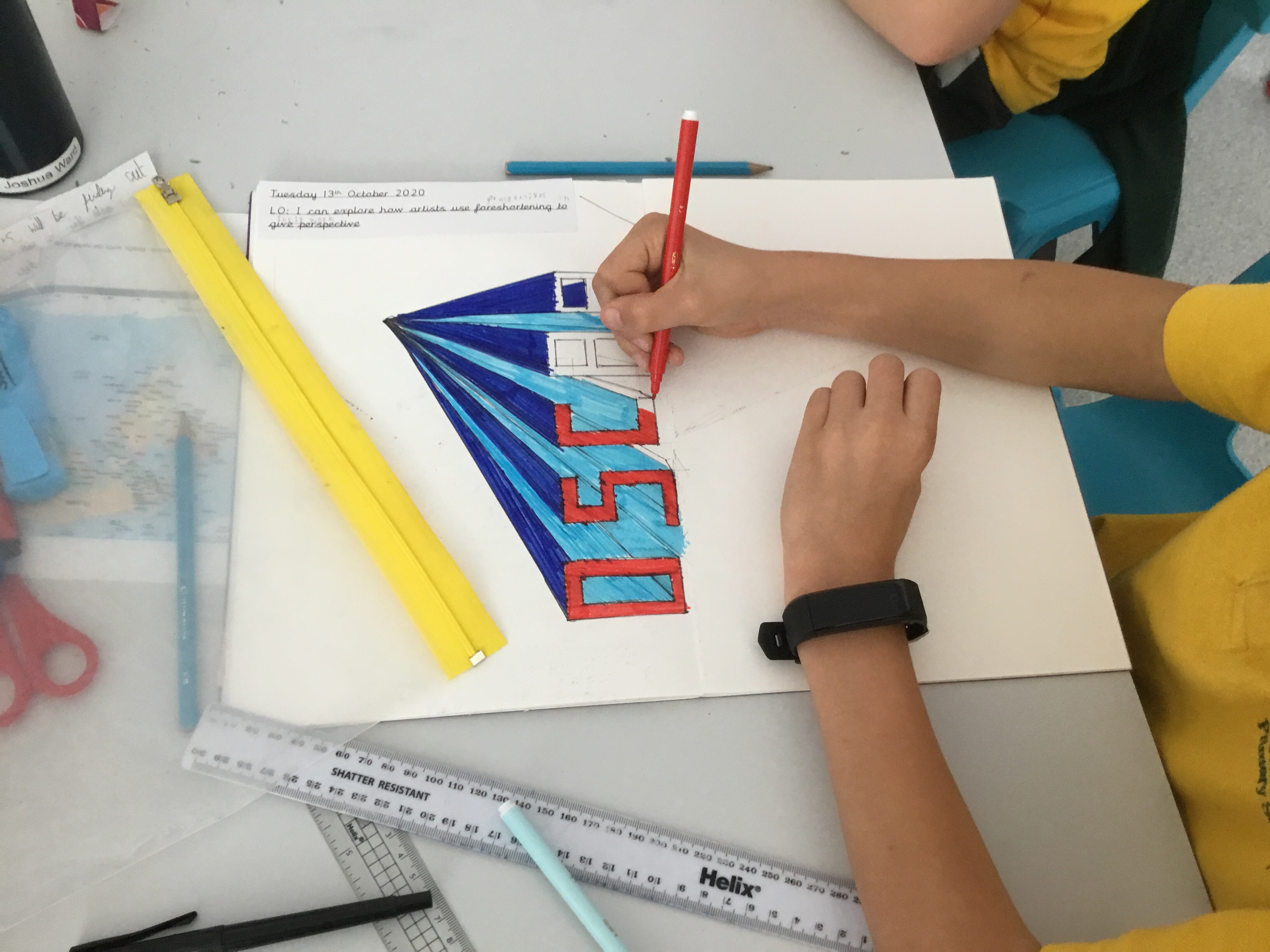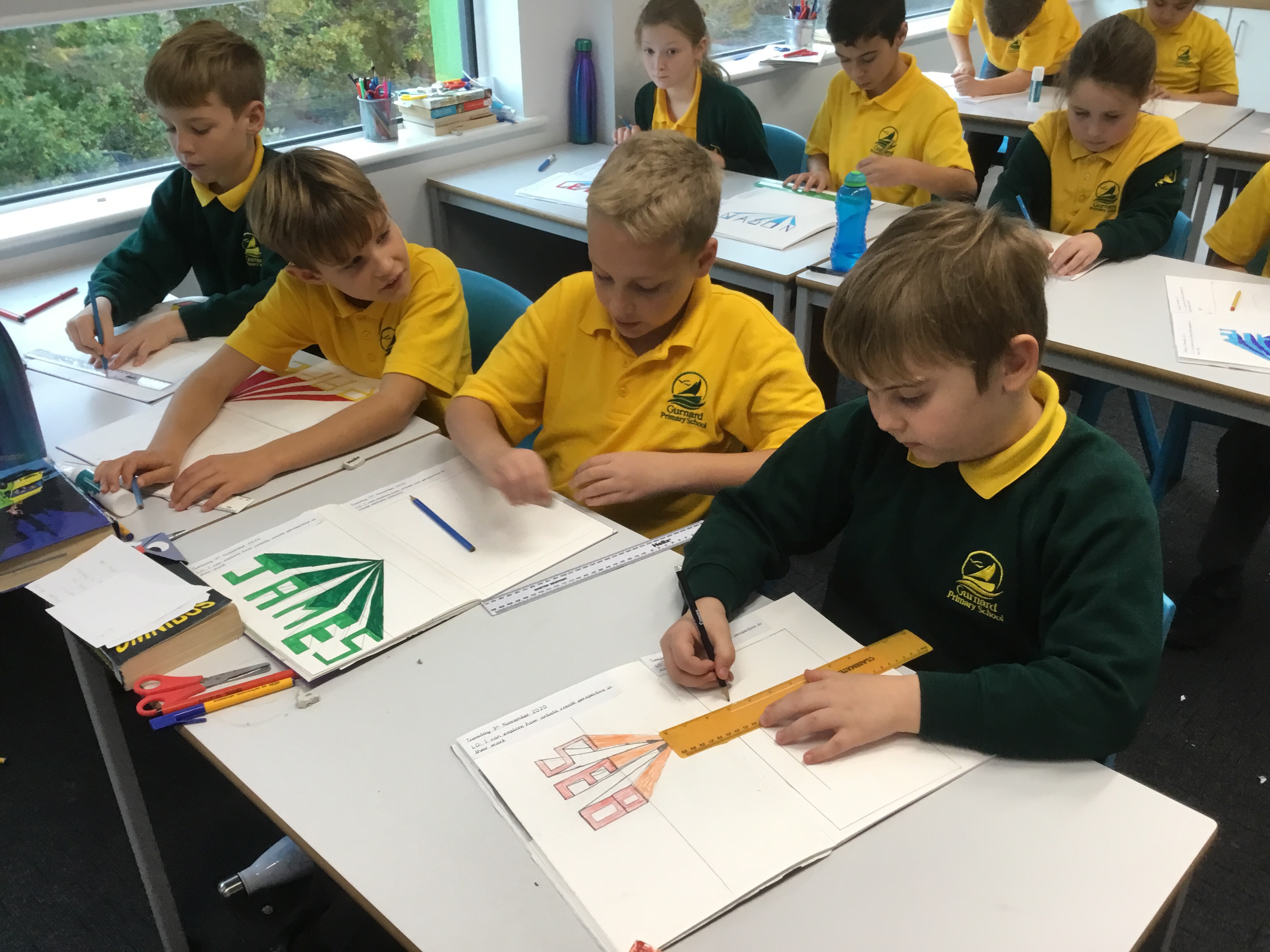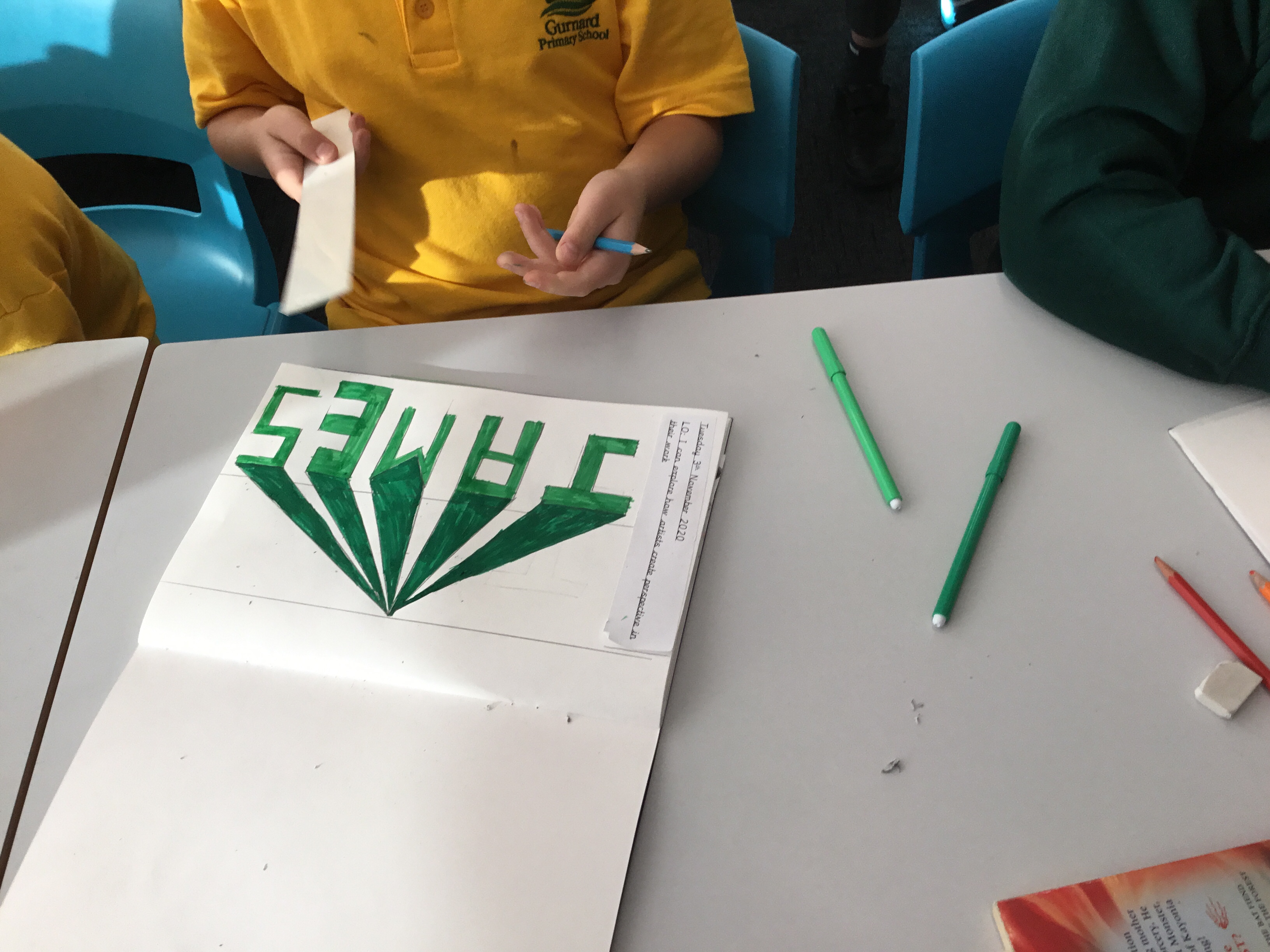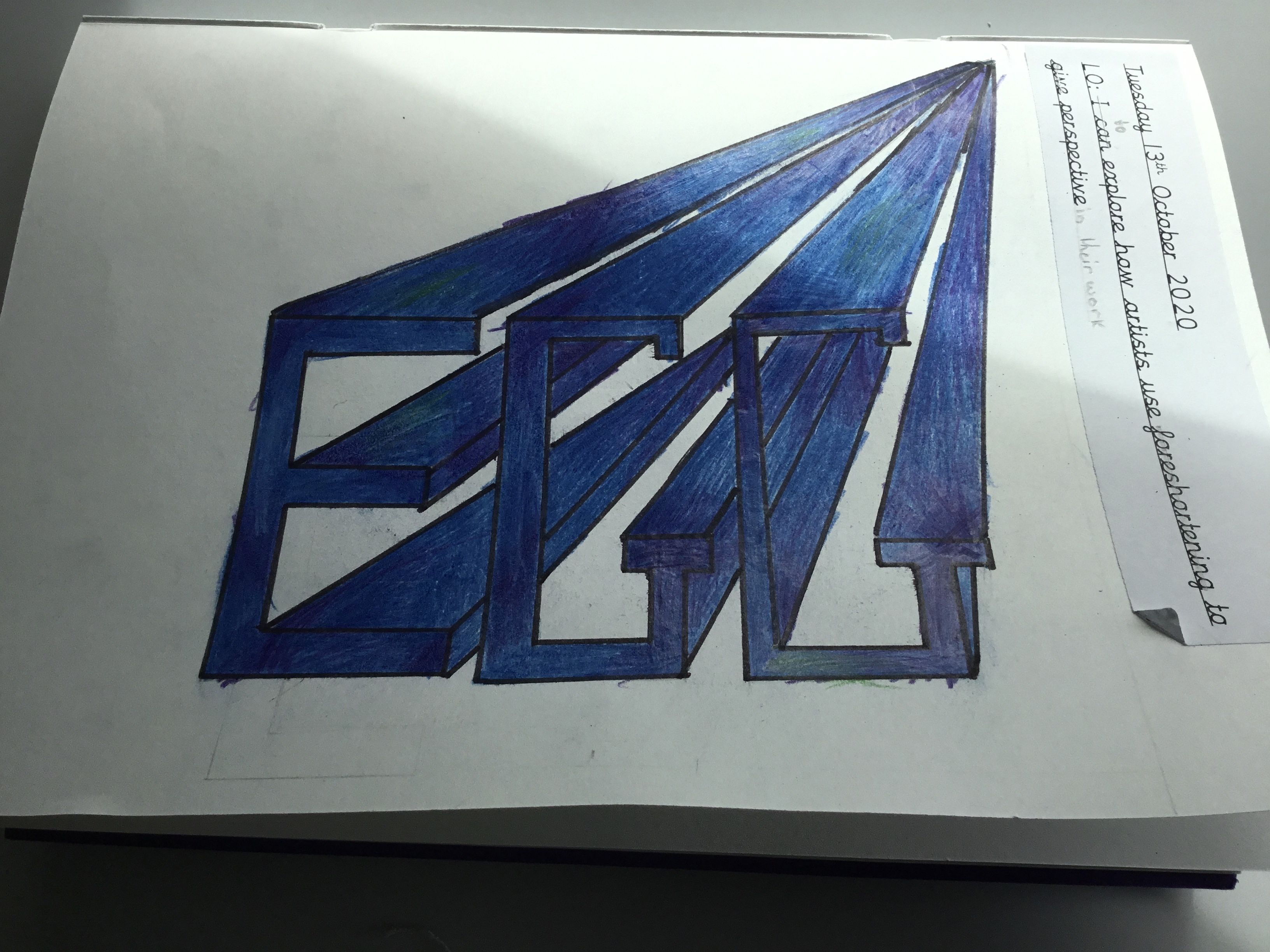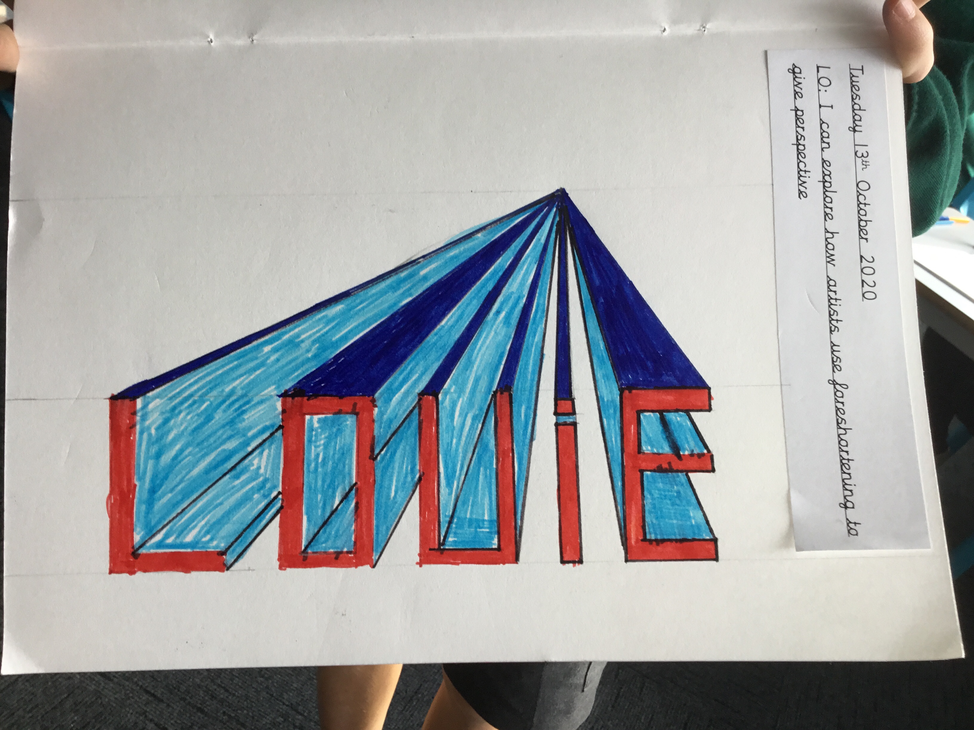 Year 5 continued to explore perspective and how artists use perspective by using vanishing points to create a 3D version of their names. Some fabulous work.