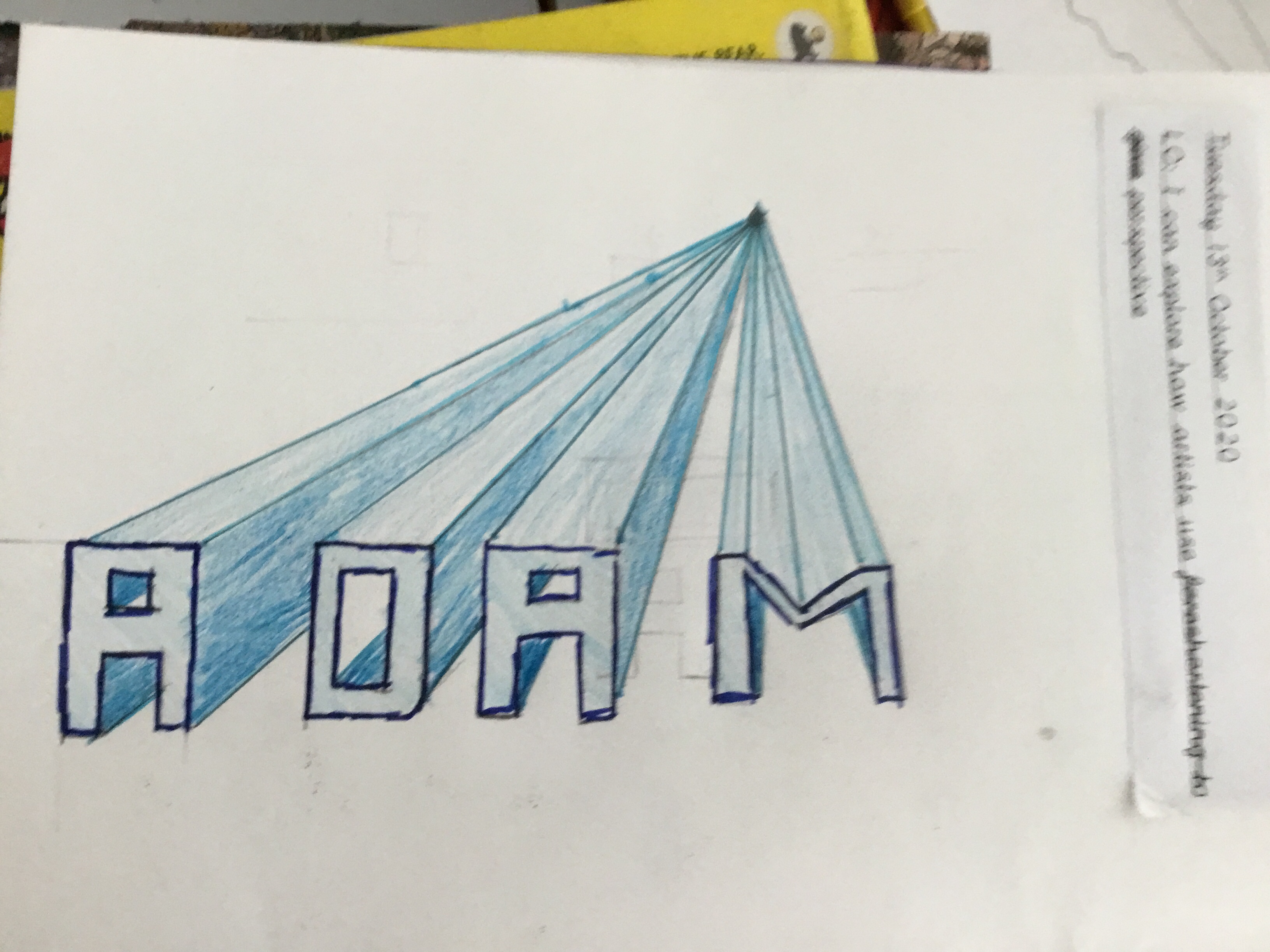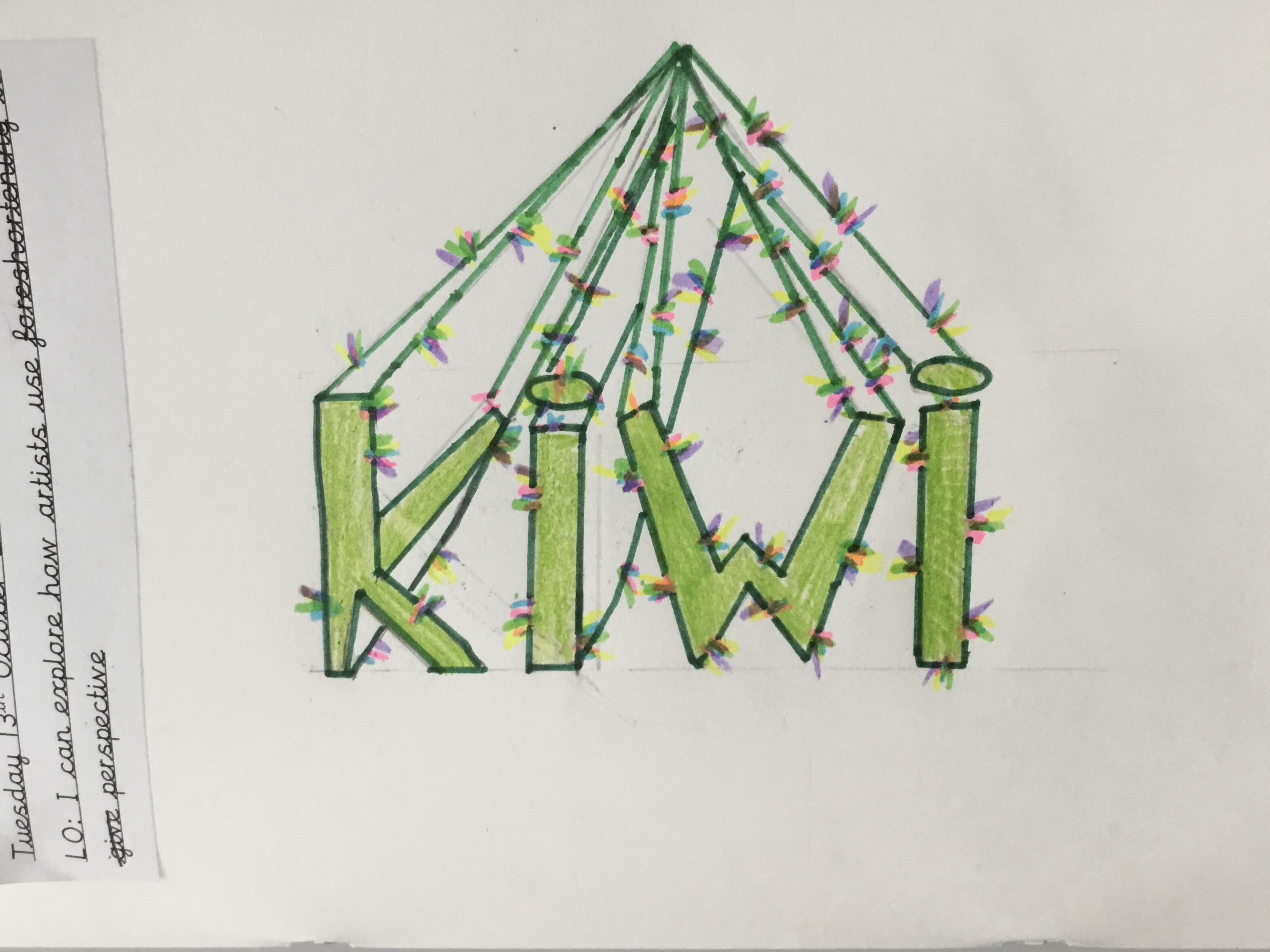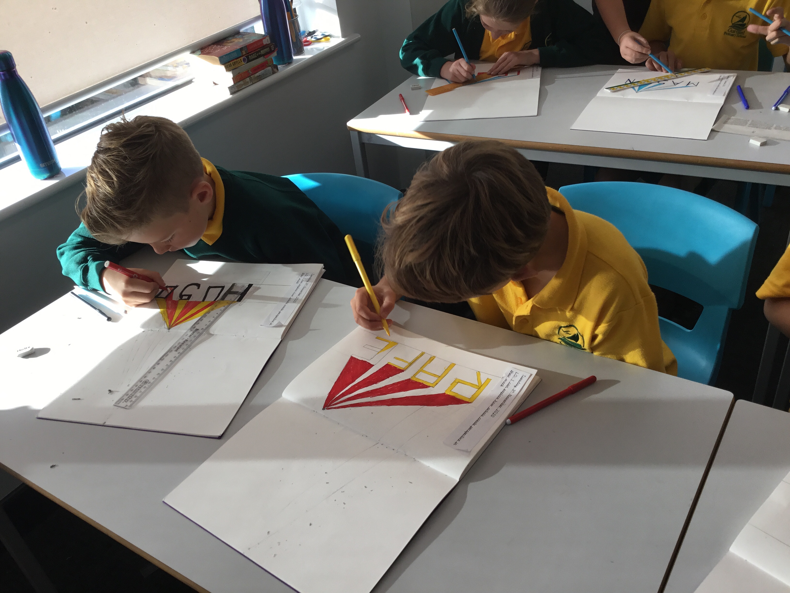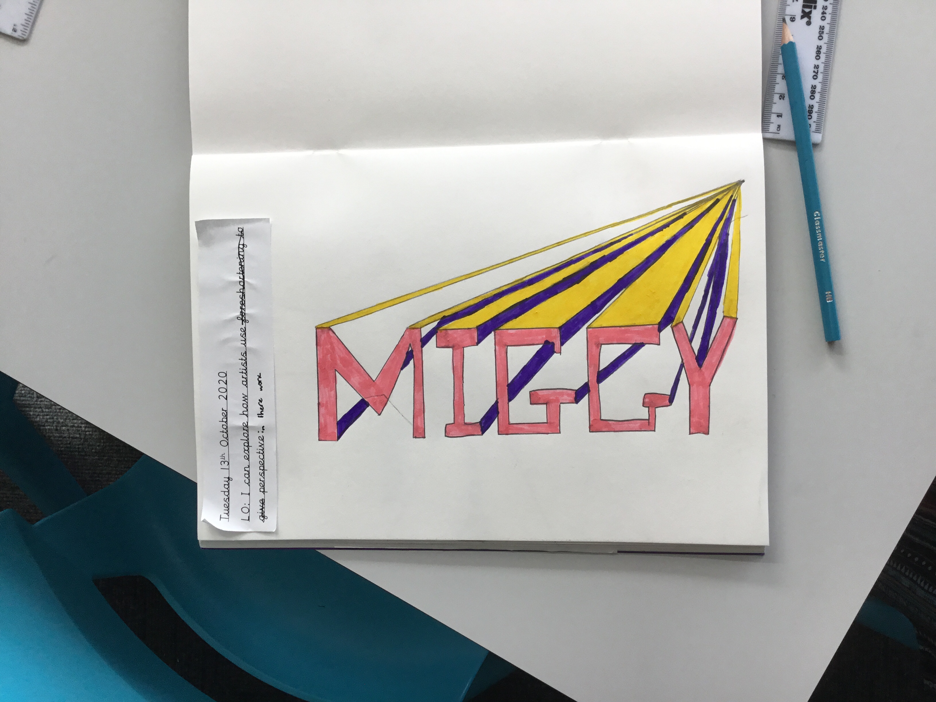 Year 5 continued to explore perspective and how artists use perspective by using vanishing points to create a 3D version of their names. Some fabulous work.