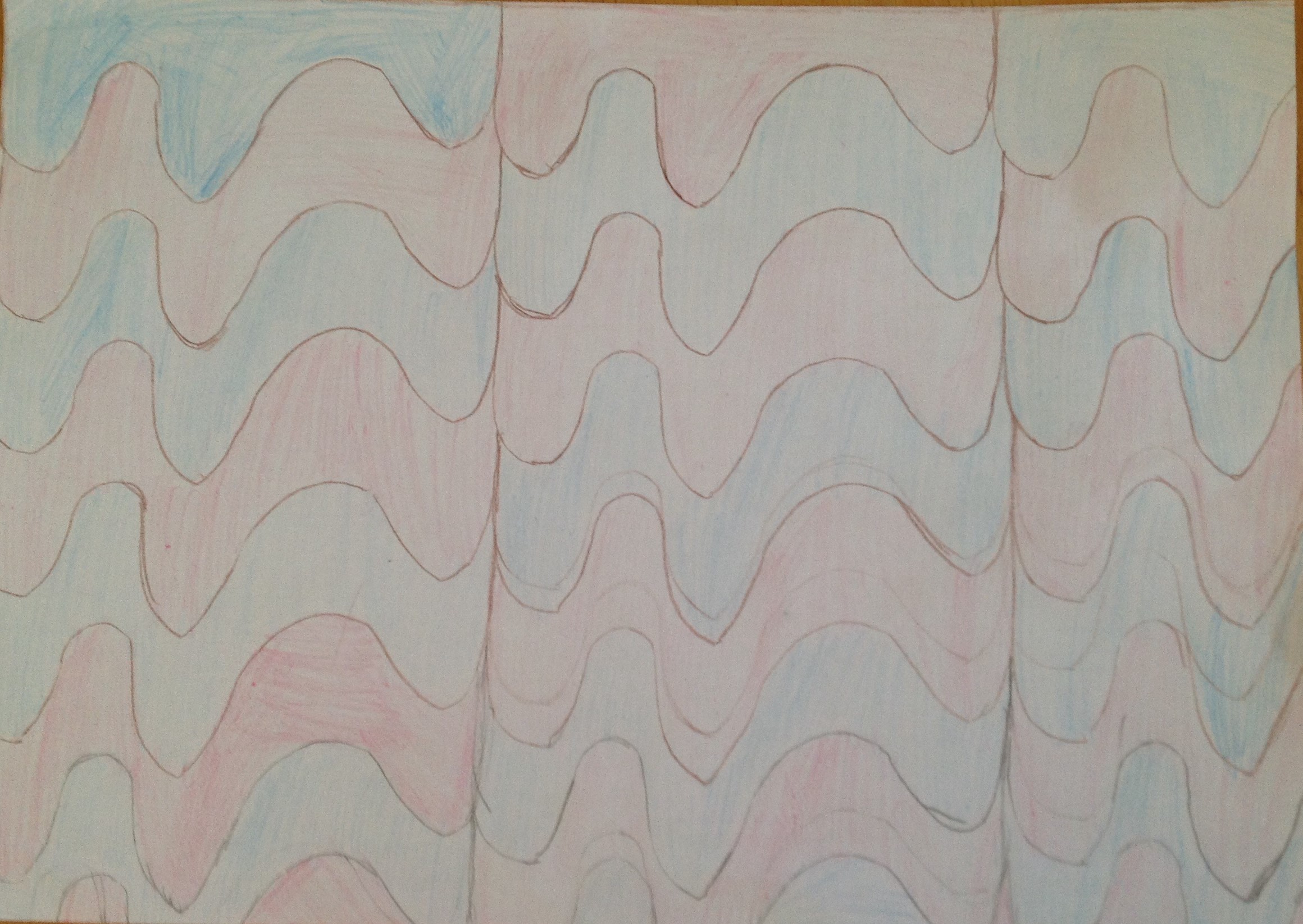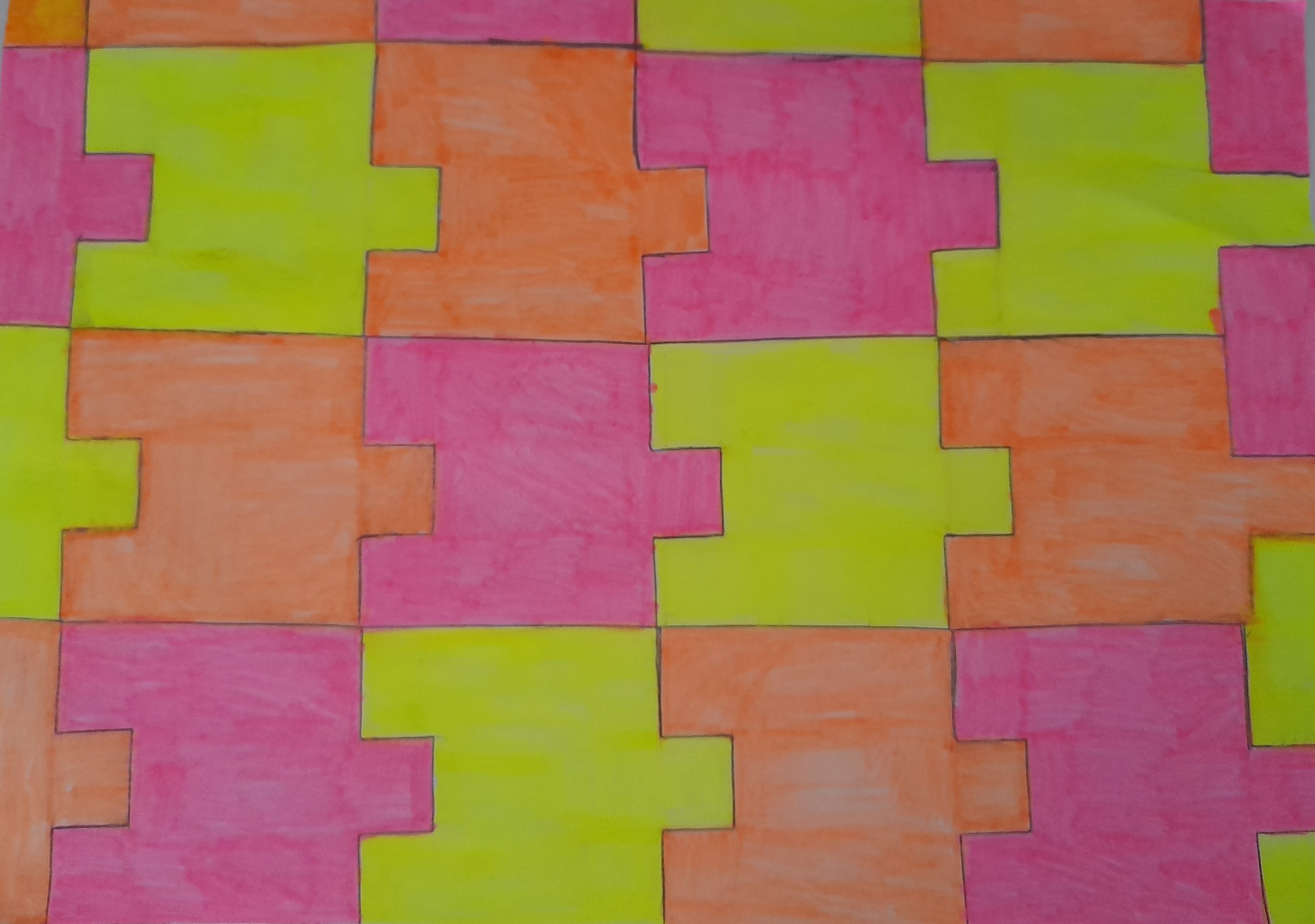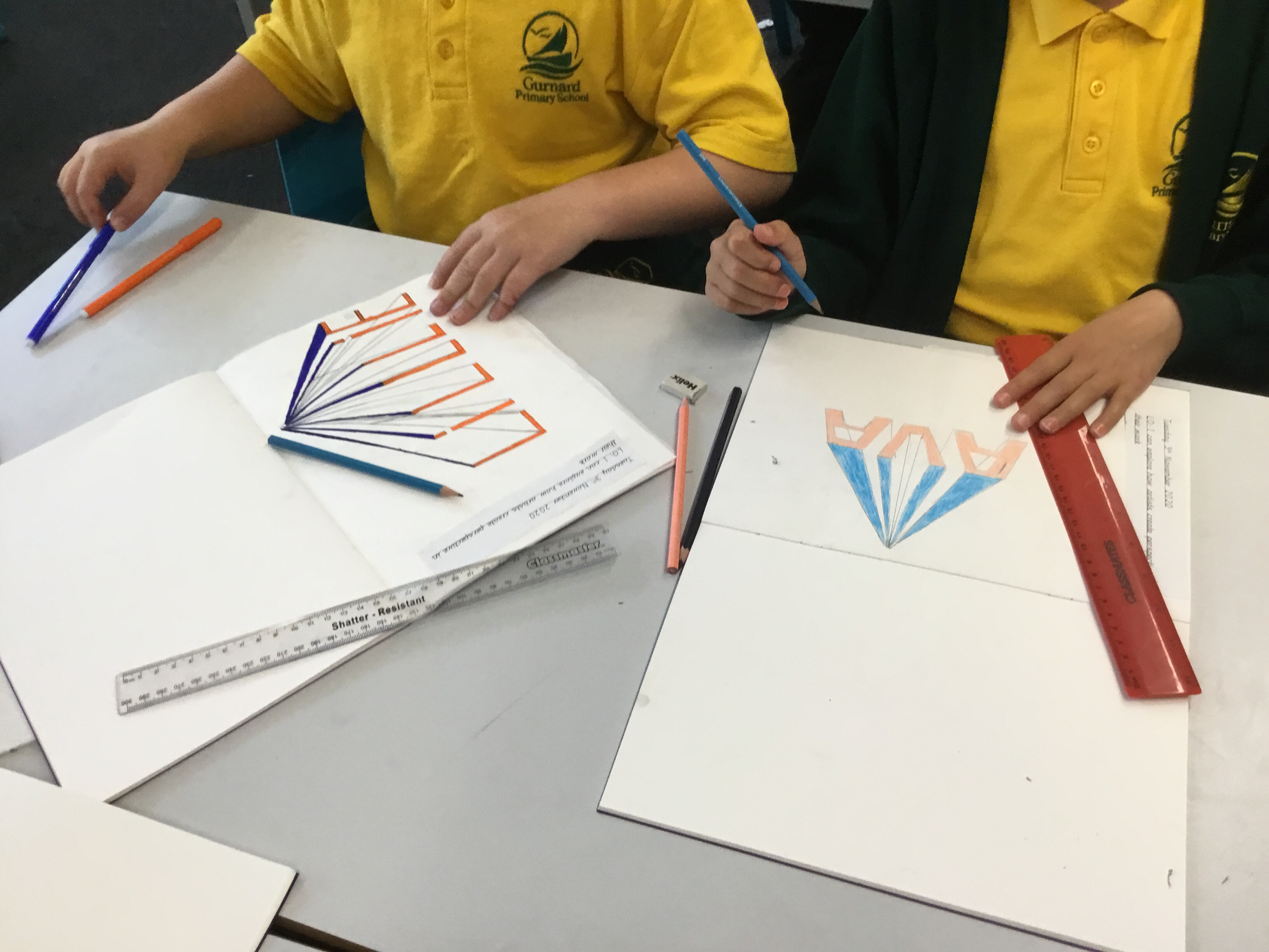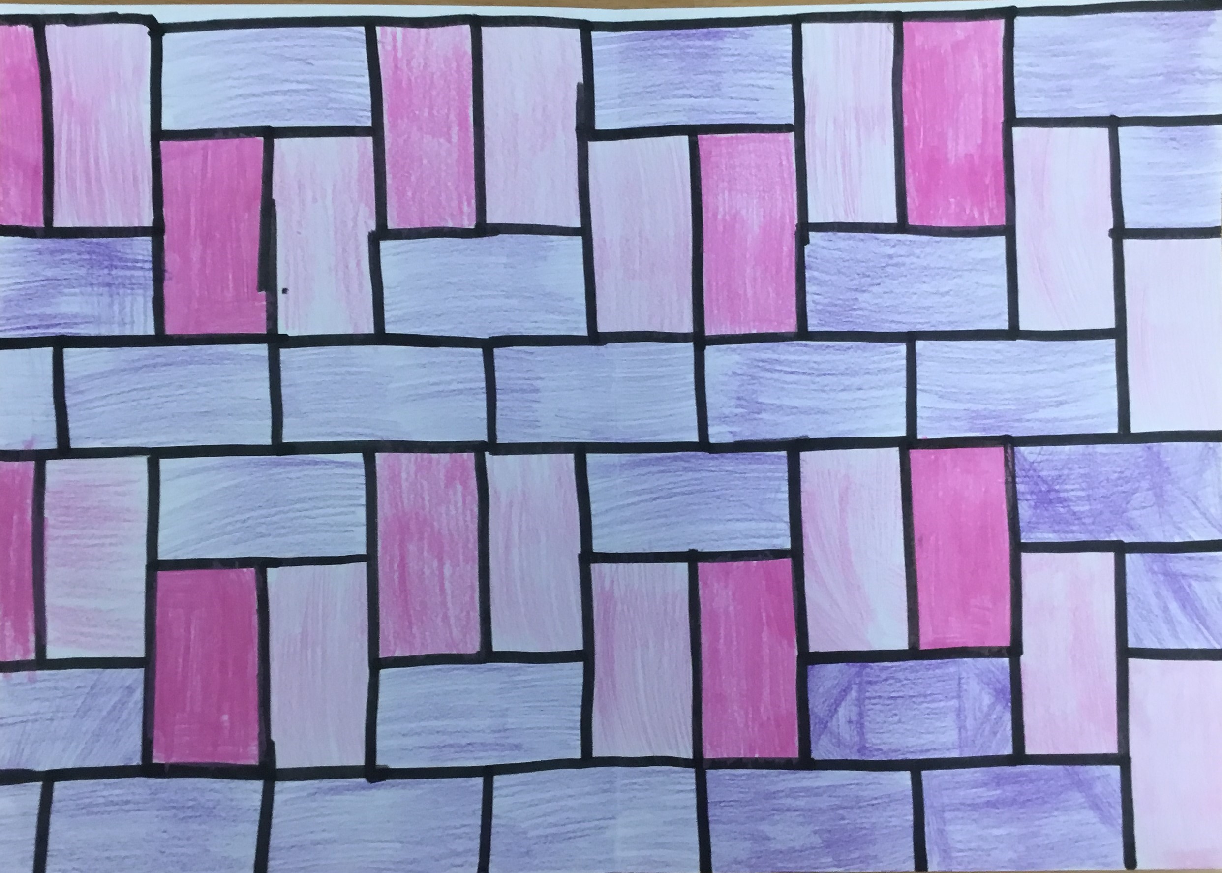The children traced around their hands, then they drew lines, joining them up inside the hand. They then chose at least 3 colours which they then alternated to create some very effective illusions.