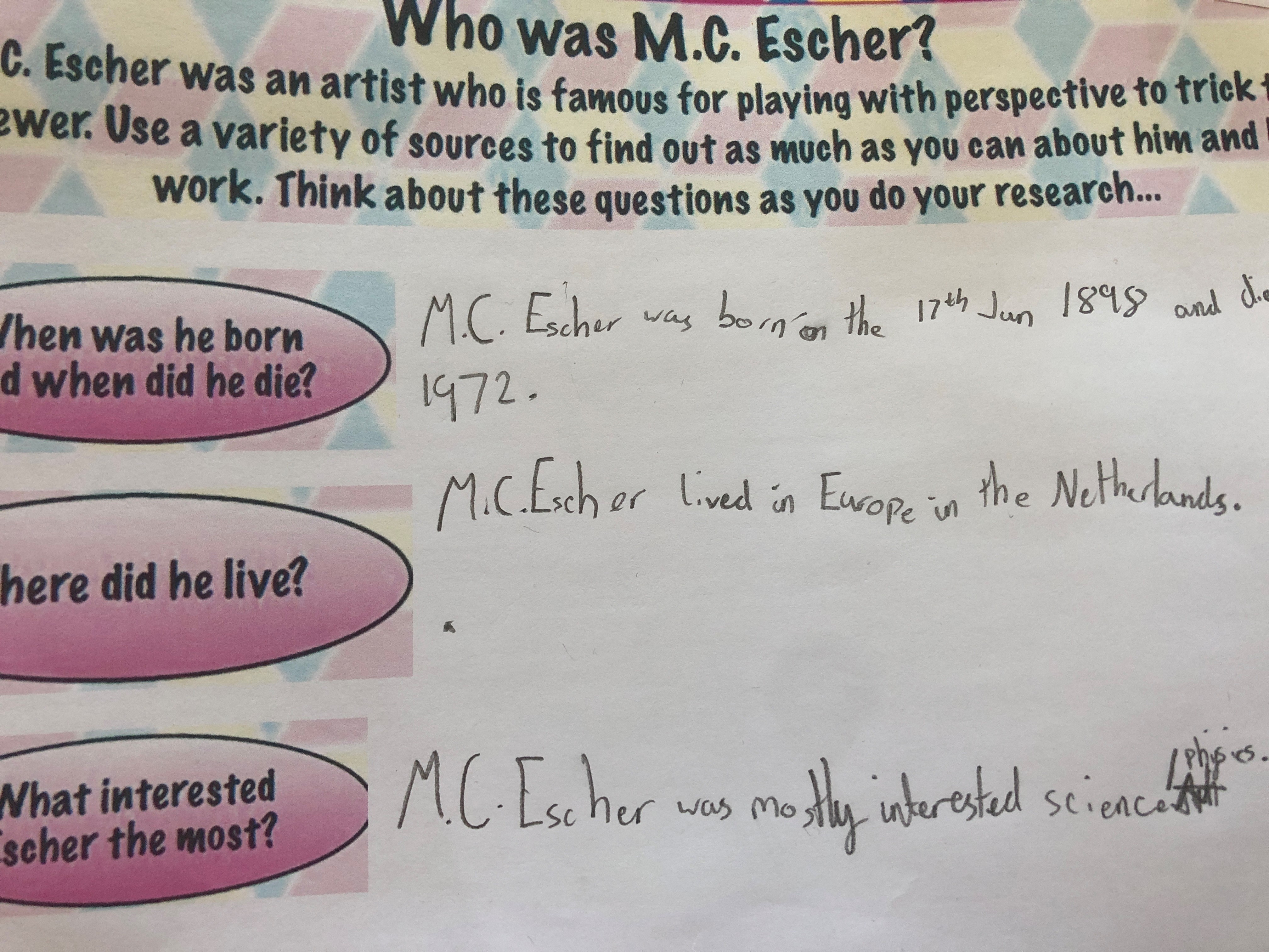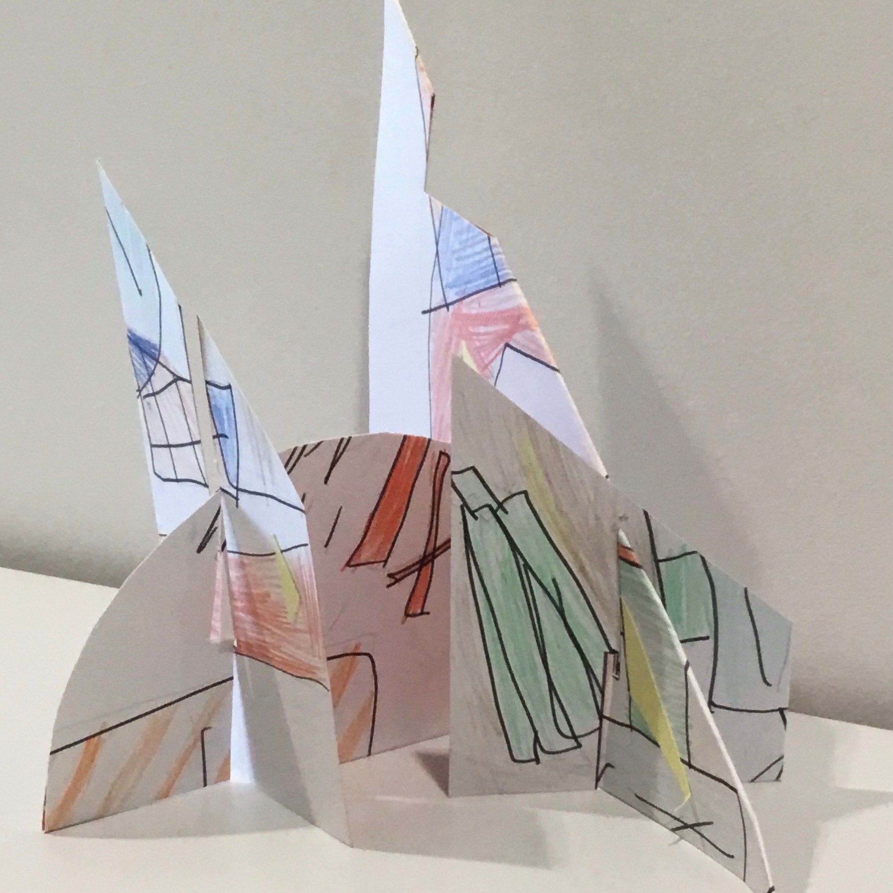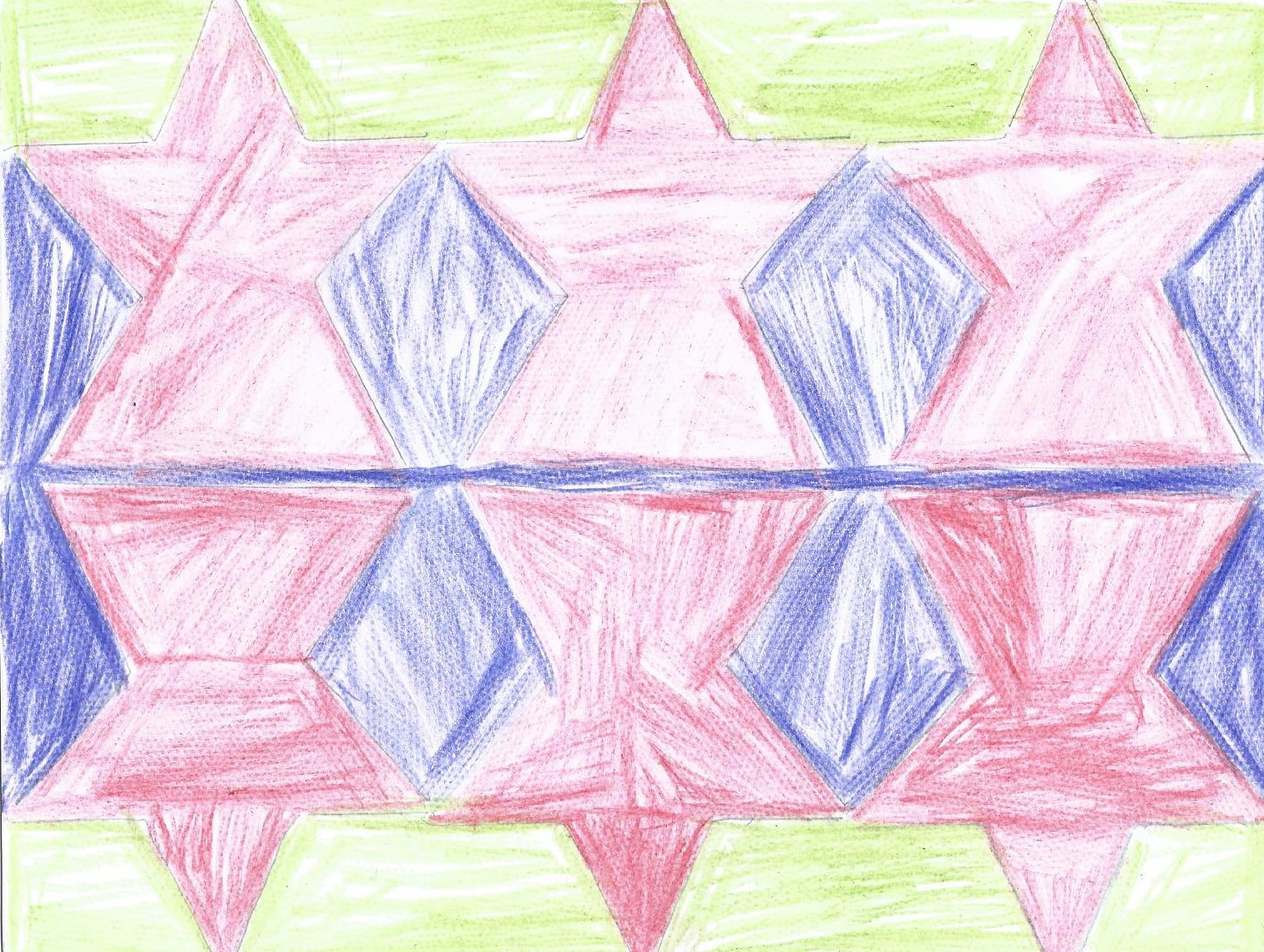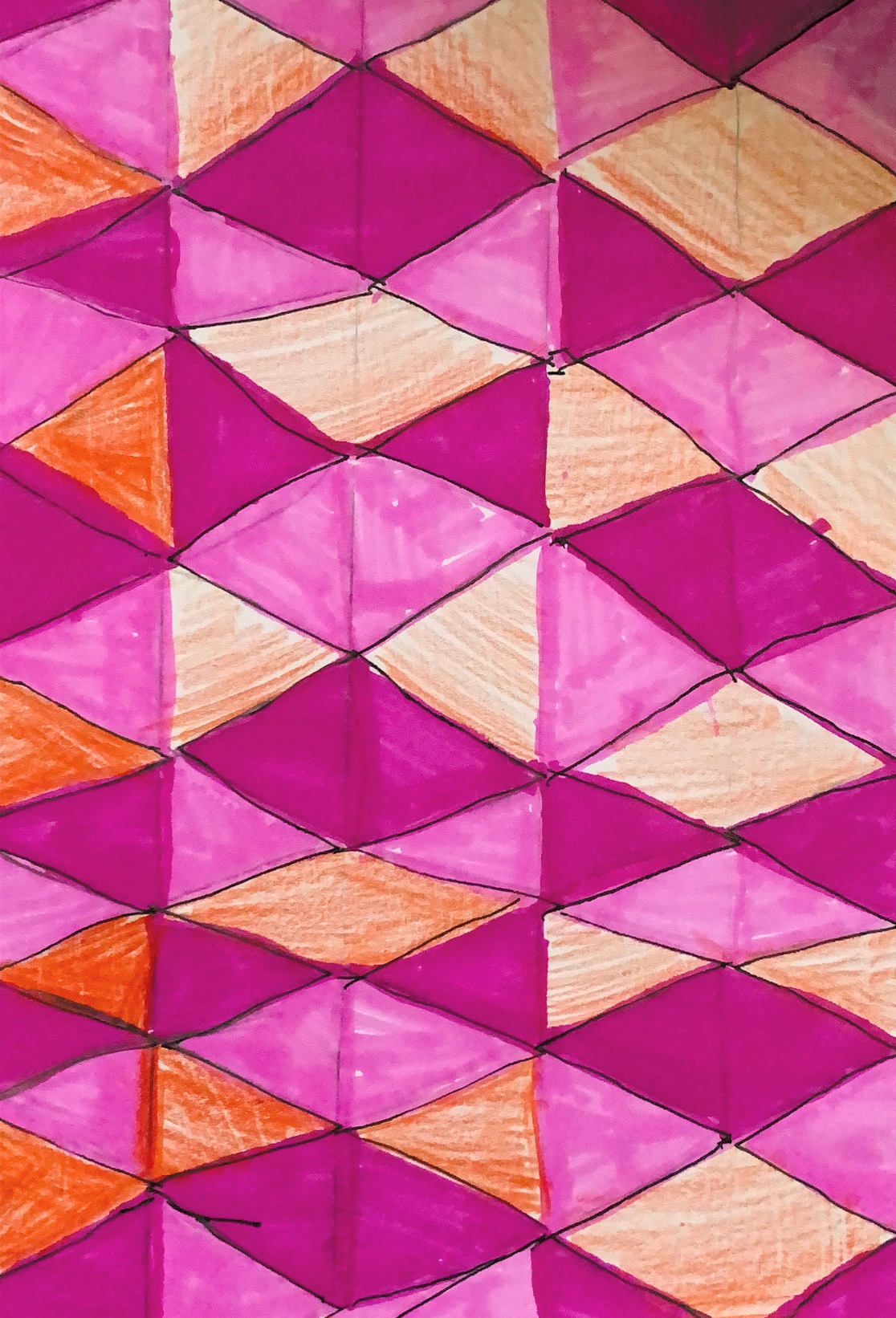 The children traced around their hands, then they drew lines, joining them up inside the hand. They then chose at least 3 colours which they then alternated to create some very effective illusions.