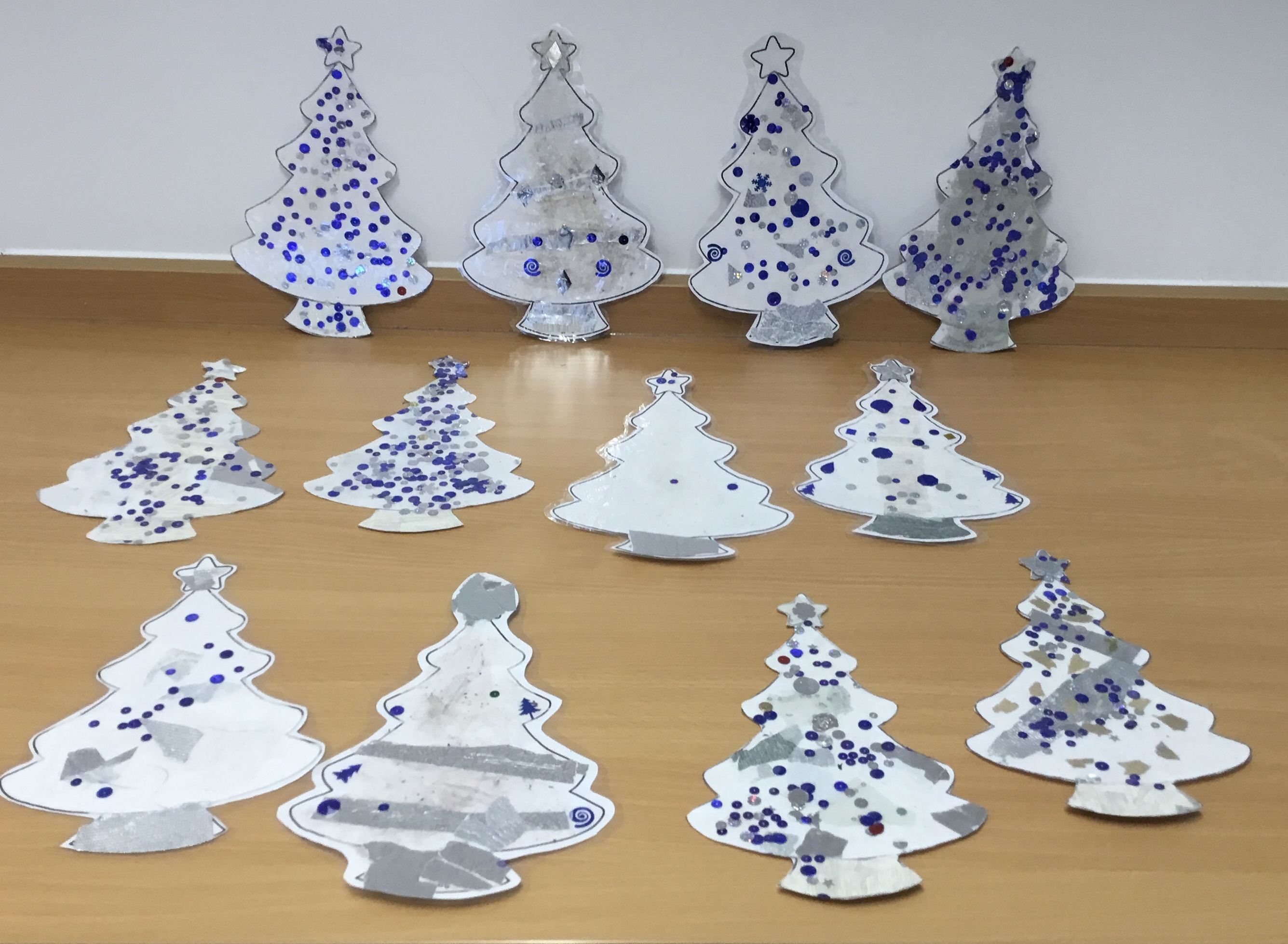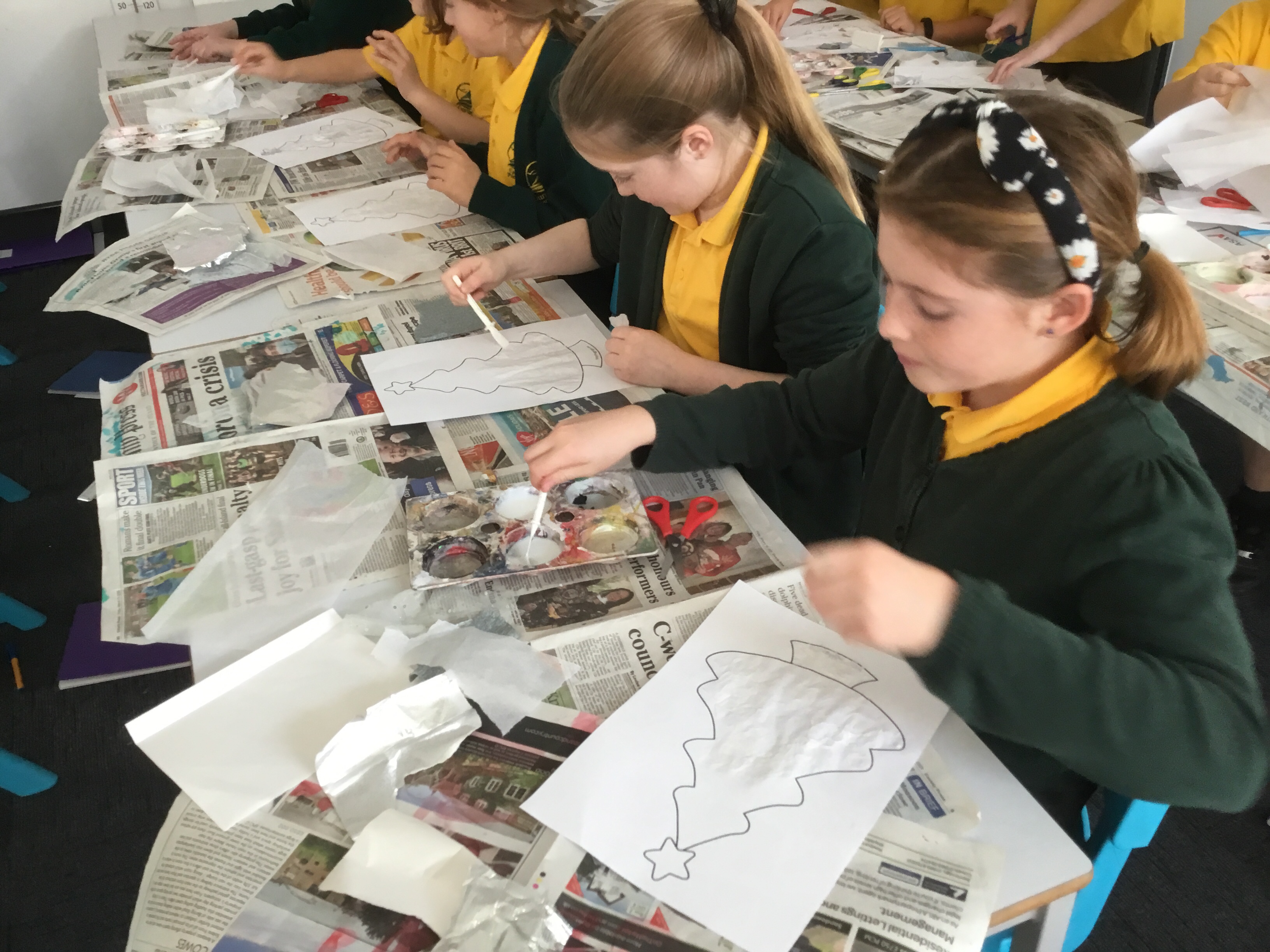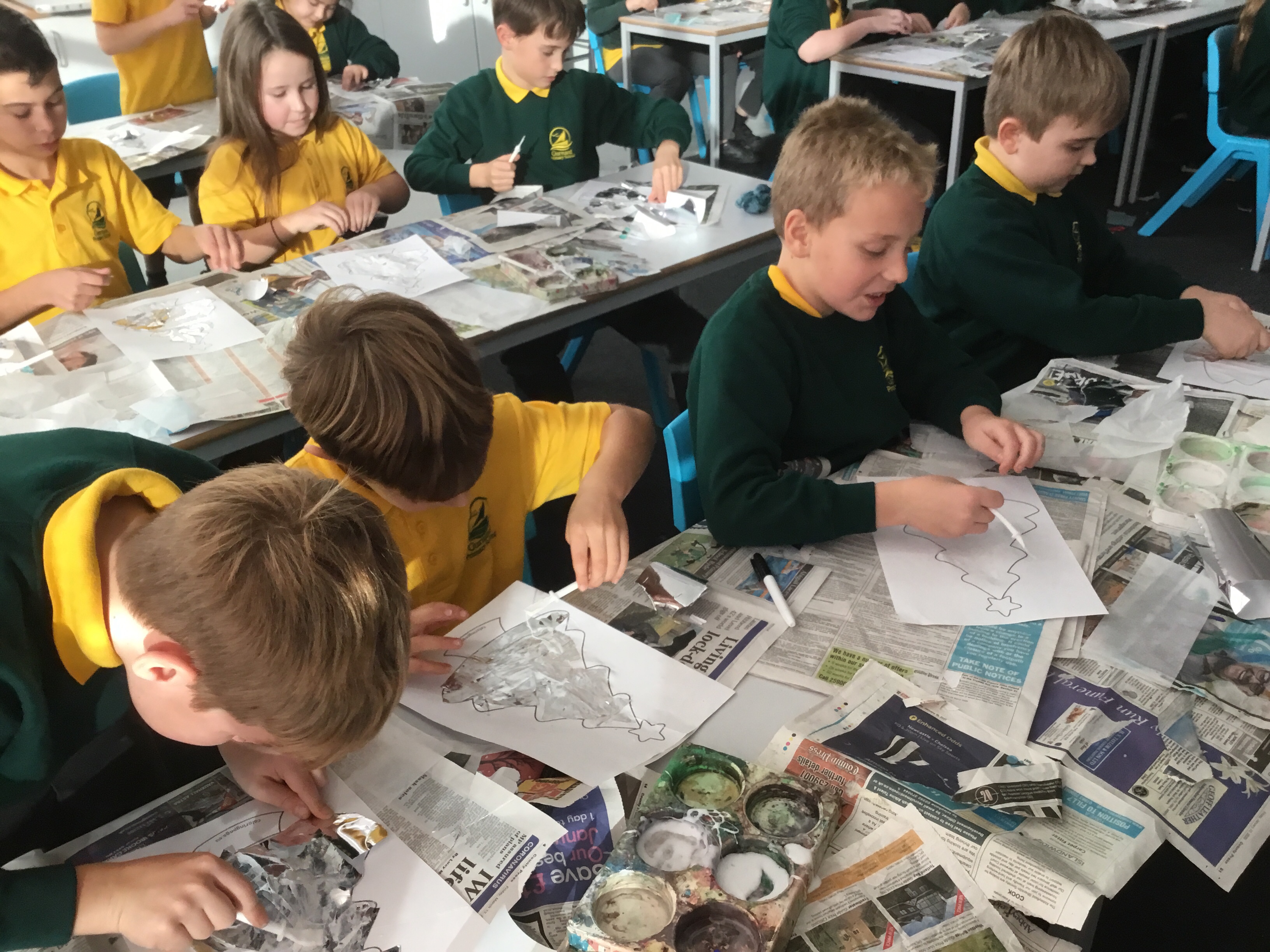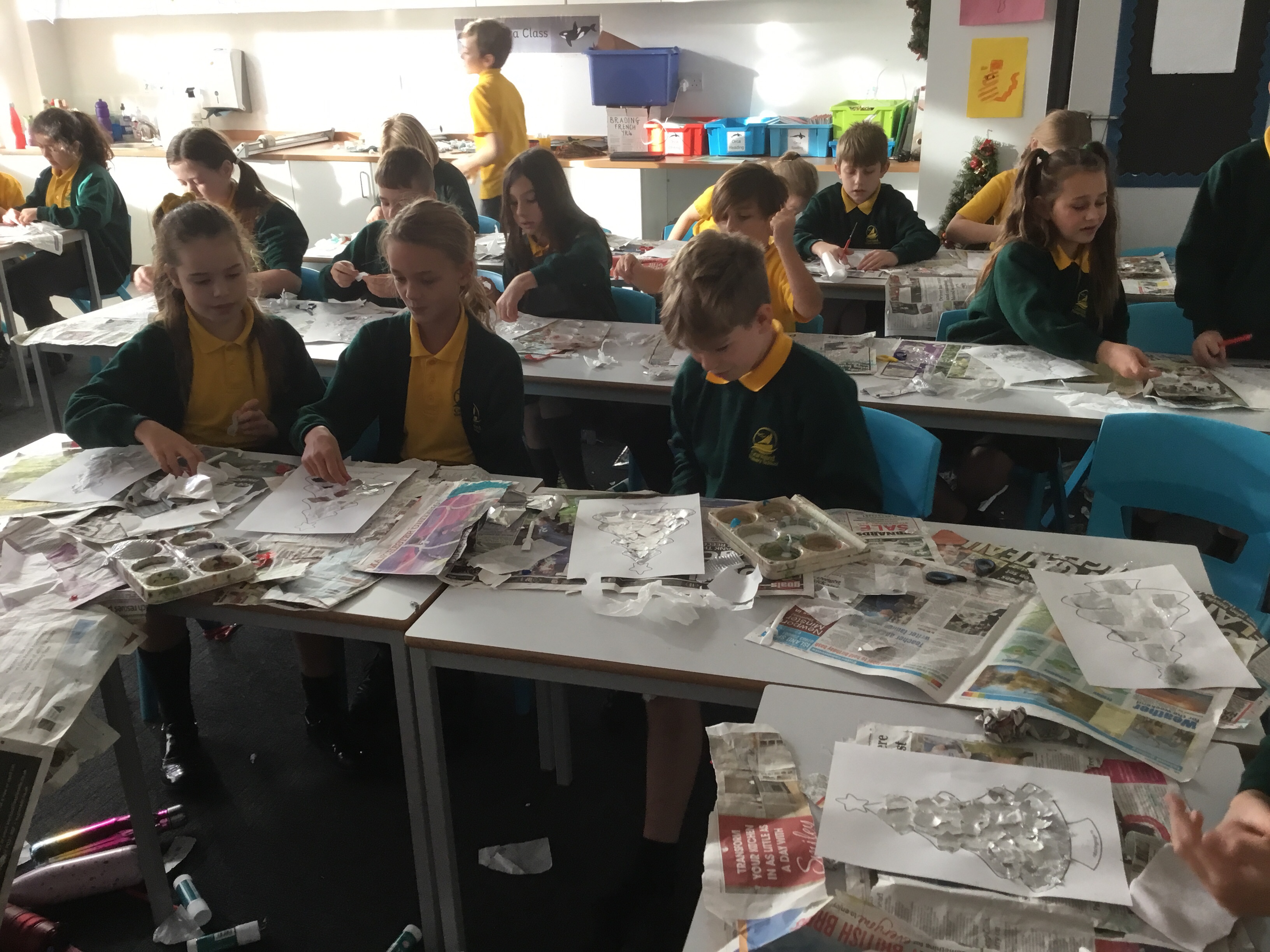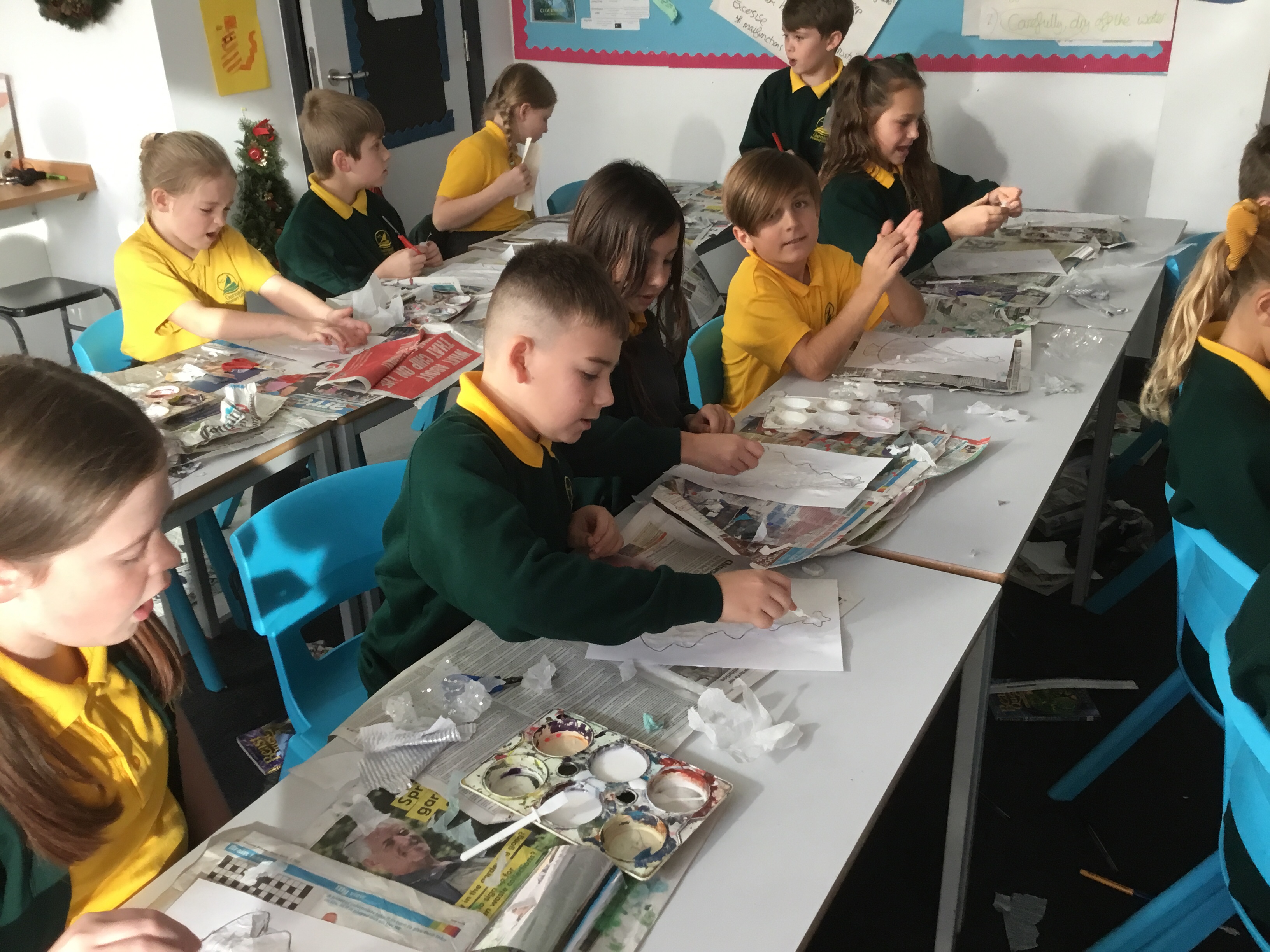 Year 5 created a Christmas tree collage using white tissue paper and silver paper and fabric. They then embellished their trees with silver and blue sparkles. The trees will be adding a splash of colour to the COVID testing centre in Newport.