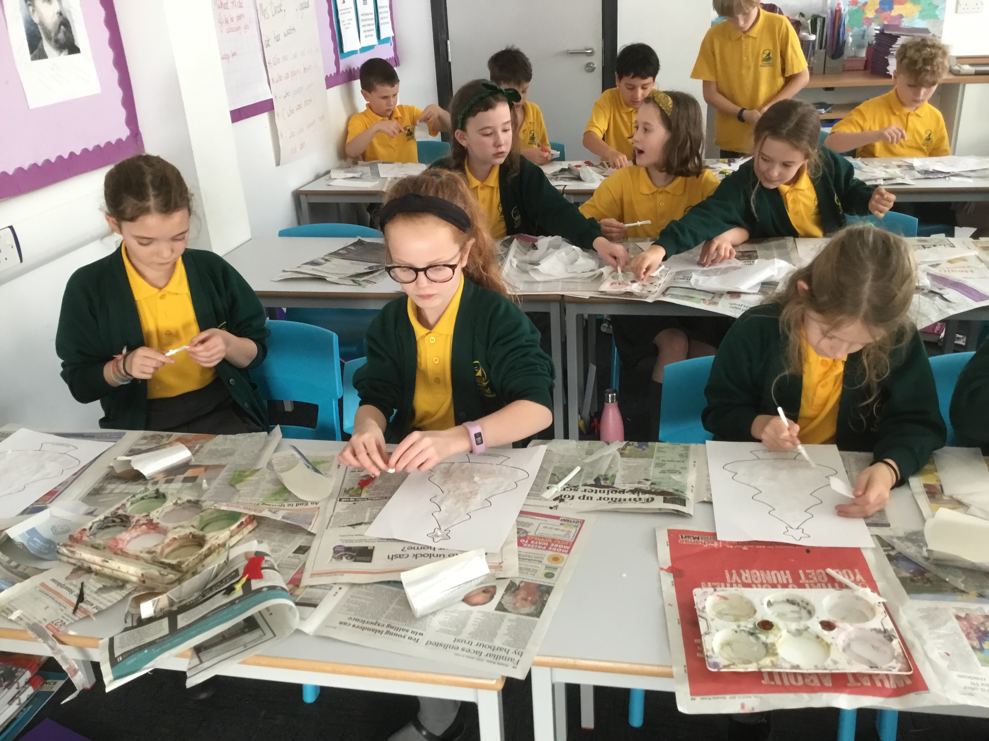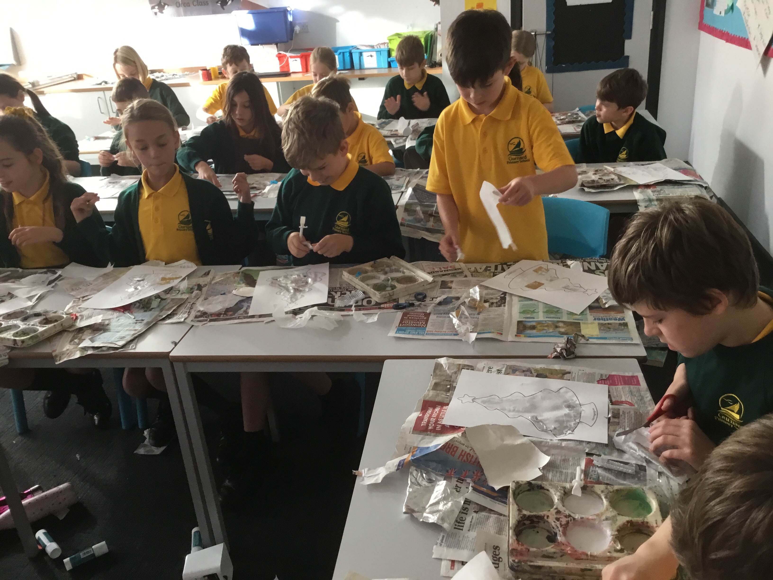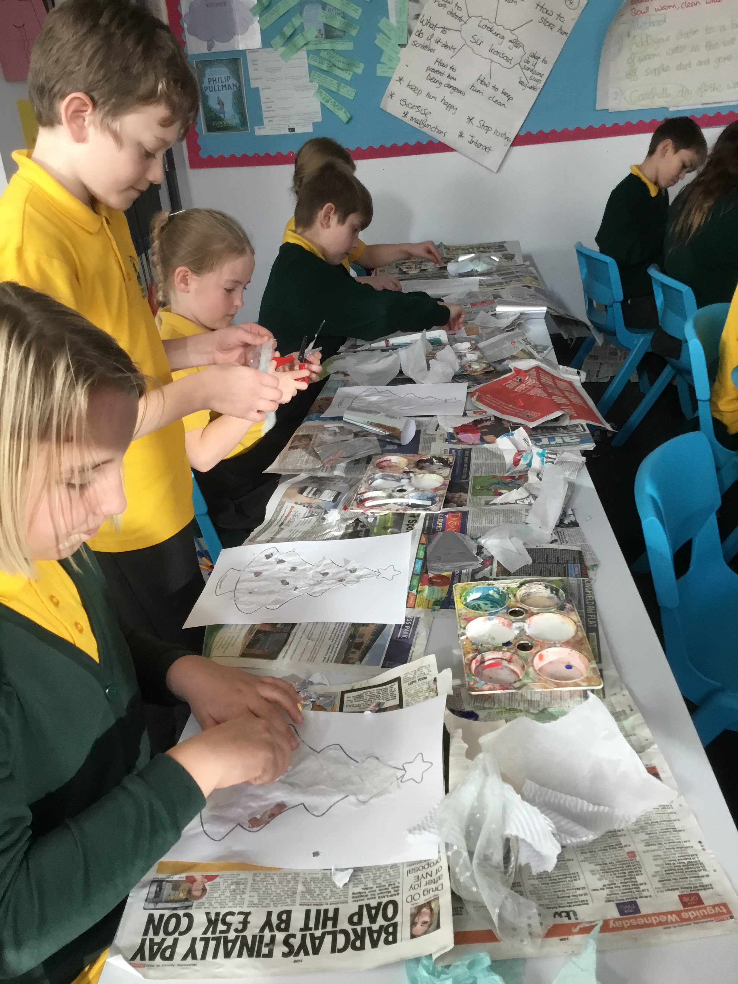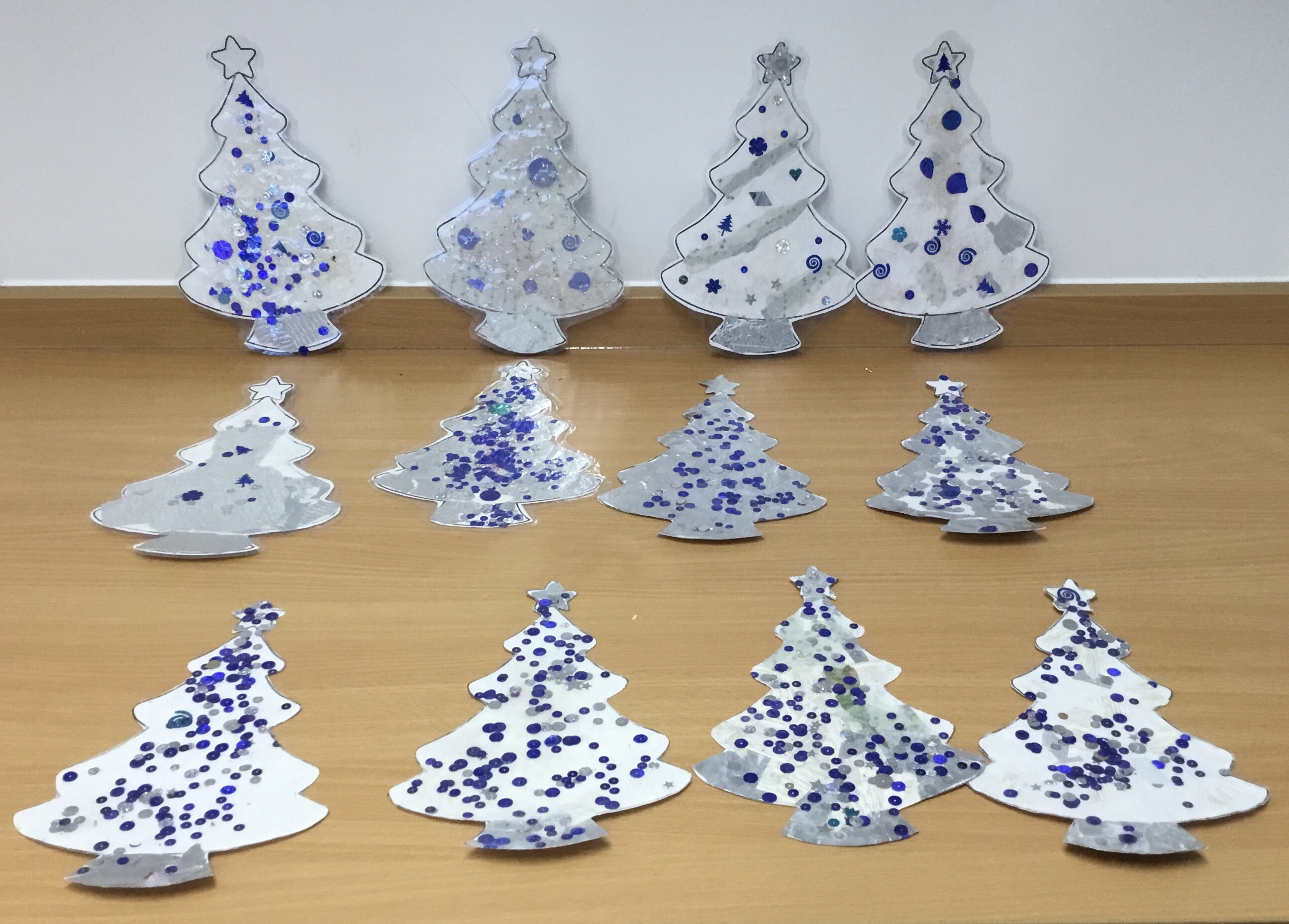 Year 5 created a Christmas tree collage using white tissue paper and silver paper and fabric. They then embellished their trees with silver and blue sparkles. The trees will be adding a splash of colour to the COVID testing centre in Newport.