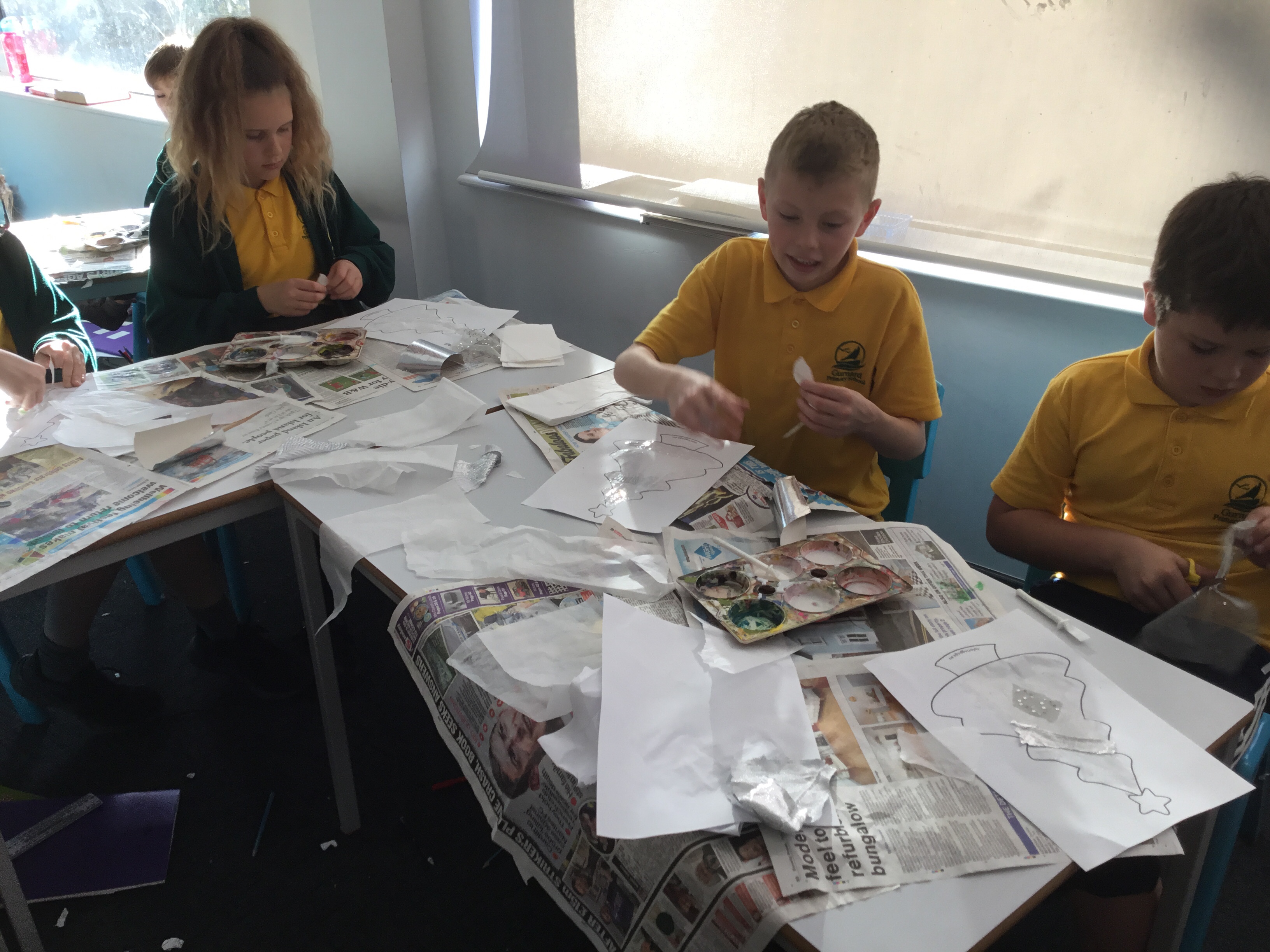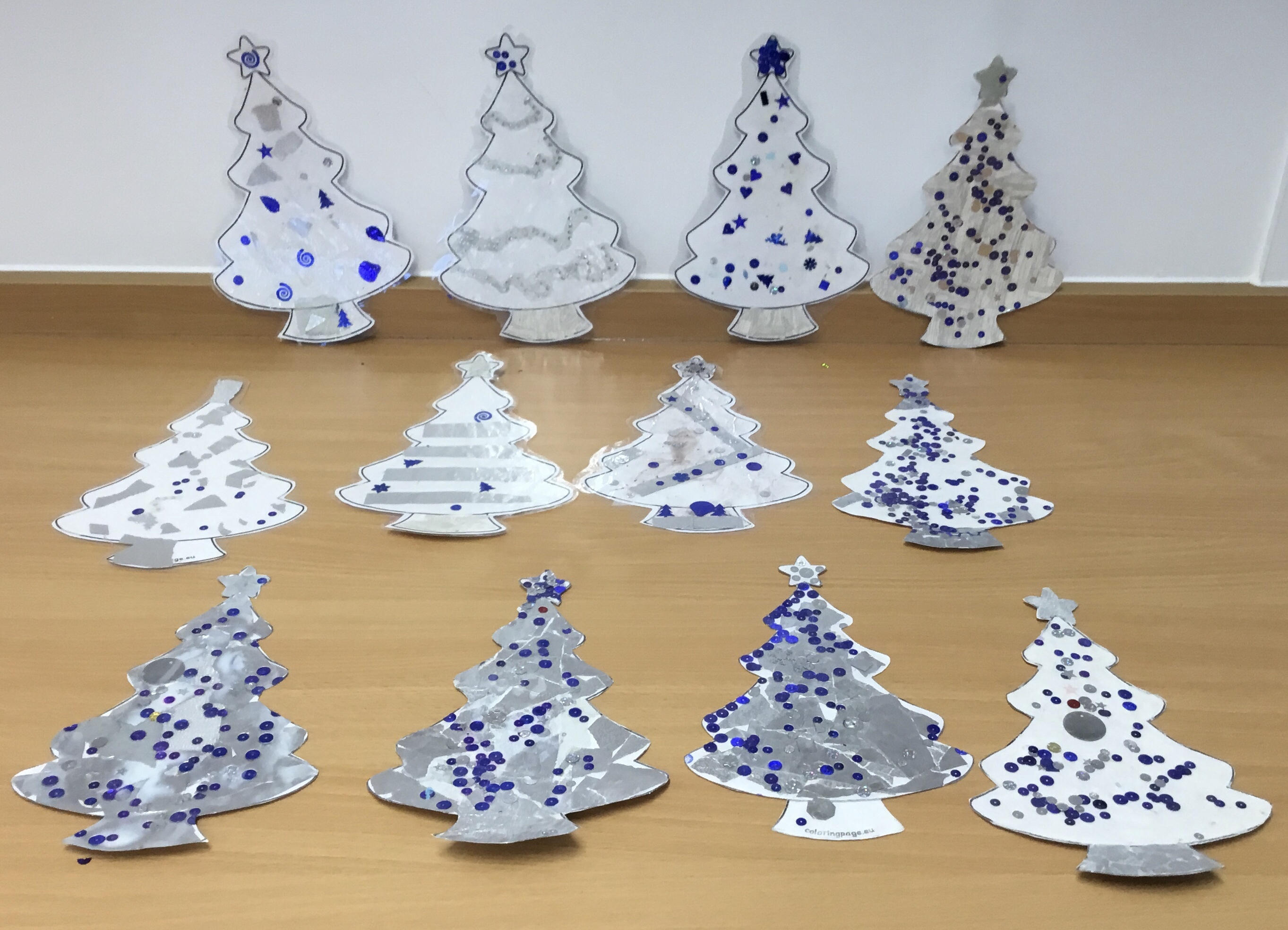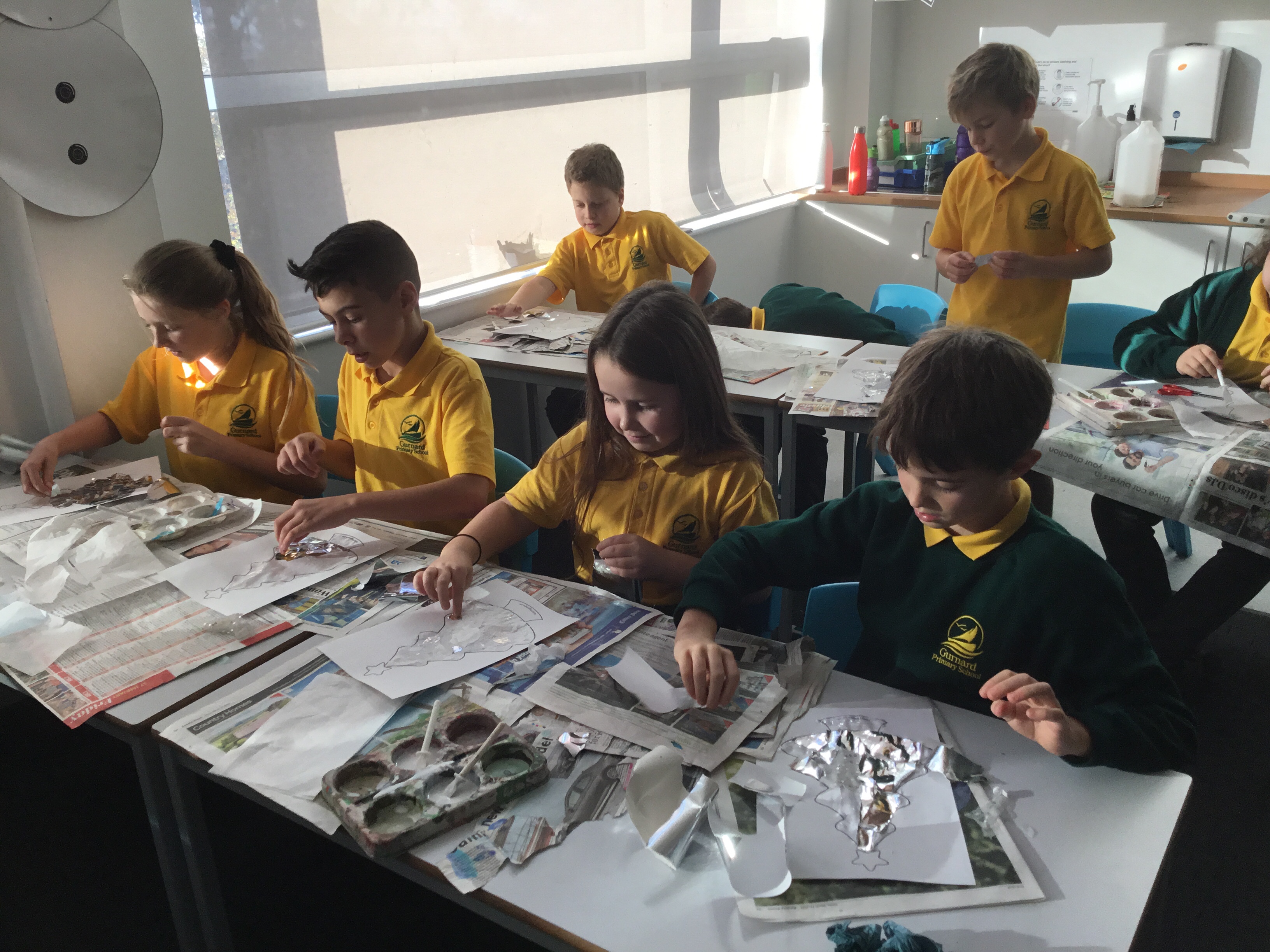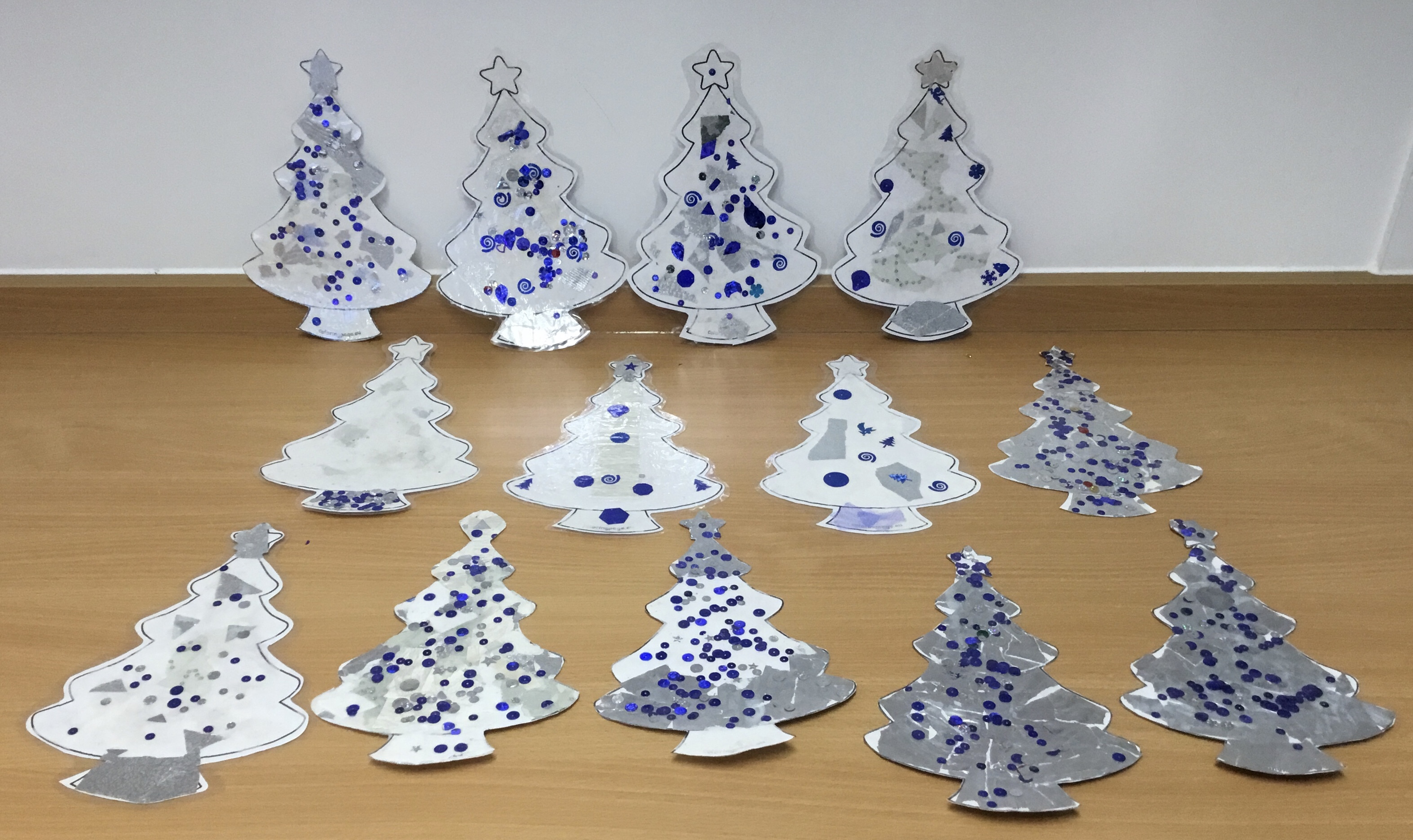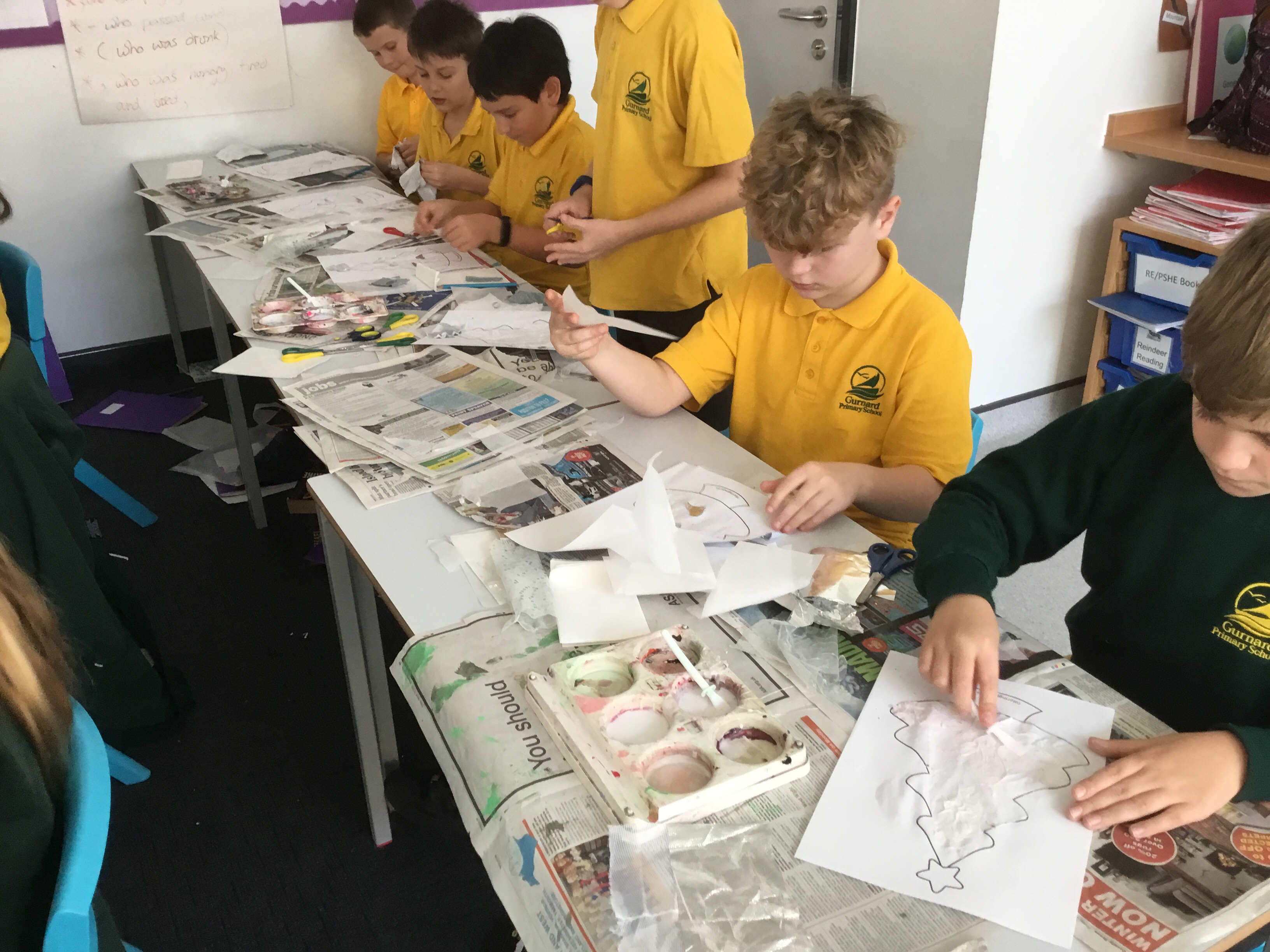 Year 5 created a Christmas tree collage using white tissue paper and silver paper and fabric. They then embellished their trees with silver and blue sparkles. The trees will be adding a splash of colour to the COVID testing centre in Newport.