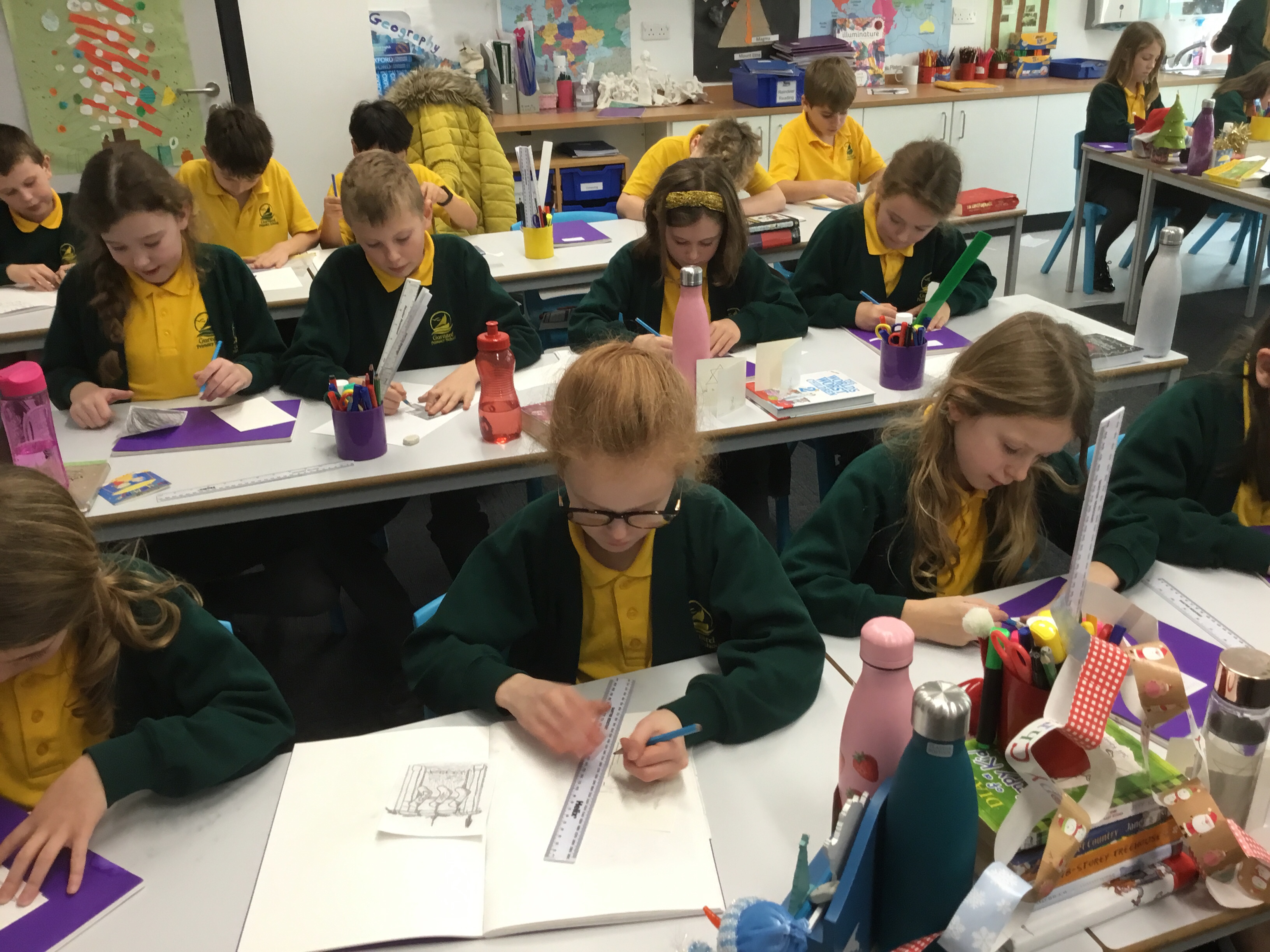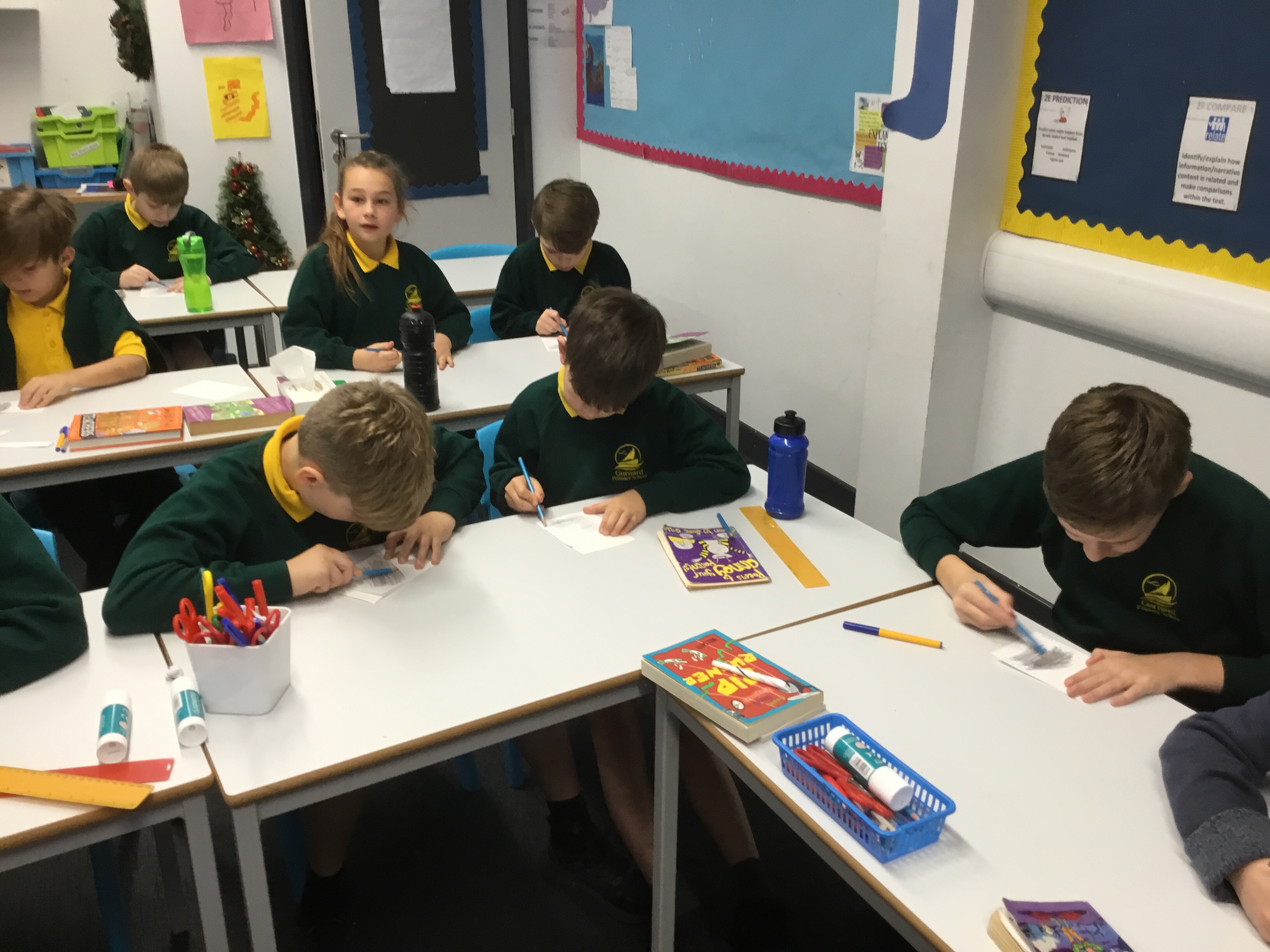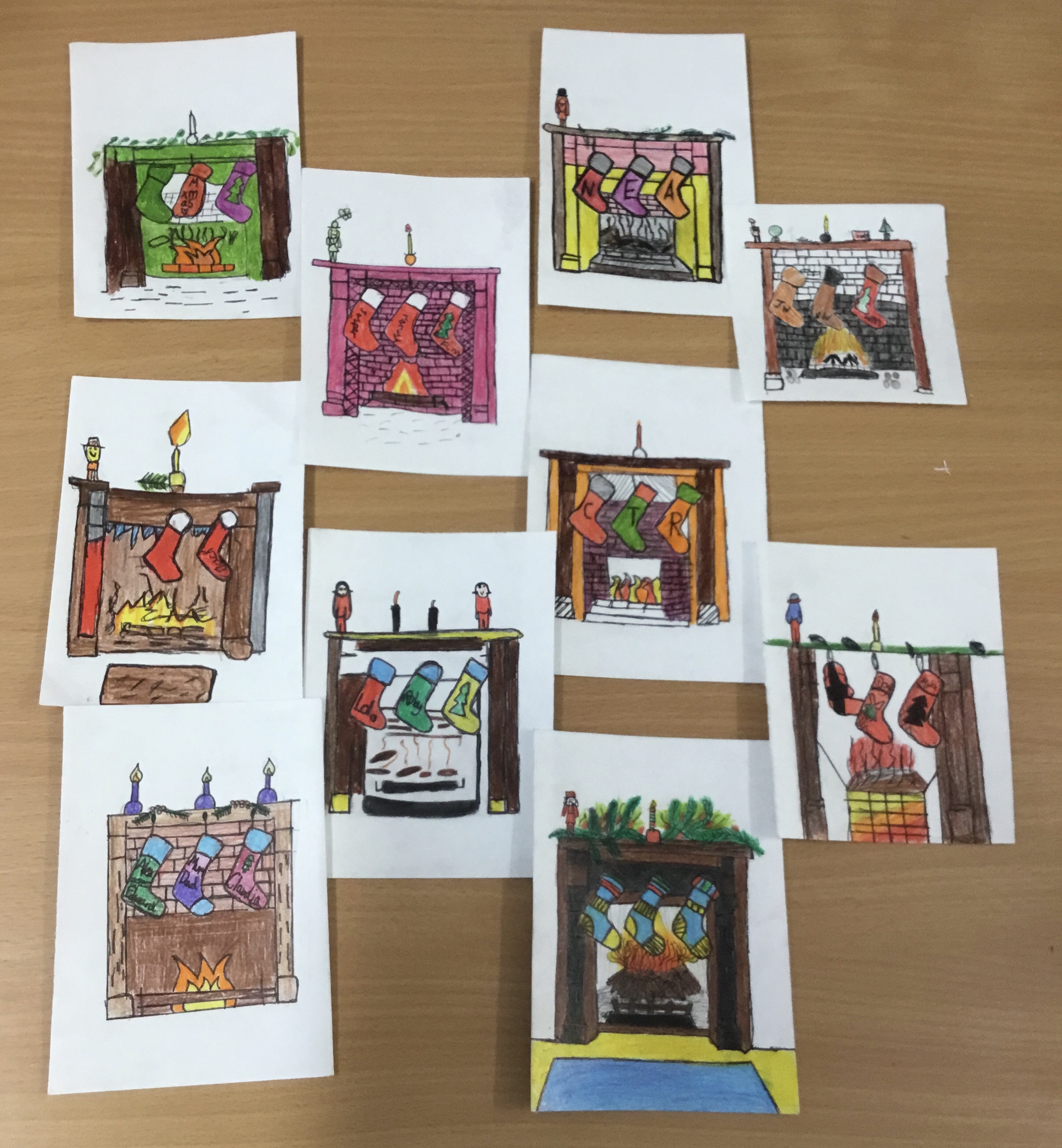 Year 5, learnt how to transfer an image of a fireplace scene onto another piece of paper. They then outlined their transfer and coloured it in. Some children chose to design their own picture. These images will be copied onto card, making a special Christmas card to take home.