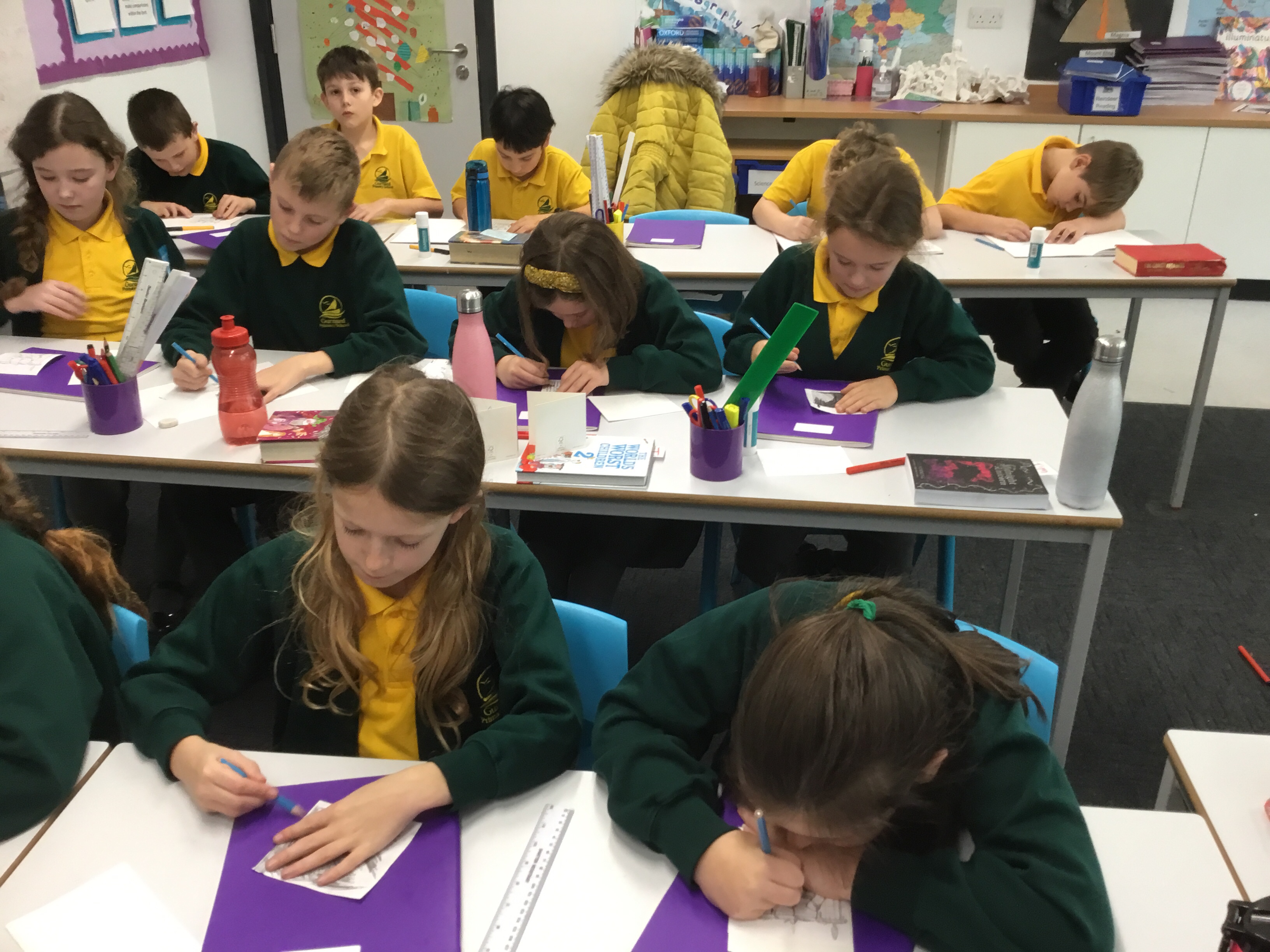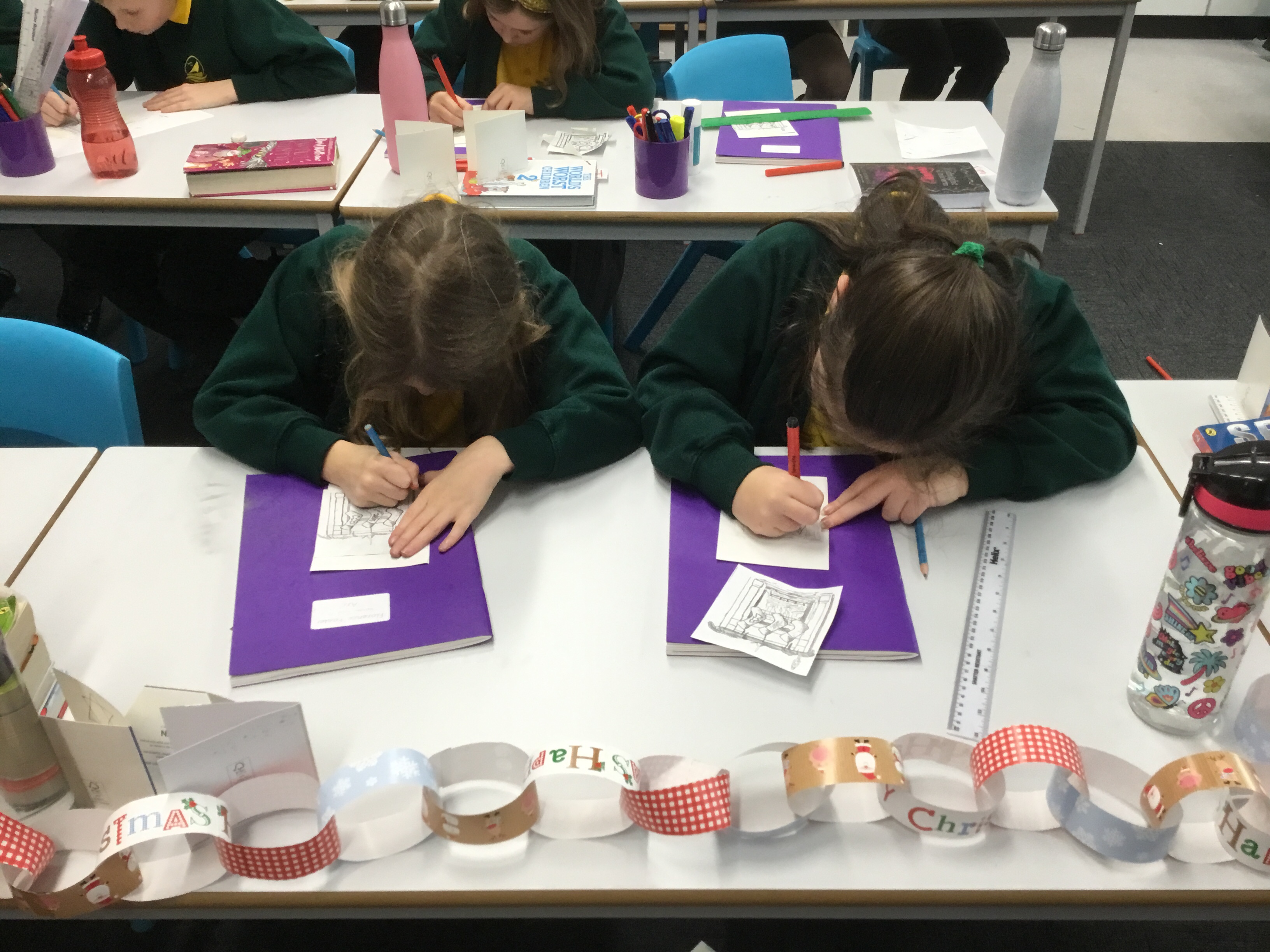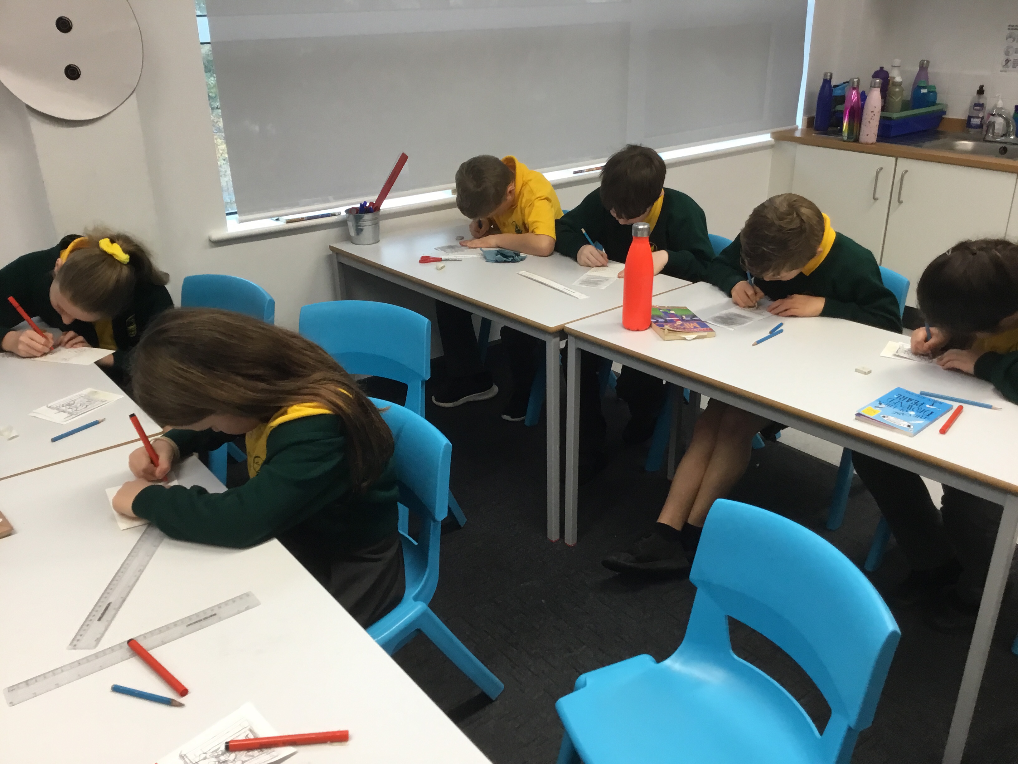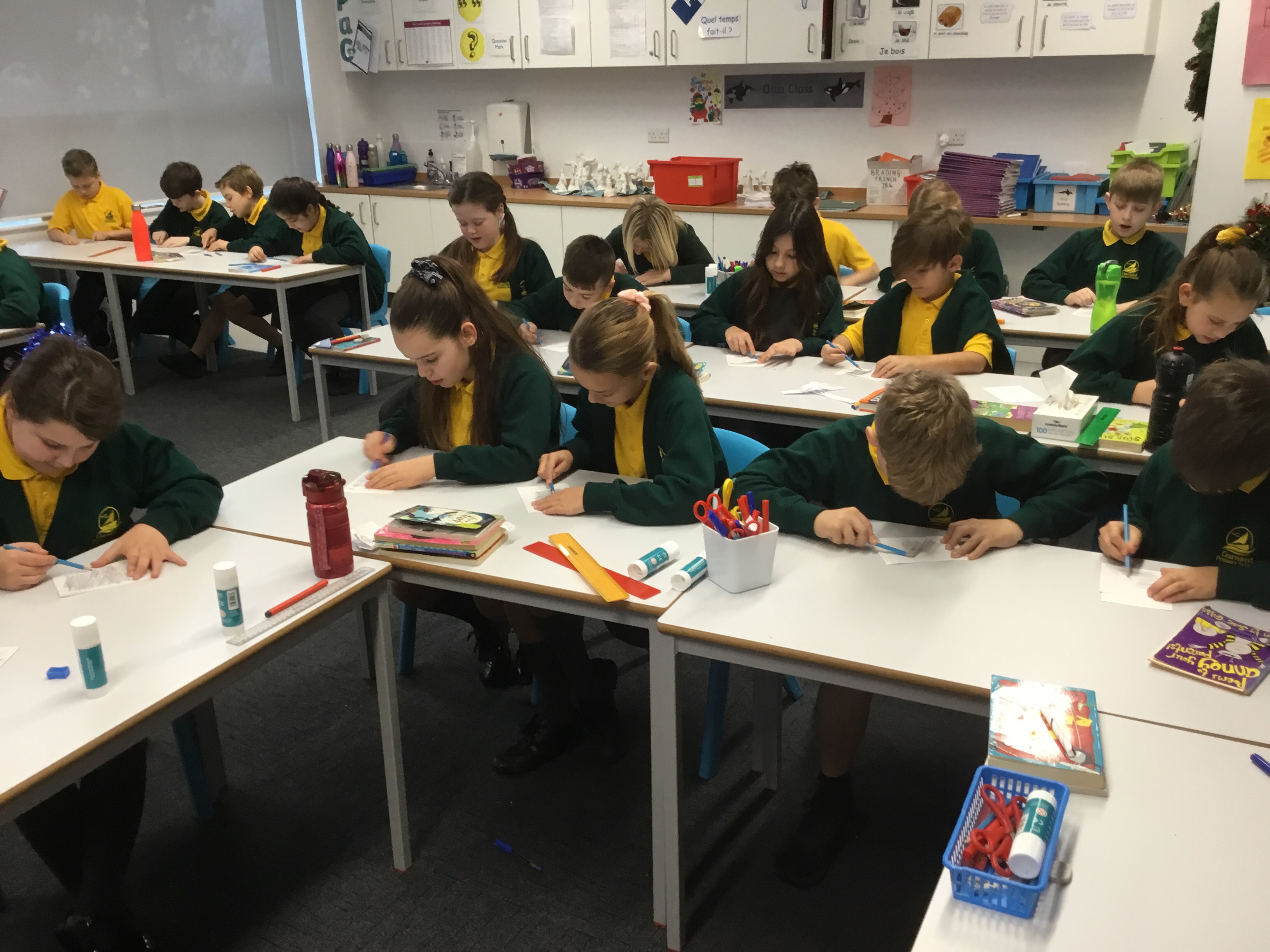 Year 5, learnt how to transfer an image of a fireplace scene onto another piece of paper. They then outlined their transfer and coloured it in. Some children chose to design their own picture. These images will be copied onto card, making a special Christmas card to take home.