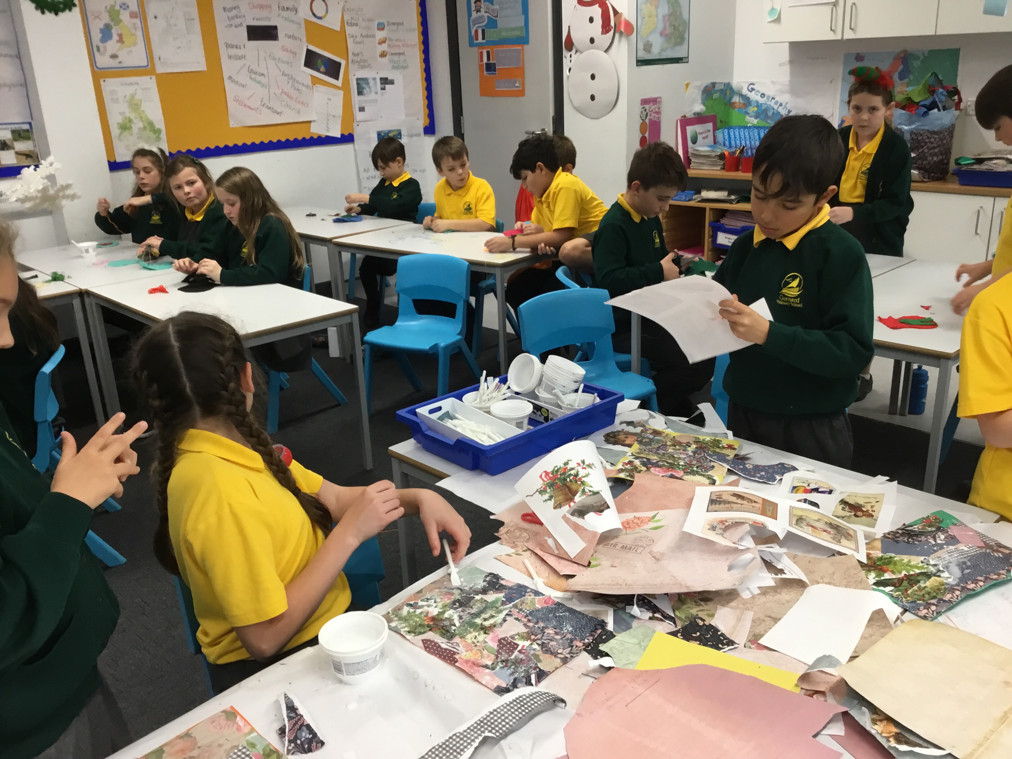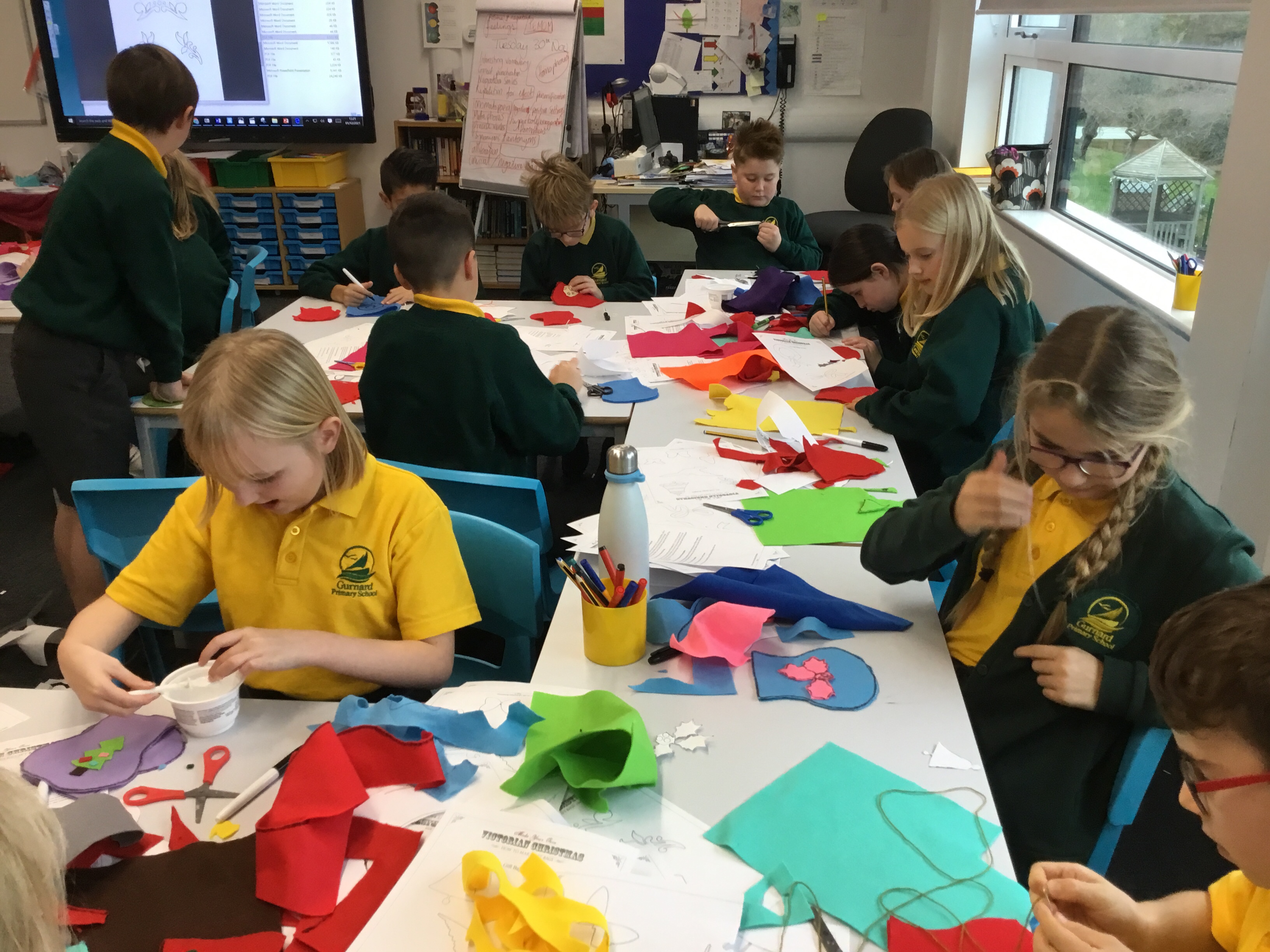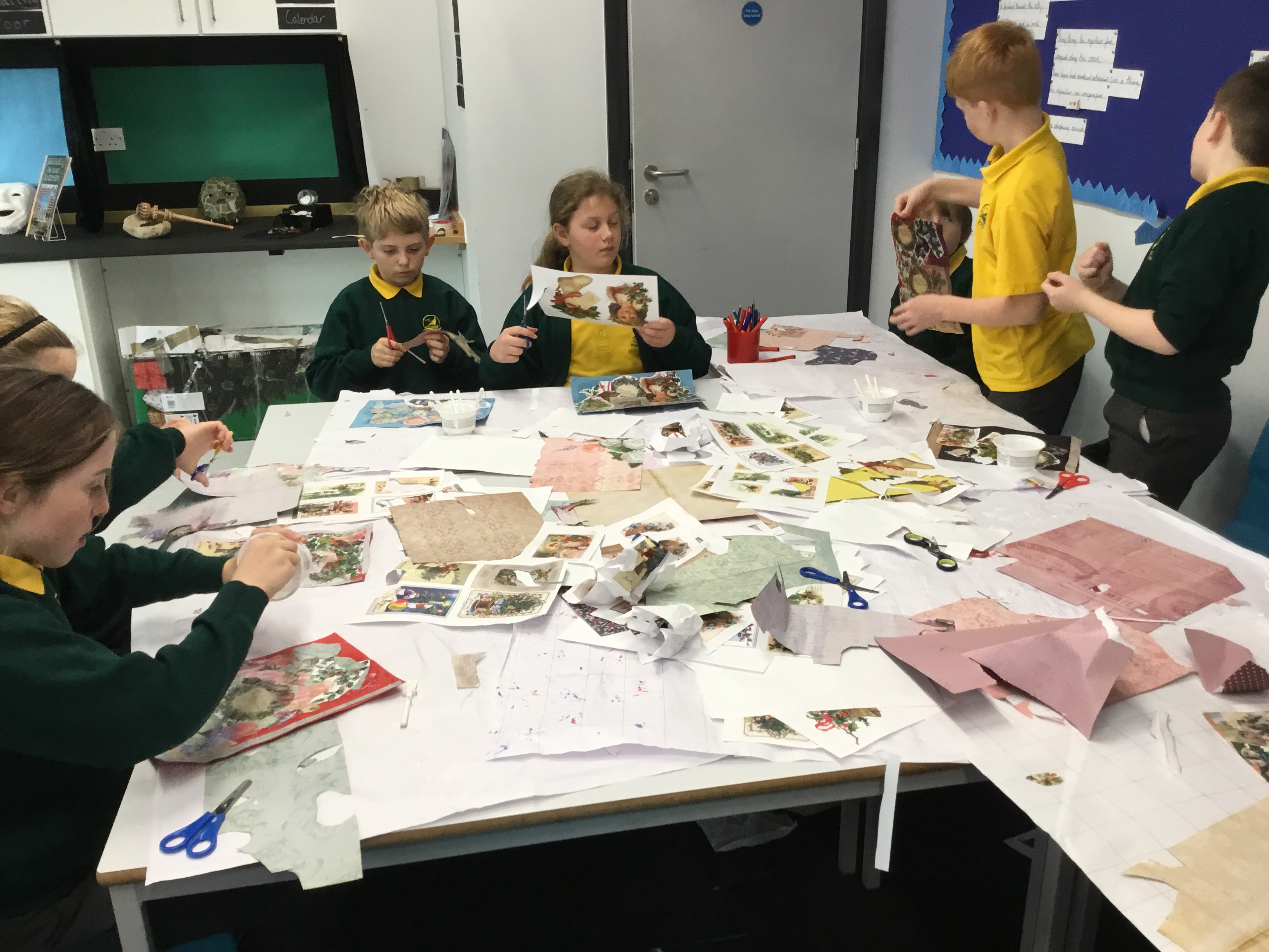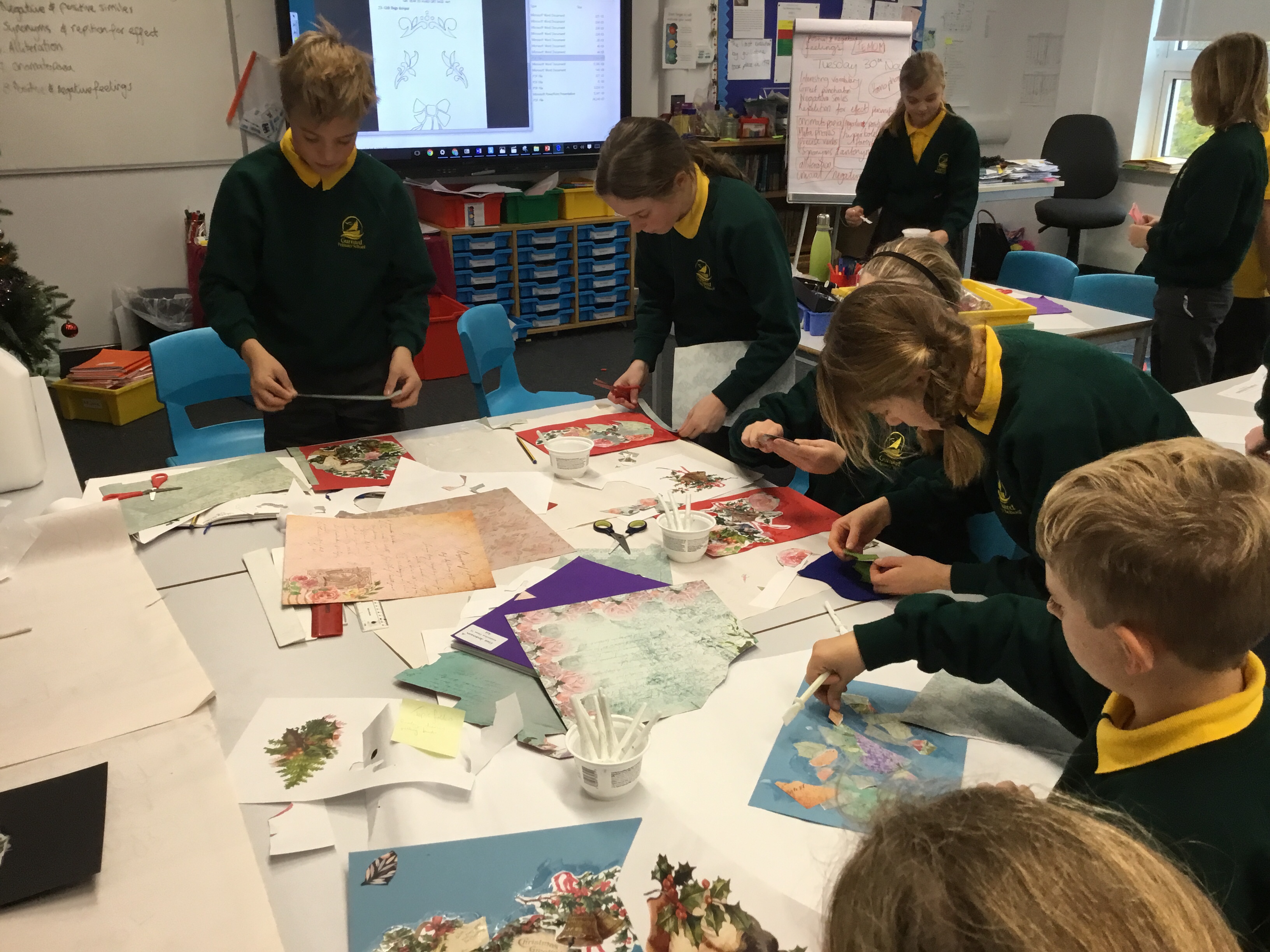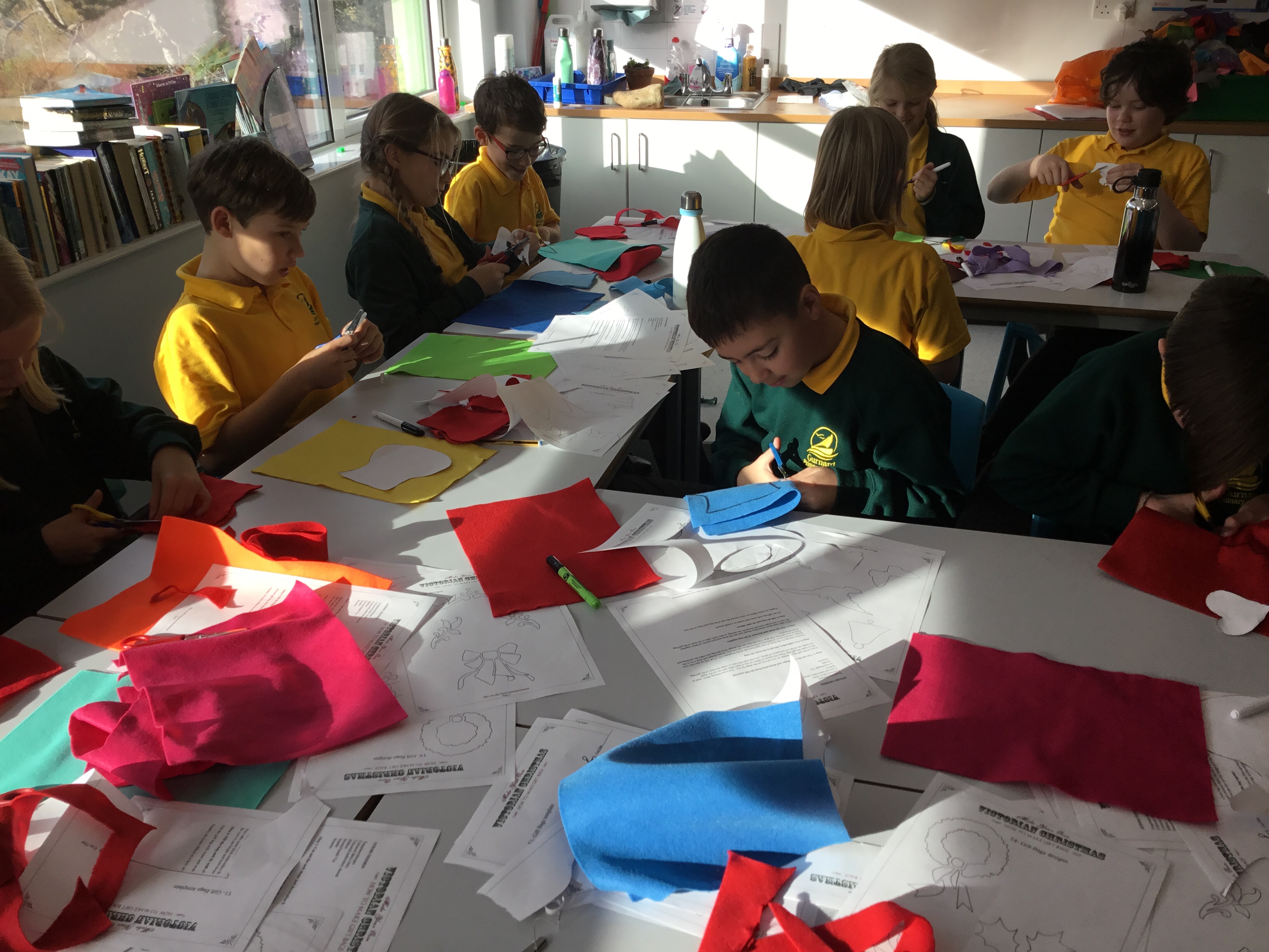 Year 5 started their Victorian gift creations. Some children started choosing card and designs to decoupage a design to make the cover of a scrapbook. The other group of children, cut out gift bag templates. they then used the template to cut out their felt gift bag. They also chose a pattern as decoration and cut that out too.