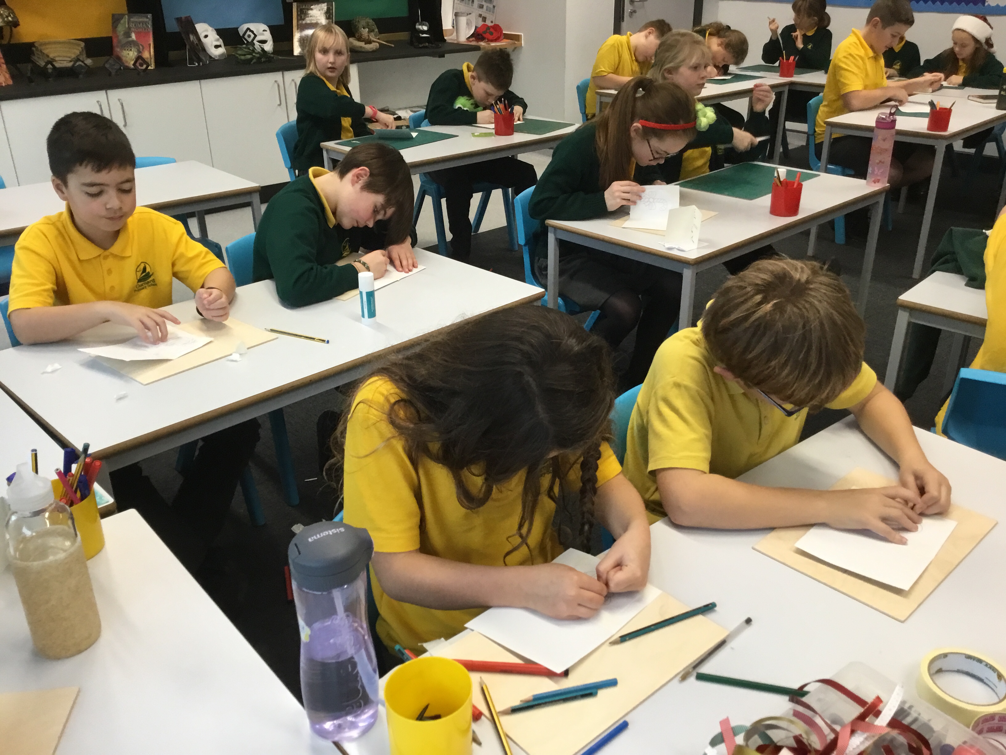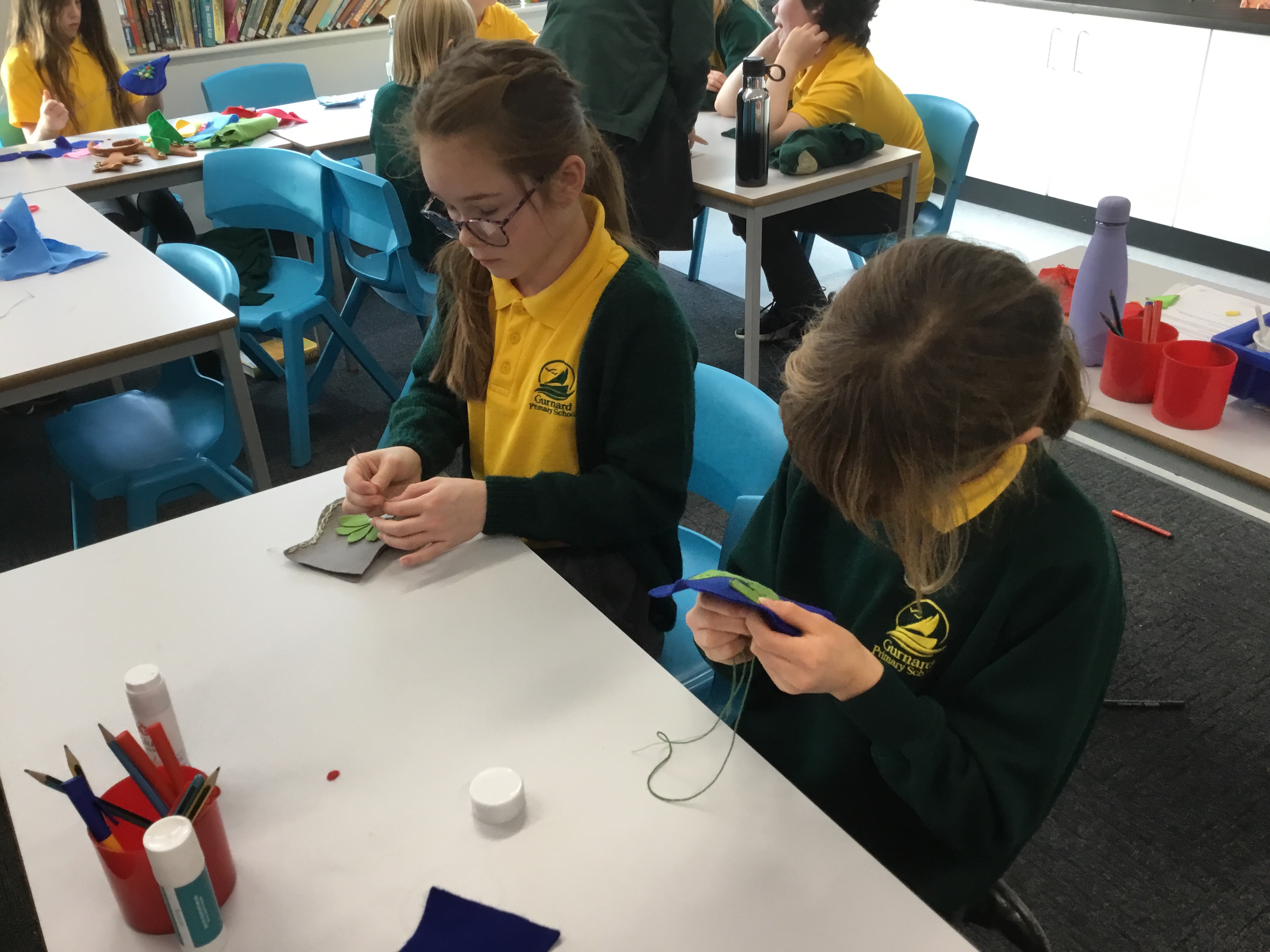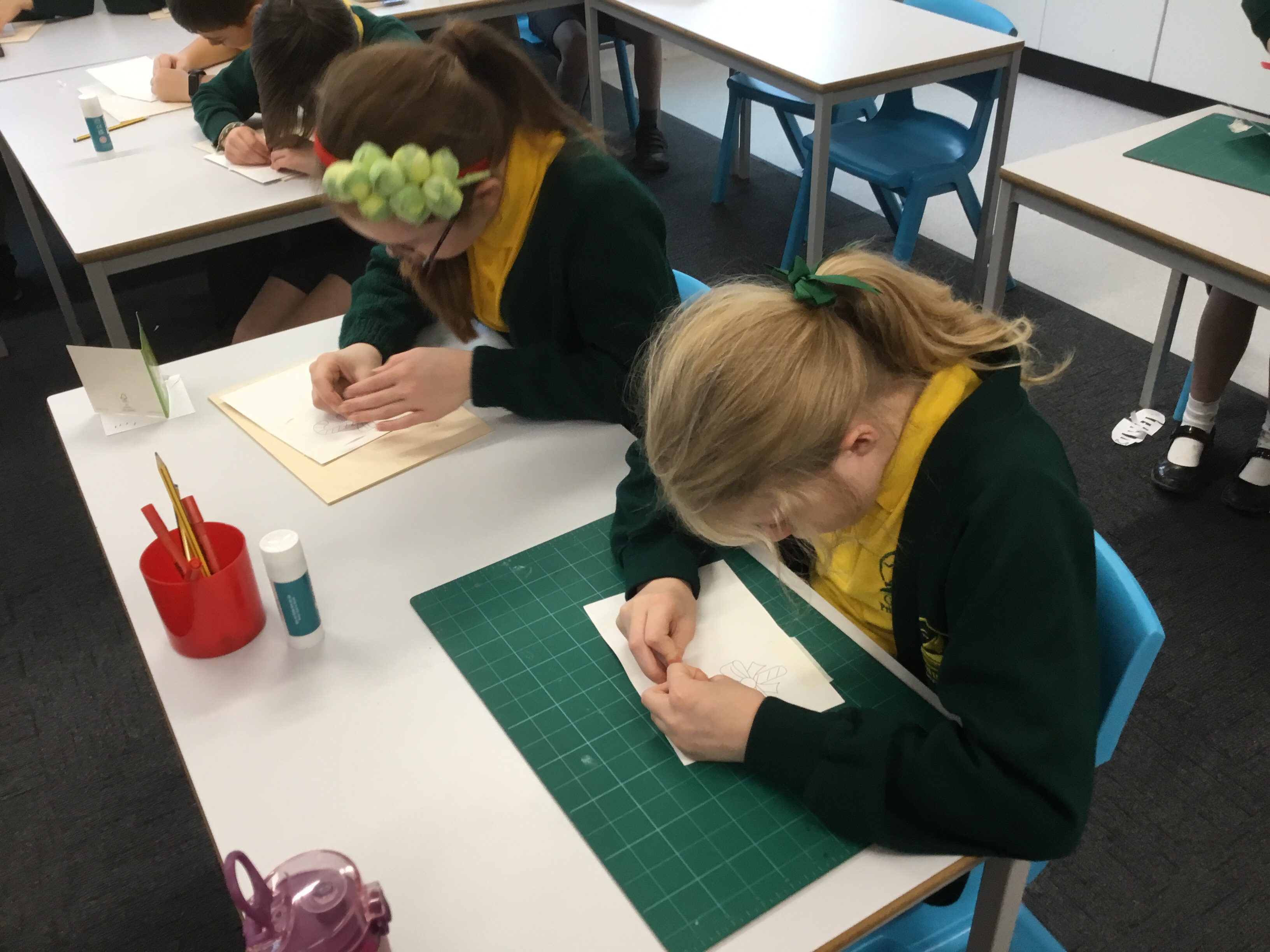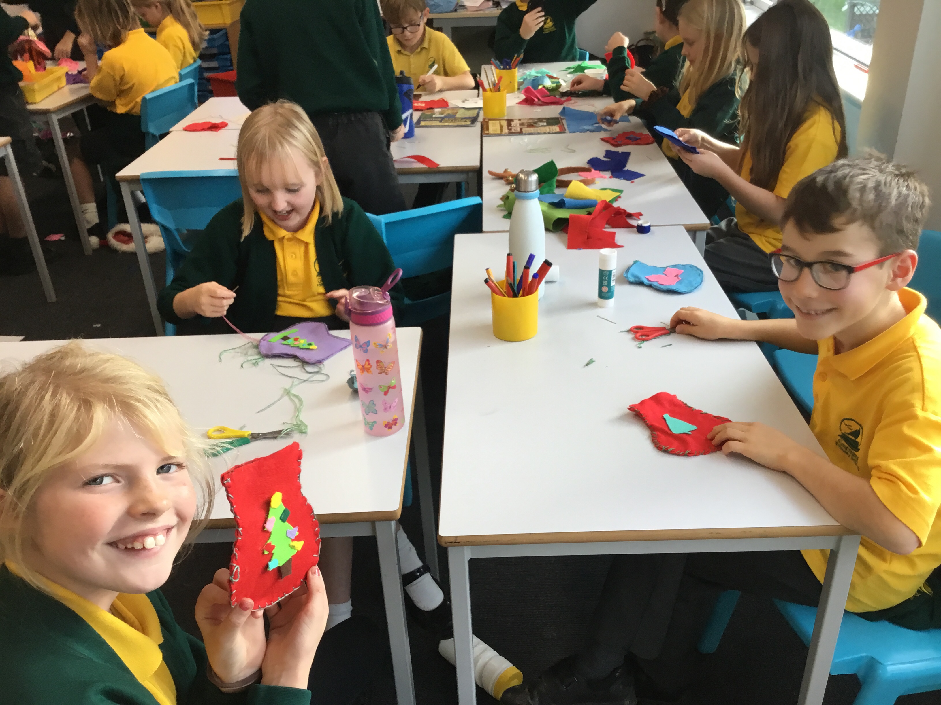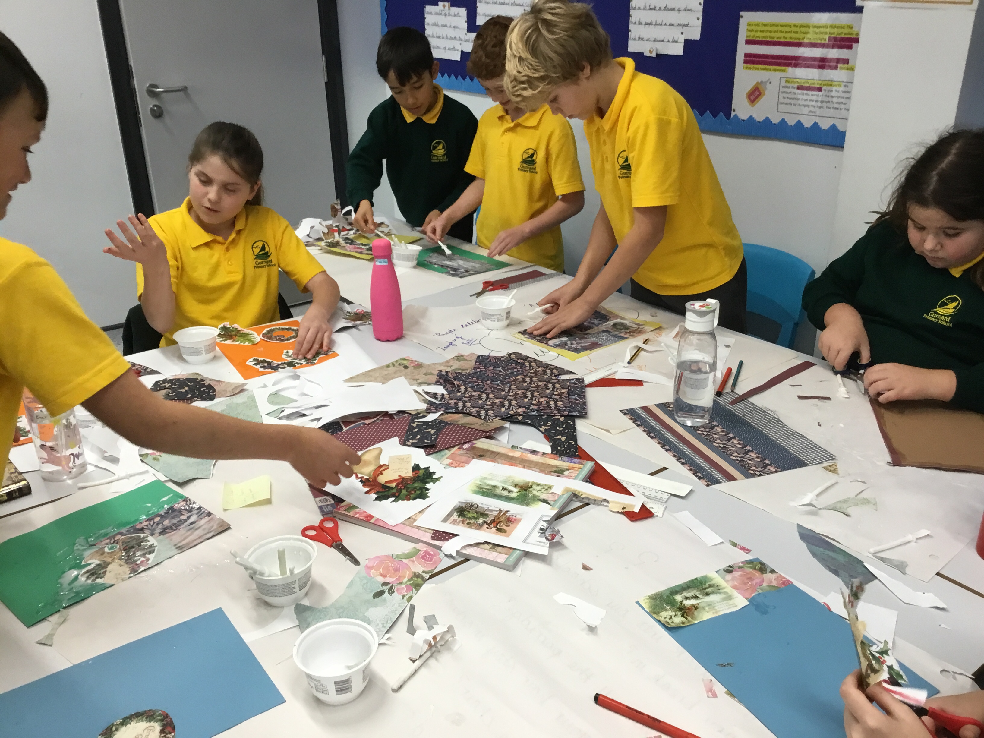 Year 5 started their Victorian gift creations. Some children started choosing card and designs to decoupage a design to make the cover of a scrapbook. The other group of children, cut out gift bag templates. they then used the template to cut out their felt gift bag. They also chose a pattern as decoration and cut that out too.