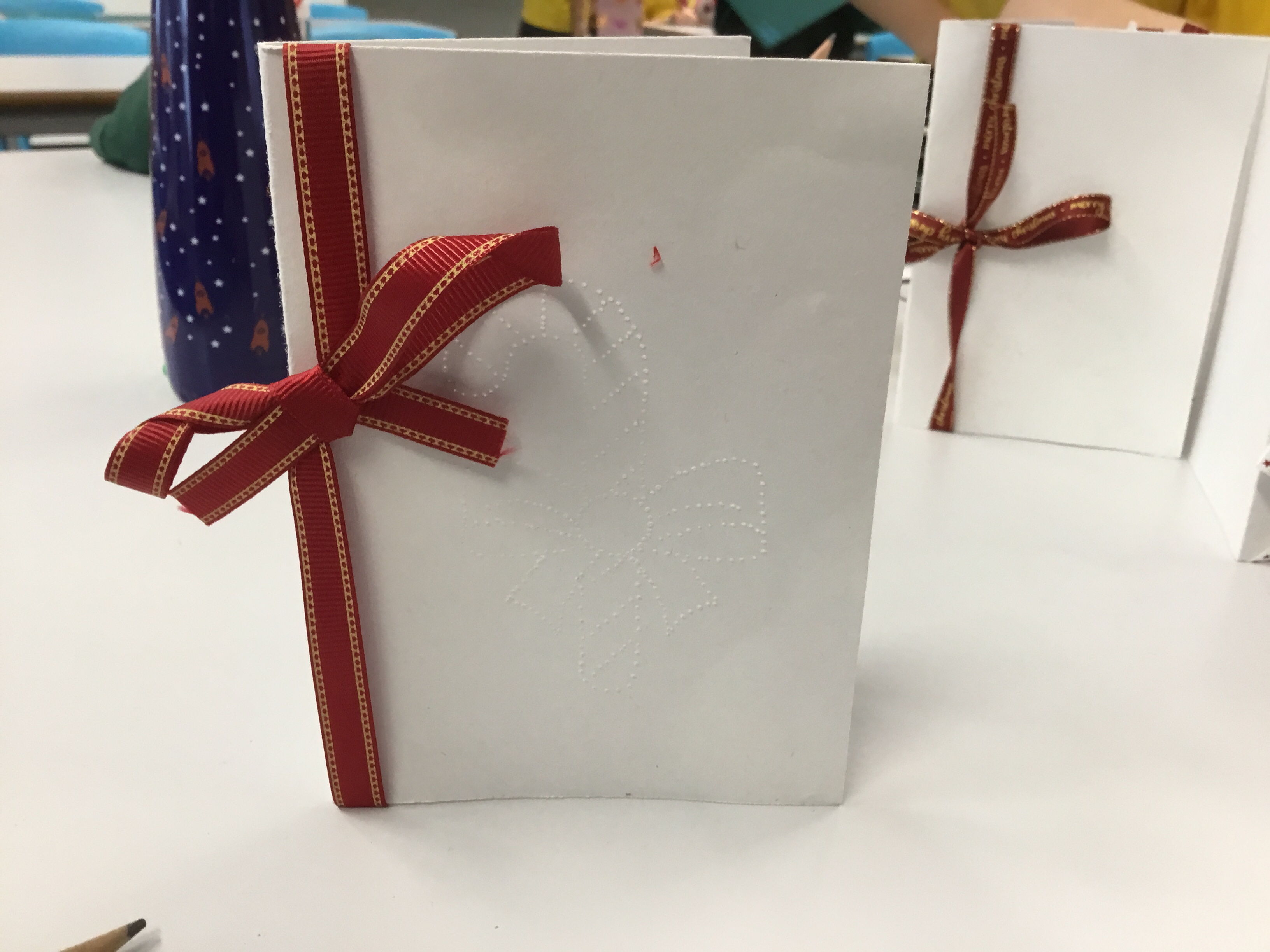 To finish off the Victorian Christmas work that we have been doing over the last few weeks, the children created their own Victorian Pin – prick Christmas cards. They chose their design, folded card in half and using a drawing pin and template followed along the outline. They then finished it off with a ribbon. They are very effective, especially if held up to the light.